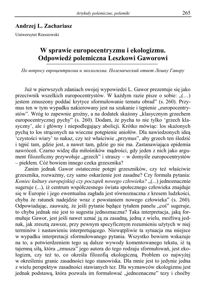 Artykuły polemiczne, polemiki 265 Andrzej L. Zachariasz Uniwersytet Rzeszowski W sprawie europocentryzmu i ekologizmu. Odpowiedź polemiczna Leszkowi Gaworowi По вопросу евроцентризма и экологизма. Полемический ответ Лешку Гавору Już w pierwszych zdaniach swojej wypowiedzi L. Gawor prezentuje się jako przeciwnik wszelkich europocentrystów. W każdym razie pisze o sobie: „(…) jestem zmuszony poddać krytyce sformułowanie tematu obrad” (s. 260). Przymus ten w tym wypadku nakierowany jest na szukanie i tępienie „europocentrystów”. Wróg to zapewnie groźny, a na dodatek skażony „klasycznym grzechem europocentrycznej pychy” (s. 260). Dodam, że pycha to nie tylko ‘grzech klasyczny’, ale i główny i niepodlegający abolicji. Krótko mówiąc: los skażonych pychą to los strąconych na wieczne potępienie aniołów. Dla nawiedzonych ideą ‘czystości wiary’ to nakaz, czy też właściwie „przymus”, aby grzech ten śledzić i tępić tam, gdzie jest, a nawet tam, gdzie go nie ma. Zastanawiająca epidemia nawróceń. Czarno widzę dla miłośników mądrości, gdy jeden z nich jako argument filozoficzny przywołuje „grzech” i straszy – w domyśle europocentrystów – piekłem. Cóż bowiem innego czeka grzesznika? Zanim jednak Gawor ostatecznie potępi grzeszników, czy też właściwie grzesznika, rozważmy, czy samo oskarżenie jest zasadne? Czy formuła pytania: Koniec kultury europejskiej czy początek nowego człowieka? „(...) jednoznacznie sugeruje (...), iż centrum współczesnego świata społecznego człowieka znajduje się w Europie i jego ewentualna zagłada jest równoznaczna z kresem ludzkości, chyba że ratunek nadejdzie wraz z powstaniem nowego człowieka” (s. 260). Odpowiadając, zauważę, że jeśli pytanie będące tytułem panelu „coś” sugeruje, to chyba jednak nie jest to sugestia jednoznaczna? Taka interpretacja, jaką formułuje Gawor, jest jeśli nawet uznać ją za zasadną, jedną z wielu, możliwą jednak, jak zresztą zawsze, przy pewnym specyficznym rozumieniu użytych w niej terminów i nastawieniu interpretującego. Niewątpliwie ta sytuacja ma miejsce w wypadku interpretacji sformułowanego pytania. Wszystko bowiem wskazuje na to, a potwierdzeniem tego są dalsze wywody komentowanego tekstu, iż tą tajemną siłą, która „zmusza” jego autora do tego rodzaju sformułowań, jest ekologizm, czy też to, co określa filozofią ekologiczną. Problem co najwyżej w określeniu granic zasadności tego stanowiska. Dla mnie jest to jedynie jedna z wielu perspektyw zasadności stawianych tez. Dla wyznawców ekologizmu jest jednak podstawą, która pozwala im formułować „jednoznaczne” tezy i choćby 266 Полемические статьи, полемики dla przykładu takich europocentrystów jako „klasycznych grzeszników” strącać w czeluści piekielne. Przechodząc do sedna, czyli do zarzucanego europocentryzmu: czy ze zwrotu „koniec kultury europejskiej (…)” wynika europocentyzm? Raczej widziałbym w tym stwierdzeniu wyraz zapowiedzi marginalizacji kultury europejskiej wobec innych kultur, choć bynajmniej nie ich końca. W sformułowaniu tym nie ma przecież nic o końcu kultury hinduskiej, chińskiej czy nawet kultur obu Ameryk. Jaką „zagładę” i jaki „kres ludzkości” dostrzega Gawor w temacie obrad? Na marginesie dodam, iż mam nadzieję, że Gawor jest świadomy tego, że upadek jakiejkolwiek pojedynczej kultury, nawet jeśli byłyby to bardziej liczne kultury niż europejska, a więc chińska czy hinduska, nie musi oznaczać jeszcze kresu ludzkości. Formułowanie tak radykalnych sądów nie znajduje uzasadnienia zarówno w zasadach logicznego wynikania, jak i regułach wnioskowania. Nie znajduje także potwierdzenia w dziejach rodzaju ludzkiego. Wszak poszczególne kultury upadały, ale przecież ludzkość póki co jeszcze trwa. Nie będę przytaczał przykładów, bo specjalista od cywilizacji powinien o tym wiedzieć. Imputowanie tak naiwnych, a nawet niedorzecznych poglądów – których przykładem jest twierdzenie, że upadek kultury europejskiej oznacza kres ludzkości – może wskazywać, w wypadku formułującego takie wypowiedzi, na nadmiernie rozbujałą zdolność do konfabulacji. Trudno bowiem byłoby mi wykazywać autorowi poważne braki w jego wiedzy historycznej bądź też formułować wątpliwości co do jego umiejętności rozumienia tekstów i zdolności prawidłowego rozumowania. Imputowanie komuś poglądów, których ten nie głosi, oznacza po prostu brak dobrych obyczajów w nauce. Sytuacja ta stawia pod znakiem zapytania także i inne wypowiedzi autora formułującego tego rodzaju sądy. Dalsza część wywodów Gawora potwierdza jego dotychczasowy sposób formułowania zarzutów. Z drugiej części sformułowanego tematu dyskusji Okrągłego Stołu, a mianowicie „(…) czy początek nowego człowieka?”, wywodzi on, że pytanie to implikuje, a tym samym, że jego autorzy twierdzą, iż: „(…) ratunek [chyba dla ludzkości – ALZ] nadejdzie wraz z powstaniem nowego człowieka” (s. 260). Takie twierdzenie można by formułować, gdyby z pierwszej części przedmiotowego pytania wynikał „kres ludzkości”. Wtedy taki ratunek zapewne byłby potrzebny. Trzymając się jednak ram tytułowego pytania, można by co najwyżej mówić o ratunku dla „upadającej” kultury europejskiej. Jednakże z idei tzw. „początku nowego człowieka” nie musi bynajmniej wynikać „ratunek dla kultury europejskiej”, czyli tej kultury w jej „dotychczasowym kształcie”. Aby mówić o jej ratunku, w pierwszej kolejności należałoby odpowiedzieć sobie na pytanie: czy tę kulturę warto jeszcze ratować? A jeśli tak, to w jakich jej wymiarach i dlaczego? Tzw. „nowy człowiek” równie dobrze, tak jak to widział choćby F. Nietzsche, gdy mówił o nadczłowieku, może oznaczać przew