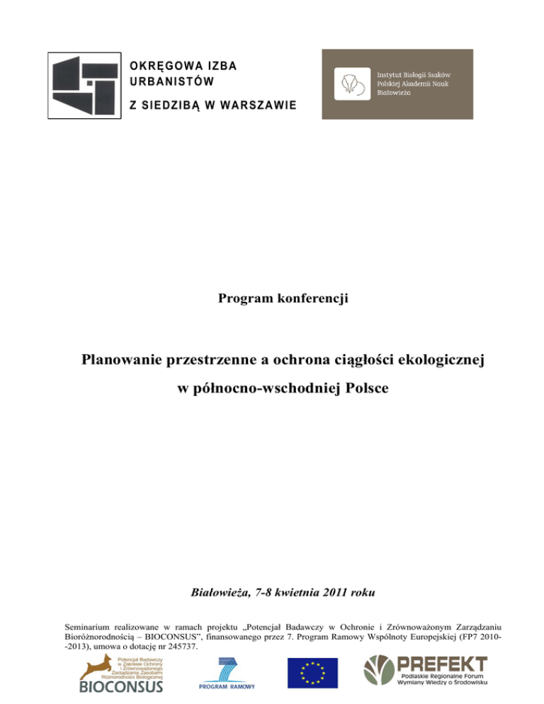 OKR ĘG O W A I Z B A URBANISTÓW Z S I E D Z I BĄ W W A R S Z A W I E Program konferencji Planowanie przestrzenne a ochrona ciągłości ekologicznej w północno-wschodniej Polsce Białowieża, 7-8 kwietnia 2011 roku Seminarium realizowane w ramach projektu „Potencjał Badawczy w Ochronie i Zrównoważonym Zarządzaniu Bioróżnorodnością – BIOCONSUS”, finansowanego przez 7. Program Ramowy Wspólnoty Europejskiej (FP7 2010-2013), umowa o dotację nr 245737. Czwartek, 7 kwietnia 2011 r. 9:00-10:00 Rejestracja uczestników 10:00-10:15 Otwarcie konferencji – dr hab. Andrzej Zalewski, Dyrektor Instytutu Biologii Ssaków Polskiej Akademii Nauk, Białowieża, mgr inż. arch. Alicja Mieszkowska, Zastępca Przewodniczącego Rady Okręgowej Izby Urbanistów z siedzibą w Warszawie 10:15-10:30 Prezentacja projektu BIOCONSUS i idei Podlaskiego Regionalnego Forum Wymiany Wiedzy o Środowisku (PREFEKT) – mgr inż. Dorota Ławreszuk, Instytut Biologii Ssaków Polskiej Akademii Nauk, Białowieża 10:30-11:00 Ekologiczne skutki fragmentacji środowiska – prof. dr hab. Bogumiła Jędrzejewska, Instytutu Biologii Ssaków Polskiej Akademii Nauk, Białowieża 11:00-11:40 Prognozy oddziaływania na środowisko dotyczące projektów studiów oraz miejscowych planów zagospodarowania przestrzennego – dr inż. Lech Magrel, Regionalny Dyrektor Ochrony Środowiska w Białymstoku 11:40-12:10 PRZERWA NA KAWĘ 12:10-12:40 Sieć transportowa w województwie podlaskim – obecny stan oraz plany rozwoju – mgr inż. Jerzy Doroszkiewicz, Dyrektor Generalnej Dyrekcji Dróg Krajowych i Autostrad, Oddział Białystok 12:40-13:10 Plan ochrony i plany miejscowe w świetle zmieniających się przepisów na przykładzie Łomżyńskiego Parku Krajobrazowego Doliny Narwi - mgr inż. arch. Alicja Mieszkowska, Podlaskie Biuro Planowania Przestrzennego w Białymstoku 13:10-13:50 Projekt sieci korytarzy ekologicznych zrealizowany w ramach projektu LIFE Kraina Żubra - mgr Marcin Górny, Instytutu Biologii Ssaków Polskiej Akademii Nauk, Białowieża, mgr inż. Ryszard Serwatka, Podlaskie Biuro Planowania Przestrzennego, Łomża 13:50-14:40 PRZERWA NA OBIAD 14:40-16:30 Wizyta w muzeum przyrodniczym Białowieskiego Parku Narodowego 16:30-17:00 Procesy urbanizacyjne, a korytarze ekologiczne w aglomeracji miejskiej na przykładzie miasta Lublina - mgr inż. arch. Elżbieta Kraszewska, Urząd Miasta, Lublin 17:00-17:40 Kierunki projektowanych zmian w ustawie o planowaniu i zagospodarowaniu przestrzennym – mgr inż. arch. Krystyna Łazutka, Ministerstwo Infrastruktury, Departament Gospodarki Przestrzennej, Warszawa 17:40-18:00 Lasy prywatne wokół aglomeracji a planowanie przestrzenne – mgr Jolanta Den, Wicestarosta Powiatu Białostockiego, Białystok 18:00-18:30 Pytania i dyskusja 19:30 UROCZYSTA KOLACJA HOTEL BIAŁOWIESKI Seminarium realizowane w ramach projektu „Potencjał Badawczy w Ochronie i Zrównoważonym Zarządzaniu Bioróżnorodnością – BIOCONSUS”, finansowanego przez 7. Program Ramowy Wspólnoty Europejskiej (FP7 2010-2013), umowa o dotację nr 245737. Piątek, 8 kwietnia 2011 r. 9:00-9:30 Hałas drogowy w otoczeniu tras komunikacyjnych – dr hab. inż. Władysław Gardziejczyk Politechnika Białostocka, Białystok 9:30-10:00 Ocena oddziaływania oraz środki łagodzące negatywny wpływ inwestycji na duże ssaki drapieżne – dr inż. Robert Mysłajek, Stowarzyszenie dla Natury „Wilk”, Twardorzeczka 10:00-10:40 Studium zagospodarowania przestrzennego strefy przygranicznej województw pomorskiego, warmińsko-mazurskiego i podlaskiego – ochrona ciągłości ekologicznej – mgr inż. Teresa Szarejko 10:40-11:00 PRZERWA NA KAWĘ 11:00-11:30 Czy obecny system planowania przestrzennego na szczeblu gminnym może być skutecznym narzędziem ochrony korytarzy ekologicznych? – mgr Jacek Skorupski 11:30-12:00 Dyskusja panelowa - mgr inż. arch. Jolanta Przygońska, Przewodnicząca Rady Okręgowej Izby Urbanistów z siedzibą w Warszawie 12:00-12:15 Podsumowanie i wnioski 13:00-14:00 OBIAD HOTEL BIAŁOWIESKI Seminarium realizowane w ramach projektu „Potencjał Badawczy w Ochronie i Zrównoważonym Zarządzaniu Bioróżnorodnością – BIOCONSUS”, finansowanego przez 7. Program Ramowy Wspólnoty Europejskiej (FP7 2010-2013), umowa o dotację nr 245737.