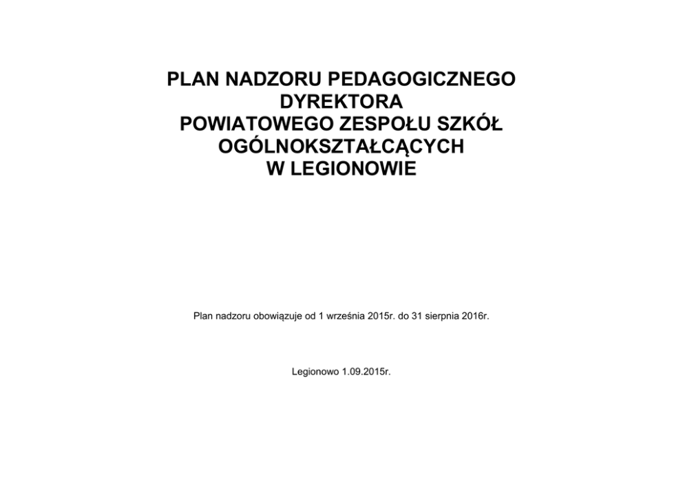 PLAN NADZORU PEDAGOGICZNEGO DYREKTORA POWIATOWEGO ZESPOŁU SZKÓŁ OGÓLNOKSZTAŁCĄCYCH W LEGIONOWIE Plan nadzoru obowiązuje od 1 września 2015r. do 31 sierpnia 2016r. Legionowo 1.09.2015r. ROCZNY PLAN NADZORU DYREKTORA POWIATOWEGO ZESPOŁU SZKÓŁ OGÓLNOKSZTAŁCACYCH W LEGIONOWIE NA ROK SZKOLNY 2015/16 Podstawa prawna: Art.35 ust.4 ustawy z dnia 7 września 1991 r. o systemie oświaty (Dz. U. z 2004 r. Nr 256, poz. 2572 ze zm.) Rozporządzenie MEN z dnia 12 sierpnia 2015 r. w sprawie nadzoru pedagogicznego (Dz. U. z 2015 r., poz. 1270) Rozporządzenie MEN z dnia 6 sierpnia 2015 r. w sprawie wymagań wobec szkół i placówek. (Dz. U. z 2015 r., poz. 1214) Plan nadzoru uwzględnia (źródła informacji): 1. Plan nadzoru pedagogicznego Mazowieckiego Kuratora Oświaty na rok szkolny 2015/2016 2. Wnioski Mazowieckiego Kuratora Oświaty z nadzoru pedagogicznego za rok szkolny 2014/2015. 3. Wnioski dyrektora szkoły z nadzoru pedagogicznego i planu pracy szkoły za rok szkolny 2014/2015 4. Podstawowe kierunki realizacji polityki oświatowej państwa w roku szkolnym 2015/2016. Plan nadzoru zawiera: przedmiot ewaluacji wewnętrznej oraz termin jej przeprowadzenia; tematykę kontroli planowanych w poszczególnych szkołach i placówkach; zakres wspomagania nauczycieli w realizacji ich zadań. ZADANIA DYREKTORA ZWIĄZANE Z NADZOREM PEDAGOGICZNYM: Dyrektor: ● przeprowadza ewaluację wewnętrzną i wykorzystuje jej wyniki do doskonalenia jakości pracy szkoły lub placówki; ● kontroluje przestrzeganie przez nauczycieli przepisów prawa dotyczących działalności dydaktycznej, wychowawczej i opiekuńczej oraz innej działalności statutowej szkół, placówek; ● wspomaga nauczycieli w realizacji ich zadań, w szczególności przez: - organizowanie szkoleń i narad, - motywowanie do doskonalenia i rozwoju zawodowego, - przedstawienie nauczycielom wniosków wynikających ze sprawowanego przez dyrektora szkoły lub placówki nadzoru pedagogicznego W celu realizacji w/w zadań dyrektor szkoły w szczególności obserwuje prowadzone przez nauczycieli zajęcia dydaktyczne, wychowawcze i opiekuńcze oraz inne zajęcia i czynności wynikające z działalności statutowej szkoły. I.PODSTAWOWE KIERUNKI POLITYKI OŚWIATOWEJ PAŃSTWA W ROKU SZKOLNYM 2015/16 PRIORYTETY MAZOWIECKIEGO KURATORA OŚWIATY 1. Wzmocnienie bezpieczeństwa dzieci i młodzieży, ze szczególnym uwzględnieniem dzieci ze specjalnymi potrzebami edukacyjnymi w młodzieżowych ośrodkach wychowawczych, młodzieżowych ośrodkach socjoterapii, specjalnych ośrodkach szkolno-wychowawczych, specjalnych ośrodkach wychowawczych i ośrodkach rewalidacyjno-wychowawczych. 2. Podniesienie jakości kształcenia w szkołach ponadgimnazjalnych poprzez zaangażowanie przedstawicieli partnerów społecznych w dostosowywanie kształcenia zawodowego do potrzeb rynku pracy. 3. Rozwijanie kompetencji czytelniczych oraz upowszechnianie czytelnictwa wśród dzieci i młodzieży. 4. Edukacja matematyczna i przyrodnicza w kształceniu ogólnym. Monitorowana będzie: W zakresie kontroli kontrolowane będą: w zakresie ewaluacji: w zakresie wymagań: 1.Realizacja zadań z zakresu doradztwa edukacyjnozawodowego w gimnazjum i liceum 1. Zgodność zatrudniania nauczycieli z wymaganymi kwalifikacjami (liceum-20, gimnazjum-10) ; 2. Zgodność z przepisami prawa przeprowadzania egzaminów klasyfikacyjnych ( w gimnazjum-78 i szkole ponadgimnazjalne-74) Ewaluacje całościowe (10% wszystkich ewaluacji w roku szkolnym: gimnazjum -8, liceum-7) Ewaluacje problemowe (60% wszystkich ewaluacji w roku szkolnym): Ewaluacje problemowe w zakresie wybranym przez kuratora oświaty na podstawie wniosków z nadzoru pedagogicznego: a) w gimnazjum , liceum : ▶Uczniowie nabywają wiadomości i umiejętności określone w podstawie programowej; ▶Szkoła wspomaga rozwój uczniów z uwzględnieniem ich indywidualnej sytuacji; ▶Szkoła organizując procesy edukacyjne, uwzględnia wnioski z analizy wyników sprawdzianu, egzaminu gimnazjalnego, egzaminu maturalnego oraz innych badań zewnętrznych i wewnętrznych (30% wszystkich ewaluacji w roku szkolnym— ▶Uczniowie nabywają wiadomości i umiejętności określone w podstawie programowej; ▶Szkoła wspomaga rozwój uczniów z uwzględnieniem ich indywidualnej sytuacji; ▶Szkoła organizując procesy edukacyjne, uwzględnia wnioski z analizy wyników sprawdzianu, egzaminu gimnazjalnego, egzaminu maturalnego oraz innych badań zewnętrznych i wewnętrznych liceum (31),gimnazjum (62) Ewaluacje problemowe w zakresie wybranym przez Mazowieckiego Kuratora Oświaty: ▶ Zarządzanie szkołą służy jej rozwojowi. ▶Kształtowane są postawy I respektowane normy społeczne. ( gimnazjum-23, liceum -32) Priorytetowe zadania do realizacji w roku szkolnym 2015/16 1. ROK OTWARTEJ SZKOŁY-SZKOŁY OTWARTEJ NA KULTURĘ, SZTUKĘ , SPORT, ŚRODOWISKO LOKALNE. 2. BEZPIECZNA I PRZYJAZNA SZKOŁA 3. PROMOWANIE ZDROWEGO STYLU ZYCIA WSRÓD DZIECI I MŁODZIEŻY II Wnioski z nadzoru pedagogicznego w roku szkolnym 2014/15 1.Pracować nad podniesieniem wyników nauczania z przedmiotów, z których uczniowie przystępują do egzaminów maturalnych. 2. Utrzymać wysoki poziom nauczania i osiągnięte wyniki w gimnazjum , motywować uczniów do osiągania jeszcze lepszych wyników i wykorzystania swojego potencjału w konkursach przedmiotowych proponowanych przez Kuratorium Oświaty i inne instytucje. 3. Podnieść jakościowe wyniki egzaminów maturalnych , szczególnie z przedmiotów zdawanych na poziomie rozszerzonym. 4. Podjąć dalsze skuteczne działania zmierzające do podniesienia frekwencji na zajęciach , szczególnie w obecnych klasach trzecich liceum, przestrzegać ustalonych zasad usprawiedliwiania dni i godzin nieobecnych. 5.Podejmować działania motywujące uczniów do nauki, wzajemnego uczenia się , zwiększające zaangażowanie ucznia na zajęciach, przekonywać uczniów do celowości uczestniczenia w kołach przedmiotowych i zaj