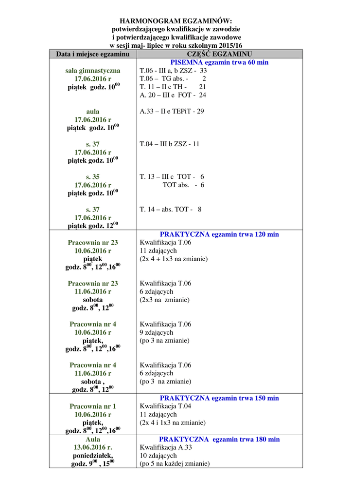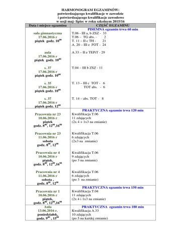 HARMONOGRAM EGZAMINÓW: potwierdzającego kwalifikacje w zawodzie i potwierdzającego kwalifikacje zawodowe w sesji maj- lipiec w roku szkolnym 2015/16 Data i miejsce egzaminu CZĘŚĆ EGZAMINU PISEMNA egzamin trwa 60 min T.06 - III a, b ZSZ - 33 sala gimnastyczna T.06 – TG abs. 2 17.06.2016 r T. 11 – II c TH 21 piątek godz. 1000 A. 20 – III e FOT - 24 aula 17.06.2016 r piątek godz. 1000 A.33 – II e TEPiT - 29 s. 37 17.06.2016 r piątek godz. 1000 T.04 – III b ZSZ - 11 s. 35 17.06.2016 r piątek godz. 1000 T. 13 – III c TOT - 6 TOT abs. - 6 s. 37 17.06.2016 r piątek godz. 1200 T. 14 – abs. TOT - 8 Pracownia nr 23 10.06.2016 r piątek godz. 800, 1200,1600 PRAKTYCZNA egzamin trwa 120 min Kwalifikacja T.06 11 zdających (2x 4 + 1x3 na zmianie) Pracownia nr 23 11.06.2016 r sobota godz. 800, 1200 Kwalifikacja T.06 6 zdających (2x3 na zmianie) Pracownia nr 4 10.06.2016 r piątek, godz. 800, 1200,1600 Kwalifikacja T.06 9 zdających (po 3 na zmianie) Pracownia nr 4 11.06.2016 r sobota , godz. 800, 1200 Kwalifikacja T.06 6 zdających (po 3 na zmianie) Pracownia nr 1 10.06.2016 r piątek, godz. 800, 1200,1600 Aula 13.06.2016 r. poniedziałek, godz. 900 , 1500 PRAKTYCZNA egzamin trwa 150 min Kwalifikacja T.04 11 zdających (2x 4 i 1x3 na zmianie) PRAKTYCZNA egzamin trwa 180 min Kwalifikacja A.33 10 zdających (po 5 na każdej zmianie) Aula 14.06.2016 r. wtorek godz. 900, 1500 Kwalifikacja A.33 10 zdających (po 5 na każdej zmianie) Aula 15.06.2016 r. środa godz. 900, 1500 Kwalifikacja A.33 9 zdających (5 na I zmianie, 4 na II zmianie) s.43/44 20.06.2016 r. poniedziałek godz. 900 PRAKTYCZNA egzamin trwa 180 min Kwalifikacja A.20 (7 zdających) s.43/44 20.06.2016 r. poniedziałek godz. 1500 Kwalifikacja A. 20 (6 zdających) s.43/44 21.06.2016 r. wtorek godz. 900 Kwalifikacja A. 20 (6 zdających) s.43/44 21.06.2016 r. wtorek godz. 1500 Kwalifikacja A. 20 (6 zdających) Aula 23.06.2016 r. czwartek godz. 900 s.37 23.06.2016 r. czwartek godz. 1300 s. 47 20.06.2016 r. poniedziałek godz. 1200 aula 21.06.2016 r. wtorek godz. 900 s. 42 21.06.2016 r. wtorek godz. 900 PRAKTYCZNA egzamin trwa 150 min T. 11 – II c TH – 21 T. 13 – III c TOT - 6 abs. TOT - 5 T.14 – abs.TOT - 8 PISEMNA egzamin trwa 120 min Absolwenci TH – 3 Absolwenci TKucharz - 3 PRAKTYCZNA egzamin trwa 240 min Absolwenci TH – 4 Absolwenci TKucharz – 5 Absolwent TŻGD – 1 Absolwent FOTO - 1 UWAGA !!! Uczniowie i absolwenci na egzamin zobowiązani są do stawienia się w szkole na pół godziny przed egzaminem w stroju galowym (część pisemna) w odpowiednim do kwalifikacji stroju ochronnym (część praktyczna) z dowodem tożsamości ze zdjęciem i odpowiednimi przyborami