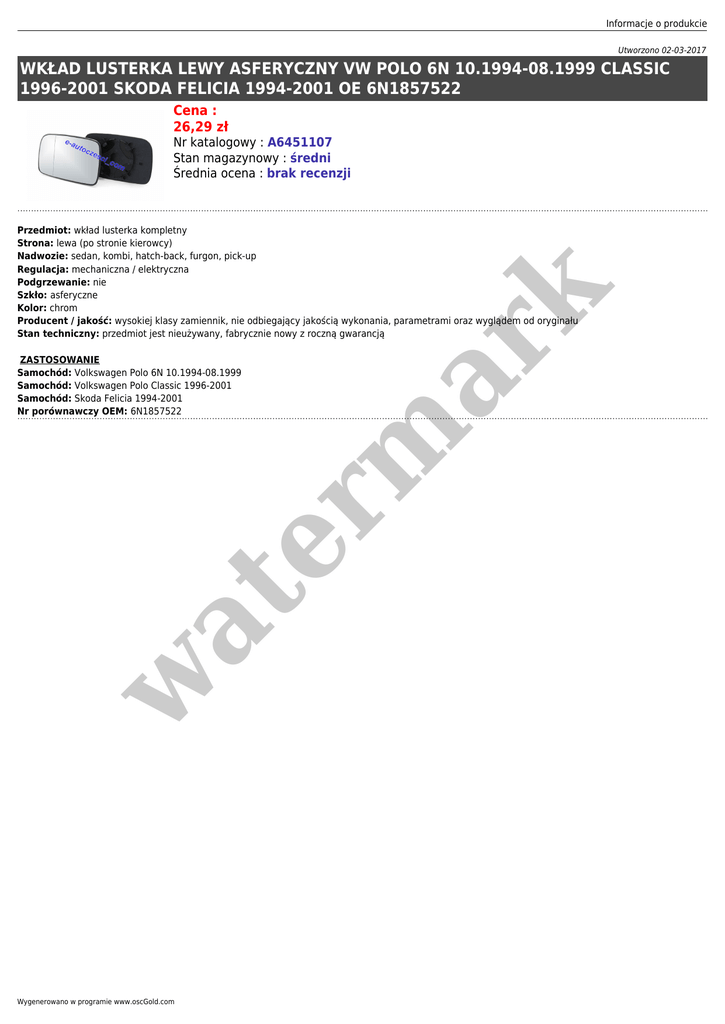 Informacje o produkcie Utworzono 02-03-2017 WKŁAD LUSTERKA LEWY ASFERYCZNY VW POLO 6N 10.1994-08.1999 CLASSIC 1996-2001 SKODA FELICIA 1994-2001 OE 6N1857522 Cena : 26,29 zł Nr katalogowy : A6451107 Stan magazynowy : średni Średnia ocena : brak recenzji er m ar k Przedmiot: wkład lusterka kompletny Strona: lewa (po stronie kierowcy) Nadwozie: sedan, kombi, hatch-back, furgon, pick-up Regulacja: mechaniczna / elektryczna Podgrzewanie: nie Szkło: asferyczne Kolor: chrom Producent / jakość: wysokiej klasy zamiennik, nie odbiegający jakością wykonania, parametrami oraz wyglądem od oryginału Stan techniczny: przedmiot jest nieużywany, fabrycznie nowy z roczną gwarancją w at ZASTOSOWANIE Samochód: Volkswagen Polo 6N 10.1994-08.1999 Samochód: Volkswagen Polo Classic 1996-2001 Samochód: Skoda Felicia 1994-2001 Nr porównawczy OEM: 6N1857522 Wygenerowano w programie www.oscGold.com