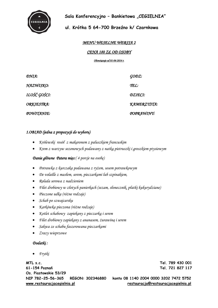 Sala Konferencyjno – Bankietowa „CEGIELNIA” ul. Krótka 5 64-700 Brzeźno k/ Czarnkowa MENU WESELNE WERSJA 2 CENA 180 ZŁ OD OSOBY Obowiązuje od 01-06-2014 r. DNIA: GODZ: NAZWISKO: TEL: ILOŚĆ GOŚCI: DZIECI: ORKIESTRA: KAMERZYSTA: POWITANIE: POPRAWINY: 1.OBIAD (jedna z propozycji do wyboru) Królewski rosół z makaronem z paluszkiem francuskim Krem z warzyw sezonowych podawany z natką pietruszki i groszkiem ptysiowym Danie główne Patera mięs:( 4 porcje na osobę) Potrawka z kurczaka podawana z ryżem, sosem potrawkowym De volaille z masłem, serem, pieczarkami lub szpinakiem, Rolada serowa z nadzieniem Filet drobiowy w złotych panierkach (sezam, słonecznik, płatki kukurydziane) Pieczone udka (różne rodzaje) Schab po szwajcarsku Karkówka pieczona (różne rodzaje) Kotlet schabowy zapiekany z pieczarką i serem Filet drobiowy zapiekany z ananasem, żurawiną i serem Sakwa ze schabu faszerowana pieczarkami Zrazy wieprzowe Dodatki : Frytki MTL s.c. 61-154 Poznań Os. Piastowskie 53/29 NIP 782-25-56-365 REGON: 302346880 www.restauracjacegielnia.pl Tel. 789 430 001 Tel. 721 827 117 konto 08 1140 2004 0000 3202 7472 5752 [email protected] Sala Konferencyjno – Bankietowa „CEGIELNIA” ul. Krótka 5 64-700 Brzeźno k/ Czarnkowa Ziemniaki Pyzy drożdżowe Sos ciemny Bukiet gotowanych warzyw Bukiet surówek 2.KAWA I Ciasto (trzy porcje na osobę) Kawa, herbata Woda z cytryną i miętą 3.ZIMNY BUFET Sałatki (trzy do wyboru) o o o o o o o Jarzynowa sycylijska selerowa z ananasem kebab grecka brokułowa z serem feta pieczarkowa Przystawki (cztery rodzaje do wyboru): o o o o o o o o o Ryba w pomidorach Ryba w occie Ryba po grecku Ryba w galarecie Pstrąg wędzony Schab nadziewany Karkówka pieczona Jajko w szynce w galarecie Tymbaliki drobiowe i wieprzowe z dodatkami o Pieczywo jasne i ciemne, masło MTL s.c. 61-154 Poznań Os. Piastowskie 53/29 NIP 782-25-56-365 REGON: 302346880 www.restauracjacegielnia.pl Tel. 789 430 001 Tel. 721 827 117 konto 08 1140 2004 0000 3202 7472 5752 [email protected] Sala Konferencyjno – Bankietowa „CEGIELNIA” ul. Krótka 5 64-700 Brzeźno k/ Czarnkowa PRZEKĄSKI (jedna patera na 10 osób) o o o o o o Pieczarki faszerowane Śliwka węgierka z wędzonym boczkiem Ser mozzarella z pomidorem i pesto Koreczki serowe Szynka wiejska Kiełbasa wiejska 4.KOLACJA barszcz z pasztecikiem szaszłyki drobiowe i wieprzowe golonki w siatce lub z kością (100 g na osobę), podawane z kapustą kwaszoną Dla dzieci: mini pizza 5.KAWA II – Stół bufetowy z ciastem 6.PO OCZEPINACH (jedna z propozycji do wyboru) Zupa gulaszowa Pikantne flaczki Żurek z kiełbasą i jajkiem 7.ŚNIADANIE (dwie pozycje do wyboru podawane z ciepłym pieczywem) Bigos Leczo Kiełbasa na ciepło Gołąbki Karp smażony Pstrąg smażony Kawa, herbata Woda z cytryną i miętą Pieczywo mieszane i masło MTL s.c. 61-154 Poznań Os. Piastowskie 53/29 NIP 782-25-56-365 REGON: 302346880 www.restauracjacegielnia.pl Tel. 789 430 001 Tel. 721 827 117 konto 08 1140 2004 0000 3202 7472 5752 [email protected] Sala Konferencyjno – Bankietowa „CEGIELNIA” ul. Krótka 5 64-700 Brzeźno k/ Czarnkowa Na życzenie klienta przygotowujemy potrawy wegetariańskie . Poprawiny dnia następnego od 14,00 do 20,00 w cenie już od 30,00 zł od osoby. W naszej restauracji możliwe jest zamówienie dodatkowych atrakcji wieczoru niespodzianki szefa kuchni: szynki pieczone, nadziewany prosiak lub schab glazurowany stół wiejskiej chaty ze smakołykami kuchni staropolskiej czekoladowej fontanny z sezonowymi owocami i słodkimi przekąskami W cenie wliczony jest podstawowy wystrój sali: falbany, serwetki białe, świeczki białe, dekoracja wejścia, powitanie Młodej Pary chlebem i solą, W zakresie zamawiającego jest dostarczenie soków, napoi gazowanych i alkoholowych oraz szampana . Oferujemy pomoc w zakresie organizacji: dekoracji tematycznej zespołu muzycznego kamerzysty fotografa transportu uczestników przed i po weselu MTL s.c. 61-154 Poznań Os. Piastowskie 53/29 NIP 782-25-56-365 REGON: 302346880 www.restauracjacegielnia.pl Tel. 789 430 001 Tel. 721 827 117 konto 08 1140 2004 0000 3202 7472 5752 [email protected]