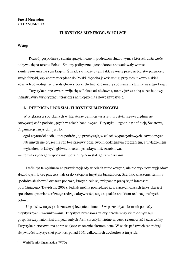 Paweł Nowocień 2 TIR SUM/z T3 TURYSTYKA BIZNESOWA W POLSCE Wstęp Rozwój gospodarczy świata sprzyja licznym podróżom służbowym, z których duża część odbywa się na terenie Polski. Zmiany polityczne i gospodarcze spowodowały wzrost zainteresowania naszym krajem. Świadczyć może o tym fakt, że wiele przedsiębiorstw przeniosło swoje fabryki, czy centra zarządcze do Polski. Wysoka jakość usług, przy stosunkowo niskich kosztach powodują, że przedsiębiorcy coraz chętniej organizują spotkania na terenie naszego kraju. Turystyka biznesowa rozwija się w Polsce od niedawna, mamy już za sobą okres budowy infrastruktury turystycznej, teraz czas na ulepszenia i nowe inwestycje. 1. DEFINICJA I PODZIAŁ TURYSTYKI BIZNESOWEJ W większości spotykanych w literaturze definicji turysty i turystyki nieuwzględnia się zazwyczaj osób podróżujących w celach handlowych. Turystyka – zgodnie z definicją Światowej Organizacji Turystyki1 jest to: ― ogół czynności osób, które podróżują i przebywają w celach wypoczynkowych, zawodowych lub innych nie dłużej niż rok bez przerwy poza swoim codziennym otoczeniem, z wyłączeniem wyjazdów, w których głównym celem jest aktywność zarobkowa, ― forma czynnego wypoczynku poza miejscem stałego zamieszkania. Definicja ta wyklucza co prawda wyjazdy w celach zarobkowych, ale nie wyklucza wyjazdów służbowych, które przecież należą do kategorii turystyki biznesowej. Szerokie znaczenie terminu „podróże służbowe” oznacza podróże, których cele są związane z pracą bądź interesami podróżującego (Davidson, 2003). Jednak można powiedzieć iż w naszych czasach turystyka jest sposobem uprawiania różnego rodzaju aktywności, staje się także środkiem realizacji różnych celów.. U podstaw turystyki biznesowej leżą nieco inne niż w pozostałych formach podróży turystycznych uwarunkowania. Turystyka biznesowa zależy przede wszystkim od sytuacji gospodarczej, natomiast dla pozostałych form turystyki istotne są ceny, sezonowość i czas wolny. Turystyka biznesowa ma coraz większe znaczenie ekonomiczne. W wielu państwach ten rodzaj aktywności turystycznej przynosi ponad 30% całkowitych dochodów z turystyki. 1 World Tourist Organization (WTO) Charakterystyczną cechą turystyki biznesowej jest fakt, że nie do końca jesteśmy w stanie określić jej rozmiary globalne. Turysta podróżujący w interesach poszukuje między innymi odpowiedniego standardu hotelu, sprawnego systemu przekazywania wiadomości, możliwości uzyskania informacji ekonomicznych. O wzrastającym znaczeniu gospodarczym turystyki biznesowej w Polsce świadczy wysoki procent gości obcokrajowców w warszawskich hotelach pięciogwiazdkowych. Nie ma ogólnie przyjętego podziału turystyki biznesowej, ponieważ nie da się jednoznacznie scharakteryzować turystyki biznesowej. W dużym uproszczeniu turystykę biznesową dzielimy na: ― turystykę motywacyjną; ― turystykę integracyjną; ― turystykę kongresową i konferencyjną; ― turystykę targową; ― wyjazdy służbowe w interesach. Często rodzaje turystyki mieszają się ze sobą, tworząc np. turystykę motywacyjno – integracyjną. 2. STAN OBECNY TURYSTYKI BIZNESOWEJ W POLSCE NA PODSTAWIE BADAŃ INSTYTUTU TURYSTYKI 2.1. CHARAKTERYSTYKA BAZY HOTELOWEJ W POLSCE. Tab. 1. Hotele i miejsca noclegowe według kategorii w Polsce w 2005 r. (stan w dniu 31 lipca 2005r.) Hotele według kategorii Liczba obiektów Miejsca noclegowe ***** 16 5335 **** 66 13160 *** 458 55788 ** 421 33331 * 151 10690 W trakcie kategoryzacji 119 9197 Razem 1231 127501 Źródło: Turystyka 2005, Warszawa, GUS, 2006 W roku 2005 w Polsce zanotowano działanie 1231 hoteli. W porównaniu z rokiem poprzednim nastąpił 2.4% wzrost (2004 rok – 1202 hotele). W hotelach do użytku gości oddano 127 501 miejsc noclegowych – o 3.7% więcej niż w roku poprzednim (2004 rok – 122 901 miejsc noclegowych). Średnio na jeden obiekt przypadają 104 miejsca noclegowe (rok 2004 – 102 miejsca noclegowe). Klienci turystyki biznesowej (przede wszystkim kongresów i konferencji) potrzebują obiektów o wysokim standardzie, hoteli pięcio-, cztero i trzygwiazdkowych. W 2005 roku w Polsce było 540 hoteli o takim standardzie i stanowiły one 43.9% wszystkich hoteli. Większość z tych hoteli pełni także funkcje ośrodków konferencyjnych. Hotele pięcio-, cztero i trzygwiazdkowe posiadały 74283 miejsca noclegowe, co stanowiło 58.3% wszystkich miejsc noclegowych w kraju. Średnio na jeden obiekt przypadało 138 miejsc noclegowych. Tab. 2. Hotele pięcio-, cztero- i trzygwiazdkowe w miastach (stan na dzień 31 lipca 2005 r.) Miasto Białystok Bydgoszcz Gdańsk Katowice Kielce Kraków Lublin Łódź Olsztyn Opole Poznań Rzeszów Szczecin Warszawa Wrocław Zielona Góra Razem Razem 3 6 12 7 5 55 4 6 5 6 19 5 9 33 24 2 201 ***** 0 0 2 0 0 4 0 0 0 0 0 0 0 8 0 0 14 **** 2 2 2 3 0 6 1 0 0 0 3 0 2 5 8 0 34 *** 1 4 8 4 5 45 3 6 5 6 16 5 7 20 16 2 153 Źródło: Turystyka 2005, Warszawa, GUS, 2006 Hotele pięciogwiazdkowe znajdują się w 4 województwach: mazowieckim (8), małopolskim (4), śląskim (2) oraz pomorskim (2). Najwięcej obiektów czterogwiazdkowych jest w województwach: małopolskim (11), dolnośląskim (11), śląskim (8) i pomorskim (6). Obiekty trzygwiazdkowe skupiają się przede wszystkim w województwach: małopolskim (71), dolnośląskim (58), wielkopolskim (49), mazowieckim (37) i śląskim (37). W roku 2005 37.2% hoteli pięcio-, cztero- i trzygwiazdkowych znajdowało się w dużych miastach. Potentatami skupiającym najwięcej takich hoteli były: Kraków (55), Warszawa (33), Wrocław (24), Poznań (19). Hotele pięcio-, cztero- i trzygwiazdkowe znajdujące się w tych aglomeracjach skupiały 65% wszystkich hoteli o tym standardzie. Tab. 3. Struktura obiektów konferencyjnych i kongresowych w Polsce w 2003 roku Źródło: Badania Instytutu Turystyki Ponad połowa obiektów konferencyjny