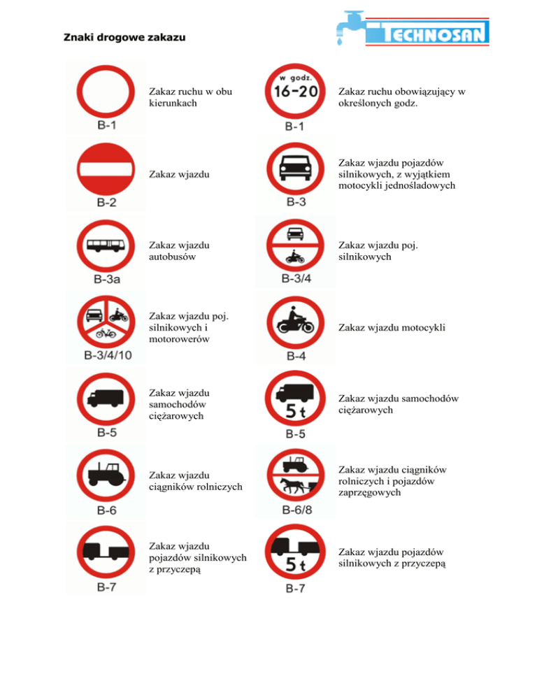 Znaki drogowe zakazu Zakaz ruchu w obu kierunkach Zakaz ruchu obowiązujący obowi w określonych lonych godz. Zakaz wjazdu Zakaz wjazdu pojazdów silnikowych, z wyjątkiem wyj motocykli jednośladowych jedno Zakaz wjazdu autobusów Zakaz wjazdu poj. silnikowych Zakaz wjazdu poj. silnikowych i motorowerów Zakaz wjazdu motocykli Zakaz wjazdu samochodów cięŜarowych arowych Zakaz wjazdu samochodów cięŜarowych arowych Zakaz wjazdu ciągników gników rolniczych Zakaz wjazdu ciągników ci rolniczych i pojazdów zaprzęgowych gowych Zakaz wjazdu pojazdów silnikowych z przyczepą Zakaz wjazdu pojazdów silnikowych z przyczepą przyczep Znaki drogowe zakazu Zakaz wjazdu pojazdów zaprzęgowych ęgowych Zakaz wjazdu rowerów Zakaz wjazdu motorowerów Zakaz wjazdu wózków rowerowych Zakaz wjazdu wózków ręcznych Zakaz wjazdu pojazdów z materiałami wybuchowymi łatwo zapalnymi Zakaz wjazdu z materiałami niebezpiecznymi Zakaz wjazdu pojazdów z materiałami wybuchowymi lub zapalnymi oraz materiałami mogącymi mog skazić wodę Zakaz wjazdu z materiałami, które mogą skazić wodę Zakaz wjazdu pojazdów o szerokości ści ponad ... m Zakaz wjazdu pojazdów o wysokości wysoko ponad ... m Zakaz wjazdu pojazdów o długości ci ponad ... m Zakaz wjazdu pojazdów o rzeczyw. masie całk. ponad ... t Zakaz wjazdu pojazdów o nacisku osi większym wi niŜ ... t Znaki drogowe zakazu Stop Zakaz skrętu w lewo Zakaz skrętu skrę w prawo Zakaz zawracania Koniec zakazu zawracania Zakaz wyprzedzania Zakaz wyprzedzania przez samochody cięŜarowe Koniec zakazu wyprzedzania Koniec zakazu wyprzedzania przez samochody cięŜarowe ci Zakaz uŜywania Ŝywania sygnałów dźwiękowych kowych Koniec zakazu uŜywania ywania sygnałów dźwiękowych kowych Pierwszeństwo ństwo dla nadnad jeŜdŜających ących z przeciwka Stój - kontrola celna Stój - kontrola graniczna Znaki drogowe zakazu Rogatka uszkodzona Sygnalizacja uszkodzona Wjazd na prom Kontrola drogowa Ograniczenie prędkości Koniec ograniczenia prędkości pr Zakaz postoju Zakaz postoju Zakaz zatrzymywania się Zakaz postoju w dni nieparzyste Zakaz postoju w dni parzyste Strefa ograniczonego postoju Koniec strefy ograniczonego nego postoju Zakaz ruchu pieszych Znaki drogowe zakazu Koniec zakazów Koniec strefy ograniczonej prędkości pr Strefa ograniczonej prędkości pr