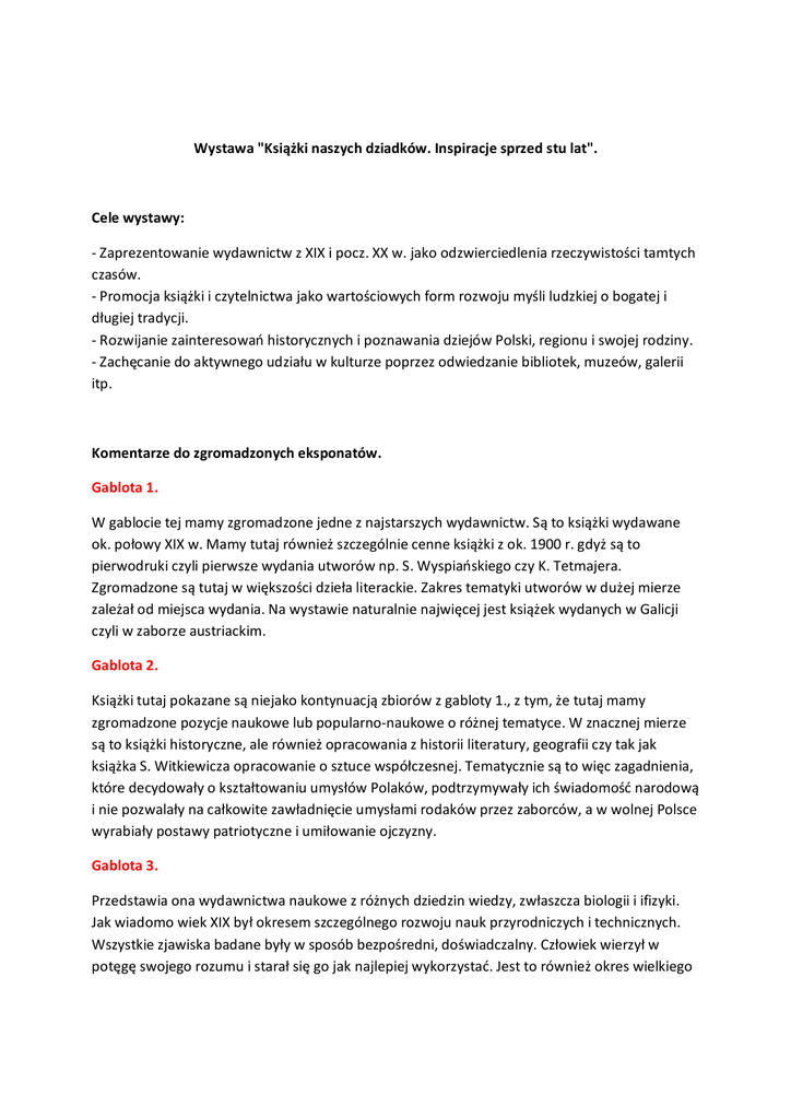 Wystawa "Książki naszych dziadków. Inspiracje sprzed stu lat". Cele wystawy: - Zaprezentowanie wydawnictw z XIX i pocz. XX w. jako odzwierciedlenia rzeczywistości tamtych czasów. - Promocja książki i czytelnictwa jako wartościowych form rozwoju myśli ludzkiej o bogatej i długiej tradycji. - Rozwijanie zainteresowań historycznych i poznawania dziejów Polski, regionu i swojej rodziny. - Zachęcanie do aktywnego udziału w kulturze poprzez odwiedzanie bibliotek, muzeów, galerii itp. Komentarze do zgromadzonych eksponatów. Gablota 1. W gablocie tej mamy zgromadzone jedne z najstarszych wydawnictw. Są to książki wydawane ok. połowy XIX w. Mamy tutaj również szczególnie cenne książki z ok. 1900 r. gdyż są to pierwodruki czyli pierwsze wydania utworów np. S. Wyspiańskiego czy K. Tetmajera. Zgromadzone są tutaj w większości dzieła literackie. Zakres tematyki utworów w dużej mierze zależał od miejsca wydania. Na wystawie naturalnie najwięcej jest książek wydanych w Galicji czyli w zaborze austriackim. Gablota 2. Książki tutaj pokazane są niejako kontynuacją zbiorów z gabloty 1., z tym, że tutaj mamy zgromadzone pozycje naukowe lub popularno-naukowe o różnej tematyce. W znacznej mierze są to książki historyczne, ale również opracowania z historii literatury, geografii czy tak jak książka S. Witkiewicza opracowanie o sztuce współczesnej. Tematycznie są to więc zagadnienia, które decydowały o kształtowaniu umysłów Polaków, podtrzymywały ich świadomość narodową i nie pozwalały na całkowite zawładnięcie umysłami rodaków przez zaborców, a w wolnej Polsce wyrabiały postawy patriotyczne i umiłowanie ojczyzny. Gablota 3. Przedstawia ona wydawnictwa naukowe z różnych dziedzin wiedzy, zwłaszcza biologii i ifizyki. Jak wiadomo wiek XIX był okresem szczególnego rozwoju nauk przyrodniczych i technicznych. Wszystkie zjawiska badane były w sposób bezpośredni, doświadczalny. Człowiek wierzył w potęgę swojego rozumu i starał się go jak najlepiej wykorzystać. Jest to również okres wielkiego postępu technicznego, wielu wynalazków, rozwoju przemysłu i spektakularnych budowli jak np. kanał sueski czy wieża Eifla. W gablocie tej mamy właśnie wydawnictwa ilustrujące ten wielki rozwój myśli techniczno-przyrodniczej, z dokładnymi opisami i ilustracjami np. roślin polnych, anatomii człowieka itp. Gablota 4. Książki do nauczania. Pomimo, że Polska była podzielona między zaborców, to przecież wszędzie toczyło się normalne życie i nauka szkolna była jednym z jego istotnych elementów. Wiek XIX to czas, gdy nauka nie odbywała się już na zasadzie mistrz - uczeń. Oczywiście istniało jeszcze nauczanie i wychowanie domowe (zwłaszcza wśród arystokracji i bogatego mieszczaństwa), ale główny nurt edukacji odbywa się w ramach zorganizowanego, zinstytucjonalizowanego szkolnictwa powszechnego. W związku z tym potrzeba było profesjonalnie przygotowanych nauczycieli, którzy umieli by realizować założony przez władze szkolne program. Gablota 5. Podręczniki szkolne dla uczniów. Tak jak nauczyciel miał pomoc przy nauczaniu, tak i uczeń mógł już korzystać z przeznaczonego dla siebie podręcznika. Produkcja drukarska była już na tyle rozwinięta, że książka stała się osiągalna dla uczniów i słowo pisane mogło dosłownie trafić pod strzechy. Mamy tutaj przykłady podręczników z różnych dziedzin nauki i różnych etapów nauczania. Podstawowa nauka w szkołach powszechnych ograniczała się często do nauki czytania, pisania i rachunków. Trzeba także zwrócić uwagę, że dawne gimnazjum, traktowane jako szkoła średnia, w żadnym wypadku nie może być porównywane do obecnych szkół gimnazjalnych. Gablota 6. Wszystkiego po trochę, ale po kolei. Najpierw książki religijne, gdyż do czasów Polski Ludowej było rzeczą zupełnie naturalną, że religia jest elementem codziennego życia i rzeczywistości domowej, szkolnej, publicznej nie zamykającą się się tylko w kościołach i klasztorach. Tutaj mamy najstarszy eksponat naszej wystawy - jest to wydany w Paryżu, w języku francuskim "Podręcznik chrześcijanina" z 1841 r. Następnie mamy przykłady kilku pozycji przeznaczonych dla dzieci i młodzieży. Trzeba w tym miejscu zaznaczyć, że w ogóle literatura dla dzieci i młodzieży na szerszą skalę rozwinęła się dopiero w wieku XIX. Na wystawie mamy akurat przykłady już późniejsze, z okresu międzywojennego. Wiek XIX to również czas powstawania ogólnodostępnych publicznych bibliotek, które w znacznym stopniu przyczyniły się do rozwoju czytelnictwa. Był to okres, gdy w wielu krajach powstawały biblioteki narodowe, np. w Waszyngtonie, Rzymie, Atenach, a na ziemiach polskich biblioteka Ossolińskich we Lwowie i biblioteka Raczyńskich w Poznaniu. Mamy tu zatem przykłady książek, których tematem są właśnie książki i biblioteki. Dalej prezentujemy wydawnictwa prawnicze czyli to, co jest podstawą organizacji państwa i jego administracji. Żeby prawo obowiązywało i spełniało swoją rolę, nie wystarczy je uchwalić, ale musi być ono przede wszystkim rozpowszechnione i znane poddanym. I w tym względzie książka staje się nieocenionym sprzymierzeńcem. Gablota 7. Na zakończenie mamy jeszcze małą gablotkę z przykładami "twórczości własnej" czytelników i uczniów czyli różnego rodzaju rysunki, dopiski, malunki, notatki itp. robione na kartach książek być może podczas nudnych lekcji. Znajdują się tu również przykłady przyborów szkolnych z czasów międzywojennych, które ilustrują czym posługiwali się uczniowie w dawnej szkole. Stolik. Na stoliku na środku sali mamy jeszcze kilka wydawnictw zasługujących na uwagę jako ciekawostki ze względu na samą treść publikacji lub format czy sposób wydania. Przeglądając je można odnaleźć szkoły w swojej miejscowości istniejące przed wojną, znaleźć życzenia lub toas