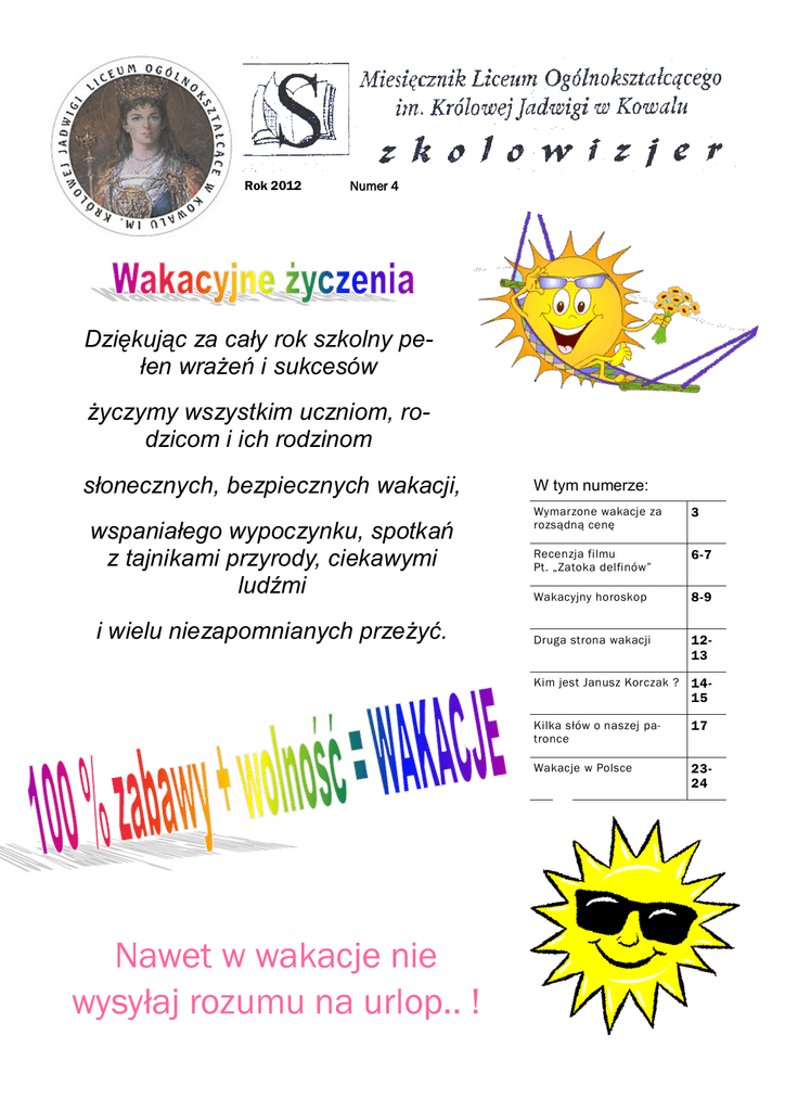 Rok 2012 Numer 4 Dziękując za cały rok szkolny pełen wrażeń i sukcesów życzymy wszystkim uczniom, rodzicom i ich rodzinom słonecznych, bezpiecznych wakacji, wspaniałego wypoczynku, spotkań z tajnikami przyrody, ciekawymi ludźmi i wielu niezapomnianych przeżyć. Nawet w wakacje nie wysyłaj rozumu na urlop.. ! W tym numerze: Wymarzone wakacje za rozsądną cenę 3 Recenzja filmu Pt. „Zatoka delfinów” 6-7 Wakacyjny horoskop 8-9 Druga strona wakacji 1213 Kim jest Janusz Korczak ? 1415 Kilka słów o naszej patronce 17 Wakacje w Polsce 2324 Babskie tematy, babskie sprawy... Dziewczyny! Za parę dni wakacje! A wy, no właśnie, pochłonięte szkolnymi sprawami, zapomniałyście o sobie. Czas to zmienić. Z myślą o was w naszej rubryce ciekawostki na temat diety na lato, dzięki której nie będziecie martwić się zbędnymi kilogramami. Poza tym najświeższe nowinki ze świata mody. Najgorętszy temat sezonu! Jak wyglądać modnie i pięknie na plaży? Prezentujemy kolekcję najmodniejszych strojów kąpielowych, bo niewątpliwie to numer jeden na liście wakacyjnych zakupów. Jak wyglądać czarująco na plaży? Niedługo wakacje, piękna i słoneczna pogoda. Wypady nad jezioro z przyjaciółmi wakacje nad morzem? czy może Zastanawiacie się, jaki strój kąpielowy założyć. Prezentujemy najciekawsze trendy lata 2012. (Aneta Proszkiewicz) Str. 2 Wymarzone wakacje za rozsądną cenę Wymarzone wakacje za rozsądną cenę! Marzenie ściętej głowy? A może to proste jak drut? Oto kilka rad dla tych, dla których każdy grosz jest na wagę złota. Szukaj zniżek na komunikację miejską. Zatrzymaj się w hotelu lub na kempingu. Szukaj ofert: „płacisz raz, jesz, ile chcesz‖. W jedzenie zaopatruj się w supermarketach lub małych sklepach spożywczych, przekąski w miejscach atrakcji turystycznych są dużo droższe. Jeśli masz dostęp do kuchni, korzystaj z niej, zamiast zamawiać gotowe jedzenie. Szukaj darmowych atrakcji. Za niektóre wejściówki nie trzeba płacić. Zabierz ubrania na każdą pogodę. Nie będziesz musiał wydawać pieniędzy na kupno dodatkowej odzieży. Nie jedź sam! Za nocleg we dwójkę zapłacisz mniej. Jeśli nie masz obaw, możesz wypróbować podróż autostopem. Jedz w małych miejscowych barach i restauracjach. Z reguły są one dużo tańsze. Pamiętaj… tańsze, nie zawsze oznacza mniej atrakcyjne! Może się zdarzyć, że zabraknie ci pomysłów na to, jak urozmaicić wakacyjny czas. W tej sytuacji najlepszym rozwiązaniem może okazać się odwiedzenie centrum handlowego. „Bzdura!‖- pomyślałeś. Przekonaj się sam. 13 sposobów na niekonwencjonalny dzień w centrum handlowym: 1. 2. 3. 4. 5. 6. 7. 8. 9. Rozłóż na środku grę planszową i pytaj ludzi, czy nie chcą z tobą zagrać. Narysuj wokół siebie kółko i śpiewaj: „Mój jest ten kawałek podłogi‖ Załóż na dłoń skarpetkę i rozmawiaj przy pomocy niej z innymi. Spójrz się na kogoś, szczerząc zęby i oznajmij: „Dziś założyłem nowe skarpetki‖ Weź ze sobą aparat i rób każdemu po kolei zdjęcia. Upuść długopis, a gdy ktoś spróbuje go podnieść, krzyknij, że to twoja własność. Postaw pudło w windzie, a gdy ktoś wejdzie, pytaj, czy słyszy jakieś tykanie. Spójrz na kogoś podłym wzrokiem i krzyknij: „Kłamca‖! Przejedź się kilka razy w tę i we w tę na ruchomych schodach, gdy skończysz, oznajmij: „Aaa.. już rozumiem‖ 10. Wsiądź do windy, a gdy drzwi się zamkną, oznajmij opanowanym tonem: „ Spokojnie, te drzwi się znów otworzą‖ 11. Poklep kogoś po ramieniu, gdy ten się odwróci, zaprotestuj, że to nie ty. 12. Wstaw swoje biurko do łazienki, gdy ktoś wejdzie, zapytaj, czy był umówiony. 13. Bezczelnie chodź za kimś krok w krok. Gdy ten się odwróci, zapytaj z oburzeniem: „Dlaczego mnie śledzisz?” (Karolina Strzelecka) Str. 3 Wakacyjna dieta W dzisiejszych czasach o wygląd dbają zarówno kobiety, jak i panowie. Jednak płeć piękna ma na punkcie własnego wyglądu niemalże obsesję. Ważymy się kilka razy dziennie, stosujemy diety cud, torturujemy głodówkami. Po co? Odpowiedź jest prosta. Po prostu chcemy być piękne, atrakcyjne, zwiewne i olśniewające. Tylko czy to takie łatwe? Otóż, drogie czytelniczki, choć zabrzmi to niewiarygodnie. Nic prostszego! Wystarczy, że skorzystacie z naszych rad. Oto skuteczna dieta, która pomogła już wielu paniom. Po pierwsze regularność Metabolizm naszego organizmu dostosowuje się do ilości i częstotliwości dostarczanych składników pożywienia. Zbyt duże przerwy między posiłkami i nieregularne ich spożywanie może skutkować rozregulowaniem metabolizmu i w konsekwencji brakiem skuteczność stosowanej diety. Dobra rada! Spożywaj 5 posiłków dziennie o tych samych godzinach każdego dnia! Dobra woda zdrowia doda Odpowiednie nawodnienie organizmu to podstawa zdrowej diety. Woda usprawnia procesy trawienne, reguluje gospodarkę wodnoelektrolitową. Ponadto woda mineralna wzbogaca naszą dietę w szereg składników mineralnych, m.in. wapń, magnez, potas, fluor i- jeśli jest bez dodatków smakowych-dostarcza 0 kcal. Dziennie tracimy 2,5-3 l wody, a nawet niewielkie odwodnienie spowalnia przemianę materii i w rezultacie zmniejsza skuteczność diety. Dobra rada! Pij 2 litry płynów dziennie, w tym jak najwięcej wody niegazowanej! Grunt to urozmaicenie. Jedyna produktów spożywczych zupełnie zbędnych dla naszego organizmu to słodycze. Pozostałe (produkty zbożowe, mleko i produkty mleczne, jaja, mięso, wędliny, drób i ryby, tłuszcze, warzywa, owoce, suche nasiona roślin strączkowych) powinny być dostarczane w odpowiedniej ilości, bez wykluczania żadnej z nich (u ludzi zdrowych). Każda grupa produktów dostarcza innych składników pokarmowych, a pokrycie zapotrzebowania na wszystkie jest podstawą zdrowej diety. Sposób żywienia wykluczający któryś rodzaj produktów nie będzie skuteczny na dłuższą metę. Poz