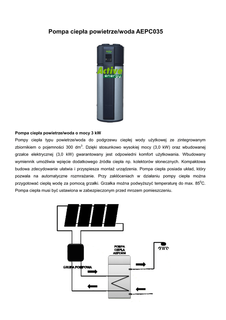Pompa ciepła powietrze/woda AEPC035 Pompa ciepła powietrze/woda o mocy 3 kW Pompy ciepła typu powietrze/woda do podgrzewu ciepłej wody uŜytkowej ze zintegrowanym zbiornikiem o pojemności 300 dm3. Dzięki stosunkowo wysokiej mocy (3,0 kW) oraz wbudowanej grzałce elektrycznej (3,0 kW) gwarantowany jest odpowiedni komfort uŜytkowania. Wbudowany wymiennik umoŜliwia wpięcie dodatkowego źródła ciepła np. kolektorów słonecznych. Kompaktowa budowa zdecydowanie ułatwia i przyspiesza montaŜ urządzenia. Pompa ciepła posiada układ, który pozwala na automatyczne rozmraŜanie. Przy zakłóceniach w działaniu pompy ciepła moŜna przygotować ciepłą wodę za pomocą grzałki. Grzałka moŜna podwyŜszyć temperaturę do max. 850C. Pompa ciepła musi być ustawiona w zabezpieczonym przed mrozem pomieszczeniu. Tryb pracy Temp. otoczenia Zasilanie Pojemność Ogrzewanie wody parametry nominalne ℃ Economy Hybrid E-heater -7~43 -30~43 -30~43 ph-VHz 220 -240V -1ph -50Hz L 300 Pobór mocy – moc grzałki kW 3.00 3.00 3.00 Pobór mocy kW 0.83 0.83 3.00 W/W 3.60 3.60 1.00 Prąd nominalny A 3.00 3.00 3.00 Max pobór mocy kW 1.50 4.30 3.00 Max pobór prądu A 6.5 18.7 13 COP Max pobór mocy kW 4.3 Max pobór prądu A 18.7 Wartość prądu początkowego A 49.0 Typ rotacyjna Marka SpręŜarka Pojemność Guangzhou Mitsubishi electric Btu/h 9485 Wejście W 850 Rated current (RLA) A 4.3 Przepływ powietrza zewnętrznego (wys./średni./niski) m3 500/450/400 Poziom hałasu dB 48 Średnica (D*H) mm Φ650×1920 Opakowanie (W*H*D) mm 745*2030*775 Waga netto/brutto kg 113/129 Rodzaj substancji chłodzącej/Ilość kg R134a -1.2- MPa 0.15/0.7 Jednostka zewnętrzna Ciśnienie zbiornika Materiał izolacyjny zbiornika/grubość (mm) Średnica, rura wody wejściowej Rurociąg Średnica, rura wody wyjściowej wymiennika ciepła z energii Wymiennik ciepła śred./dł. słonecznej Powierzchnia wymiennika ciepła Max ciśnienie Instalacja elektryczna Poliuretan/55mm mm DN20 mm DN20 mm Φ22 -10000- m 2 0.7 Mpa 0.7 2 2.5 Zasilacz mm Przewody sygnałowe mm2 Wydajność gorącej wody m3/h Grzałka elektryczna kW 0.75 0.075 0.075 0.064 3.0 w w w . e k o - i n s t a l . p l EKO-INSTAL, 41-800 Zabrze, ul. Roosevelta 44, tel. +48 32-376-09-50, www.eko-instal.pl , [email protected]