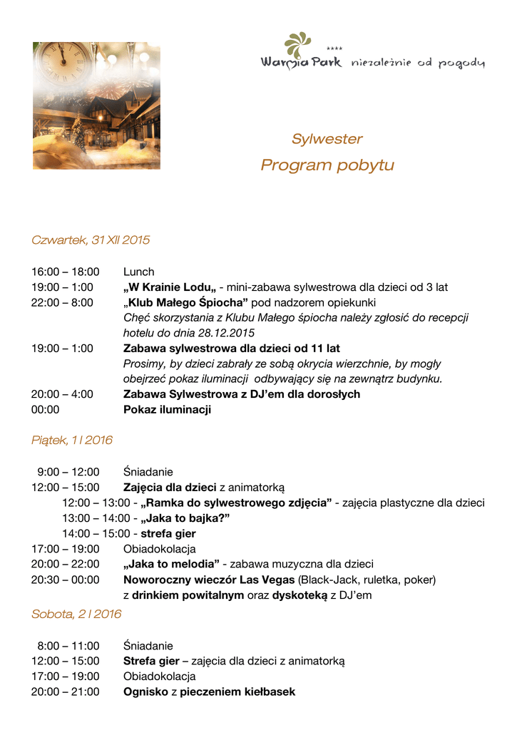 Sylwester Program pobytu Czwartek, 31 XII 2015 16:00 – 18:00 19:00 – 1:00 22:00 – 8:00 19:00 – 1:00 20:00 – 4:00 00:00 Lunch „W Krainie Lodu„ - mini-zabawa sylwestrowa dla dzieci od 3 lat „Klub Małego Śpiocha” pod nadzorem opiekunki Chęć skorzystania z Klubu Małego śpiocha należy zgłosić do recepcji hotelu do dnia 28.12.2015 Zabawa sylwestrowa dla dzieci od 11 lat Prosimy, by dzieci zabrały ze sobą okrycia wierzchnie, by mogły obejrzeć pokaz iluminacji odbywający się na zewnątrz budynku. Zabawa Sylwestrowa z DJ’em dla dorosłych Pokaz iluminacji Piątek, 1 I 2016 9:00 – 12:00 Śniadanie 12:00 – 15:00 Zajęcia dla dzieci z animatorką 12:00 – 13:00 - „Ramka do sylwestrowego zdjęcia” - zajęcia plastyczne dla dzieci 13:00 – 14:00 - „Jaka to bajka?” 14:00 – 15:00 - strefa gier 17:00 – 19:00 Obiadokolacja 20:00 – 22:00 „Jaka to melodia” - zabawa muzyczna dla dzieci 20:30 – 00:00 Noworoczny wieczór Las Vegas (Black-Jack, ruletka, poker) z drinkiem powitalnym oraz dyskoteką z DJ’em Sobota, 2 I 2016 8:00 – 11:00 12:00 – 15:00 17:00 – 19:00 20:00 – 21:00 Śniadanie Strefa gier – zajęcia dla dzieci z animatorką Obiadokolacja Ognisko z pieczeniem kiełbasek Niedziela, 3 I 2016 8:00 – 11:00 Śniadanie Ze względu na Państwa bezpieczeństwo i spokój zwracamy się z prośbą o niekorzystanie z własnych fajerwerków na terenie obiektu. Uwaga! Hotel zastrzega sobie możliwość zmian w programie. Życzymy miłego pobytu! Za dodatkową opłatą Gościom hotelowym proponujemy rekreację konną korzystanie z basenu solankowego zajęcia fitness z instruktorką możliwość wypożyczenia kijków do nordic walking bogatą ofertę zabiegów pielęgnacyjnych i zdrowotnych w SPA seanse Aqua Musicale prezenty w postaci voucherów SPA smakołyki kuchni Fusion oraz kuchni regionalnej w restauracji hotelowej „Pyszności dla aquaparkowych Gości” w aquabarze wieczorne drinki w klubie muzycznym Zapraszamy do korzystania z atrakcji hotelu w następujących godzinach AQUAPARK 31 XII 2015 10:00 – 19:00 1 I 2016 10:00 – 21:00 Aquabar SPA 12:00 – 18:00 10:00 – 17:00 12:00 – 20:00 10:00 – 21:00 Restauracja Klub muzyczny nieczynny 12:00 – 18:00 12:00 – 22:00 18:00 – 23:00 WARMIA PARK Pluski ul. Pluszna 36, 11-034 Stawiguda, tel.: +48-89-519-53-04, fax: +48-89-519-53-03 [email protected] www.warmiapark.pl www.warmiaparkclub.pl