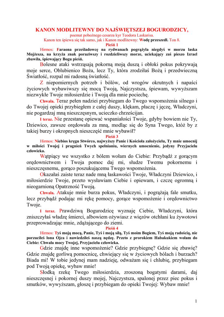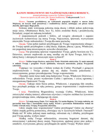 KANON MODLITEWNY DO NAJŚWIĘTSZEJ BOGURODZICY, poemat poboŜnego cesarza kyr Teodora Laskarisa. Kanon ten śpiewa się tak samo, jak i Kanon modlitewny: Wodę przeszedł. Ton 8. Pieśń 1 Hirmos: Faraona prześladowcę na rydwanach pogrąŜyła niegdyś w morzu laska MojŜesza, na krzyŜa znak poraziwszy i rozdzieliwszy morze, uciekający zaś pieszo Izrael zbawiła, śpiewający Bogu pieśń. Bolesne ataki wstrząsają pokorną moją duszą i obłoki pokus pokrywają moje serce, Oblubienico BoŜa, lecz Ty, która zrodziłaś BoŜą i przedwieczną Światłość, rozpal mi radosną światłość. Z niepomiernych potrzeb i bólów, od wrogów okrutnych i napaści Ŝyciowych wybawiwszy się mocą Twoją, Najczystsza, śpiewam, wywyŜszam niezwykłe Twoje miłosierdzie i Twoją dla mnie pociechę. Chwała. Teraz pełen nadziei przybiegam do Twego wspomoŜenia silnego i do Twojej opieki przybiegłem z całej duszy, klękam, płaczę i jęczę, Władczyni, nie pogardzaj mną nieszczęsnym, ucieczko chrześcijan. I teraz. Nie przestanę opiewać wspaniałości Twoje, gdyby bowiem nie Ty, Dziewico, zawsze orędowała za mną, modląc się do Syna Twego, któŜ by z takiej burzy i okropnych nieszczęść mnie wybawił? Pieśń 3 Hirmos: Niebios kręgu Stwórco, najwyŜszy Panie i Kościoła załoŜycielu, Ty mnie umocnij w miłości Twojej i pragnień Twych spełnianiu, wiernych umocnienie, jedyny Przyjacielu człowieka. Wątpiący we wszystko z bólem wołam do Ciebie: Przybądź z gorącym orędownictwem i Twoja pomoc daj mi, słudze Twemu pokornemu i nieszczęsnemu, gorąco poszukującemu Twego wspomoŜenia. Okazałaś zaiste teraz nade mną łaskawości Twoje, Władczyni Dziewico, i miłosierdzie Twoje, przeto wysławiam Ciebie i opiewam, i czczę ogromną i nieogarnioną Opatrzność Twoją. Chwała. Atakuje mnie burza pokus, Władczyni, i pogrąŜają fale smutku, lecz przybądź podając mi rękę pomocy, gorące wspomoŜenie i orędownictwo Twoje. I teraz. Prawdziwą Bogurodzicę wyznaję Ciebie, Władczyni, która zniszczyłaś władzę śmierci, albowiem oŜywiasz z więzów otchłani ku Ŝywotowi przeprowadzając mnie, zdąŜającego do ziemi. Pieśń 4 Hirmos: Tyś moją mocą, Panie, Tyś i moją siłą, Tyś moim Bogiem, Tyś moją radością, nie porzuciłeś łona Ojca i nawiedziłeś naszą nędzę. Przeto z prorokiem Habakukiem wołam do Ciebie: Chwała mocy Twojej, Przyjacielu człowieka. Gdzie znajdę inne wspomoŜenie? Gdzie przybiegnę? Gdzie się zbawię? Gdzie znajdę gorliwą pomocnicę, chwiejący się w Ŝyciowych bólach i burzach? Biada mi! W tobie jedynej mam nadzieję, odwaŜam się i chlubię, przybiegam pod Twoją opiekę, wybaw mnie! Słodką rzekę Twego miłosierdzia, zroszoną bogatymi darami, daj nieszczęsnej i pokornej duszy mojej, Najczystsza, spalonej przez piec pokus i smutków, wywyŜszam, głoszę i przybiegam do opieki Twojej: Wybaw mnie! 1 Ciebie, Czystą, Ciebie, Dziewicę nieskalaną, jedyną mam jako mur niezdobyty, ucieczkę, opiekę mocną i oręŜ zbawienia, nie pogardzaj mną marnotrawnym, nadziejo pozbawionych nadziei, słabych pomocy, smutnych radości i wspomoŜenie. I teraz. JakŜe będę mógł godnie wypowiedzieć niezmierzone dobrodziejstwa Twoje, o Władczyni? Moją duszę zawsze okropnie zasmuconą, która wody obeszła, a którą szaleńczo, nieszczęsny, zagubiłem, odnów z Twojej Opatrzności i łaskawości. Chwała. Pieśń 5 Hirmos: Całego odrzuciłeś mnie od oblicza Twego, Światłości Niezachodząca, i okryła mnie, przeklętego, obca ciemność, ale proszę Cię, nawróć mnie i skieruj ku światłości drogi przykazań Twoich. Dziękczynnie wołam do Ciebie: Raduj się, Matko Dziewico. Raduj się, Oblubienico BoŜa. Raduj się, BoŜa Opieko. Raduj się, oręŜu i murze niezdobyty. Raduj się, orędowniczko, pomocy i zbawienie tych, którzy przybiegają do Ciebie (dwa razy). Chwała. Ci, którzy mnie nienawidzą, przygotowali strzały, miecze i zasadzki, poszukują, jak zniszczyć moje nieszczęsne ciało i pragną sprowadzić je do ziemi, lecz przybądź i wybaw mnie od nich, Czysta. I teraz. JakiŜ dar dziękczynny przyniosę Tobie za rozkoszowanie się Twoimi darami i za twoje niezmierzone dobrodziejstwa? Przeto wysławiam, pieśni śpiewam i wielbię Twoje niewypowiedziane ku mnie miłosierdzie. Pieśń 6 Hirmos: Modlitwę wyleję przed Panem i Jemu opowiem smutki moje, albowiem pełna jest zła dusza moja i Ŝycie moje do otchłani przybliŜyło się, więc modlę się jak Jonasz: Wyprowadź mnie ze zniszczenia, BoŜe. Obłoki smutku pokryły nieszczęsną moją duszę i serce, i omraczają mnie, lecz Ty, Dziewico, która zrodziłaś Światłość Niedostępną, odpędź je daleko tchnieniem BoŜej modlitwy Twojej. Jako pociechę wszystkich zasmuconych i jako lekarkę słabości znam Ciebie, a takŜe jako doskonałe skruszenie śmierci i rzekę Ŝycia niewyczerpaną oraz szybkie wspomoŜenie wszystkich atakowanych przez pokusy. Chwała. Nie ukrywam głębi Twego miłosierdzia i strumieni niezmierzonych cudów, Źródło zaiste zawsze bijące ku mnie Twoim miłosierdziem, Władczyni, lecz wszystkim wyznaję, wołam, głoszę i zwiastuję. I teraz. Otoczyły mnie Ŝyciowe burze jak pszczoły miód, Dziewico, i moje serce ranią strzały smutków, lecz Ciebie znajduję jako pomocnicę, opiekunkę i wybawicielkę, Przeczysta. Pieśń 7 Hirmos: Dzieci hebrajskie w piecu zdeptały odwaŜnie płomień i na rosę zamieniły ogień, wołając: Błogosławiony jesteś, Panie BoŜe, na wieki. Bogurodzico, która zrodziłaś Światłość, oświeć mnie omroczonego nocą grzechów, będąc czystym i nieskalanym mieszkaniem Światłości, abym z miłością Ciebie sławił. 2 Opieką bądź i orędownictwem, wspomoŜeniem i chlubą, Dziewico, dla mnie pozbawionego teraz wszelkiej pomocy, mocy bezsilnych i nadziejo pozbawionych nadziei. Chwała. Całą duszą i myślą, sercem i ustami sławię Ciebie, rozkoszując się Twymi wie
