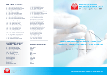 Wykładowcy / FACULTY prof. dr hab. n. med. Paweł Buszman /Ustroń/ prof. dr hab. n. med. Sławomir Dobrzycki /Białystok/ prof. dr hab. n. med. Mariusz Gąsior /Zabrze/ prof. Juan Luis Gutierrez-Chico /Berlin/ prof. dr hab. Tomasz Hirnle /Białystok/ prof. dr hab. n. med. Andrzej Lekston /Zabrze/ prof. dr hab. n. med. Jacek Legutko /Kraków/ prof. dr hab. n. med. Maciej Lesiak /Poznań/ prof. dr hab. n. med. Andrzej Ochała /Katowice/ prof. dr hab. n. med. Wojciech Wojakowski /Katowice/ dr n. med. Marek Król /Ustroń/ dr n. med. Marek Krzanowski /Kraków/ dr n. med. Tomasz Ludyga /Katowice/ dr Levente Molnár /Budapeszt/ dr n. med. Przemysław Nowakowski /Chrzanów/ dr n. med. Robert Proczka /Józefów/ dr n. med. Janusz Prokopczuk /Kędzierzyn Koźle/ dr n. med. Witold Tomalski /Sosnowiec/ dr n. med. Adam Uryniak /Rzeszów/ dr n. med. Krzysztof Wilczek /Zabrze/ dr n. med. Marcin Dębiński /Dąbrowa Górnicza/ dr n. med. Bogdan Gorycki /Bielsko-Biała/ dr n. med. Michał Hawranek /Zabrze/ dr n. med. Marek Kondys /Dąbrowa Górnicza/ lek. med. Katarzyna Czarnecka /Tychy/ lek. med. Bartosz Kądziołka /Warszawa/ lek. med. Maria Klajn /Częstochowa/ lek. med. Małgorzata Niedzielska /Łódź/ lek. med. Stanisław Trznadel /Katowice/ lek. med. Miłosz Zbroszczyk /Gliwice/ mgr Agnieszka Lizak /Bielsko Biała/Ustroń/ mgr Marek Orczyk /Dąbrowa Górnicza/ mgr Lilianna Krzesińska /Bełchatów/ mgr Arkadiusz Wnuk /Kraków/ mgr Paweł Chabiński /Chrzanów/ mgr Katarzyna Kręcichwost /Nysa/ mgr Ewa Jachymczyk /Kielce/ mgr Zenona Sadowska /Starachowice/ mgr Ireneusz Pawlak /Bielsko-Biała/ lic. piel. Aneta Laprus /Chrzanów/ KOMITET ORGANIZACYJNY STEERING COMMITTEE Sponsorzy / sponsors prof. dr hab. n. med. Paweł Buszman prof. dr hab. n. med. Andrzej Bochenek prof. dr hab. n. med. Wojciech Wojakowski dr hab. n. med. Piotr Buszman dr hab. n. med. Krzysztof Milewski dr n. med. Adam Janas dr n. med. Przemysław Nowakowski dr n. med. Bartłomiej Orlik lek. med. Michał Jelonek mgr Ewa Glońska-Strączek mgr Agnieszka Lizak mgr Katarzyna Spek mgr Anna Turek mgr Anna Wojewoda-Chycka Abbott Vascular Astra Zenca Adamed ANMAR Balton Boston Scientific Bbraun Medtronic EUSA Pharma GE Healthcare Genexo Radiometer Roche Molnlycke dr hab. n. med. Piotr Buszman /Zabrze/ dr hab. n. med. Stanisław Bartuś /Kraków/ dr hab. n. med. Marek Gierlotka /Zabrze/ dr hab. n. med. Miłosz Jaguszewski /Berlin/ dr hab. n. med. Wacław Kuczmik /Katowice/ dr hab. n. med. Andrzej Madej /Katowice/ dr hab. n. med. Krzysztof Milewski /Tychy/ dr hab. n. med. Piotr Rozentryt /Zabrze/ dr hab. n. med. Tomasz Urbanek /Katowice/ dr hab. n. med. Aleksander Żurakowski /Chrzanów/ IX Konferencja Naukowa SZKI IX Konferencja Stowarzyszenia Zawodowego Kardiologów Interwencyjnych Interventional CardioVascular Forum (ICVF) – Ustroń, Winter 2016 Ustroń | 17-19 marca / march 2016 Interventional CardioVascular Forum (ICVF) – Ustroń, Winter 2016 program Część piąta | Wyzwania w diagnostyce i terapii choroby wieńcowej Paneliści: Marek Gierlotka, Paweł Buszman, Andrzej Lekston, Andrzej Ochała se s ja 5 8:00-9:00 IX Konferencja Naukowa SZKI 9:00-11:00 Dialog motywujący w kardiologii: hit czy kit Maria Klajn Wczesna rehabilitacja kardiologiczna Marek Orczyk Programy edukacyjne pacjentów Liliana Krzesińska 11:00-11:30 Przerwa kawowa se sja 2 11:30-13:00 13:00-14:00 Miejsce POCT w szpitalnym systemie diagnostyki laboratoryjnej Arkadiusz Wnuk Pielęgnowanie pacjentów z portem naczyniowym Aneta Laprus Echokardiografia praktyczna w pigułce Paweł Chabiński Opieka pielęgniarska u pacjentów z udarem krwotocznym; rola pielęgniarki Ewa Jachymczyk Przerwa obiadowa ses ja 3 Część trzecia | Sympozjum techników RTG i pielęgniarek 14:00-15:45 Interwencyjne leczenie udarów – perspektywy najbliższych lat Witold Tomalski Algorytm leczenia ran; stopa cukrzycowa; studium przypadku Zenona Sadowska Fazy gojenia rany Małgorzata Niedzielska Kliniczna i mikrobiologiczna skuteczność gąbki garamycynowej Marcin Stopa Rola zespołu anestezjologicznego w leczeniu pacjenta wyziębionego Ireneusz Pawlak Zasady ochrony radiologicznej – minimalizacje dawki promieniowania w pracowni hemodynamiki oraz salach hybrydowych Paweł Chabiński 15:45-16:00 Przerwa kawowa 16:00-16:20 Telemedycyna w AHP 16.20-19.00 Warsztaty praktyczne 16:00 Oficjalne Otwarcie Szki | Przywitanie Uczestników Stanisław Trznadel Wacław Kuczmik Koszty leczenia krytycznego niedokrwienia Marek Krzanowski EVAS pro i kontra Robert Proczka Wyniki leczenia stentami szyjnymi MER Przemysław Nowakowski Prezentacja przypadków klinicznych Adam Uryniak, Robert Proczka, Przemysław Nowakowski, Mariusz Góral Spotkanie badaczy – badanie PAX 18:00-19:00 Kurs dla rezydentów AHP – jak pisać prace naukowe? 19:00-20:00 Test dla rezydentów AHP Ostre zespoły wieńcowe bez uniesienia odcinka ST – wytyczne 2015 20:00 Kolacja Choroba wieńcowa u pacjentów z wadami zastawkowymi serca Andrzej Ochała Śląski Rejestr Ostrych Zespołów Wieńcowych Mariusz Gąsior 12:00-14:30 LIVE CASE no 1: Multivessel coronary revascularization with biodegradable polymer everolimus eluting stent (Synergy, Boston Scientific) guided by novel iFR system (Scout, Volcano/Phillips) Piotr Buszman Bogdan Gorycki Interventional cardiologist point of view for the treatment of multivessel coronary artery disease and ACS Sławomir Dobrzycki Cardiac surgeon point of view for the treatment of multivessel coronary artery disease and ACS Tomasz Hirnle Should we treat non-culprit lesions in ACS and what is the best method Pro – Miłosz Jaguszewski Contra – Jacek Legutko Second stage procedures after ACS – how shall we manage chronic total occlusions? Juan Luis Gutierrez-Chico FEATURED LECTURE: Air pollution and cardiovascular diseases Paweł Buszman Przerwa obiadowa 15:30-15:50 Diagnostyka obrazowa i kwalifikacja chorych z udarem niedokrwiennym do mechanicznej reperfuzji Miłosz Zbroszczyk 15:50-16:20 Trom