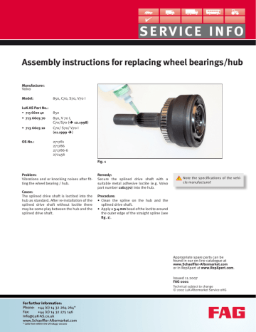 Assembly instructions for replacing wheel bearings/hub Manufacturer: Volvo Model: 850, C70, S70, V70 I LuK AS Part No.: • 713 6600 40 850 • 713 6603 70 850, V 70 I, C70/S70 ( 12.1998) • 713 6603 10 C70/ S70/ V70 I (01.1999 ) OE-No.: 271781 271786 271786-6 272456 Fig. 1 Problem: Vibrations and or knocking noises after fitting the wheel bearing / hub. Cause: The splined drive shaft is loctited into the hub as standard. After re-installation of the splined drive shaft without loctite there may be some play between the hub and the splined drive shaft. Remedy: Secure the splined drive shaft with a suitable metal adhesive loctite (e.g. Volvo part number 1161370) into the hub. ! Note the specifications of the vehi- cle manufacturer! Procedure: • Clean the spline on the hub and the splined drive shaft. • Apply a 3-4 mm bead of the loctite around the outer edge of the straight spline (see fig. 1). Appropriate spare parts can be found in our on-line catalogue at www.Schaeffler-Aftermarket.com or in RepXpert at www.RepXpert.com. Issued 11.2007 FAG 0001 Technical subject to change © 2007 LuK-Aftermarket Service oHG