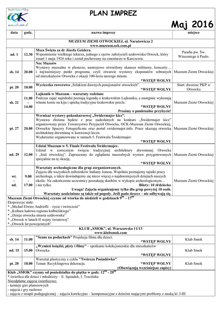 PLAN IMPREZ data godz. nazwa imprezy Maj 2016 miejsce MUZEUM ZIEMI OTWOCKIEJ, ul. Narutowicza 2 www.muzeum.ock.com.pl Msza Święta za dr Józefa Geislera. Parafia pw. Św. nd. 1 12.30 Wspomnienie wielkiego lekarza, jednego z ojców założycieli uzdrowiska Otwock, który Wincentego á Paulo. zmarł 1 maja 1924 roku i został pochowany na cmentarzu w Karczewie. Noc Muzeów Wystawy muzealne w plenerze, nastrojowo oświetlony skansen militarny, koncerty… sb. 14 20.00 i najważniejszy punkt programu, czyli otwarcie wystawy eksponatów zebranych Muzeum Ziemi Otwockiej od mieszkańców Otwocka z okazji 100-lecia naszego miasta. *WSTĘP WOLNY Wycieczka rowerowa „Szlakiem dawnych pensjonatów otwockich”. Start: dworzec PKP w pt. 20 18.00 Otwocku *WSTĘP WOLNY Lajkonik w Muzeum – warsztaty rodzinne 11.00 Podczas zajęć najmłodsi poznają legendę o krakowskim Lajkoniku, a następnie wykonają własne konie na kiju i upieką tradycyjne krakowskie precle. Muzeum Ziemi Otwockiej sb. 21 – 14.00 *WSTĘP WOLNY Prosimy o punktualne przybycie! Wernisaż wystawy pokonkursowej „Świdermajer kicz”. Wystawa złożona będzie z prac nadesłanych na konkurs „Świdermajer kicz” organizowany przez Towarzystwo Przyjaciół Otwocka, OCK-Muzeum Ziemi Otwockiej, pt. 27 20.00 Otwockie Spacery Fotograficzne oraz portal swidermajer.info. Prace ukazują otwocką Muzeum Ziemi Otwockiej architekturę drewnianą w konwencji kiczu. Wydarzenie organizowane w ramach 5. Festiwalu Świdermajer. *WSTĘP WOLNY Udział Muzeum w 5. Finale Festiwalu Świdermajer. Udział w corocznym święcie tradycyjnej architektury drewnianej Otwocka nd. 29 12.00 i „linii otwockiej”. Zapraszamy do oglądania muzealnych wystaw przygotowanych Muzeum Ziemi Otwockiej specjalnie na tę okazję. *WSTĘP WOLNY Warsztaty archeologiczne dla grup zorganizowanych. Zajęcia dla wszystkich miłośników Indiany Jonesa. Wspólnie poznajemy tajniki pracy wt. 9.00 archeologa, a także dowiadujemy się nieco więcej o najdawniejszych dziejach naszych okolic. Na zakończenie uczestnicy poszukują skarbów w wykopie archeologicznym… Muzeum Ziemi Otwockiej Bilety: 10 zł/dziecko nd. 17.00 i nie tylko. Uwaga! Zajęcia organizujemy tylko dla grup powyżej 10 osób. Warsztaty uzależnione są także od pogody. Jeśli pada deszcz – nie odbywają się. Muzeum Ziemi Otwockiej czynne od wtorku do niedzieli w godzinach 900 – 1700 Ekspozycje stałe: * „Michał Elwiro Andriolli – życie i twórczość” * „Kultura ludowa regionu kołbielskiego” * „Dzieje otwocka miasta uzdrowiska” * „Otwock w latach II wojny światowej” * „Otwock lat powojennych” KLUB „SMOK”, ul. Warszawska 11/13 www.klubsmok.com "Seans na poduchach" Projekcja filmu dla dzieci. Klub Smok sb. 14 11.00 *WSTĘP WOLNY „Wymień książki, płyty i filmy” – spotkanie kolekcjonerskie dla mieszkańców Klub Smok nd. 15 15.00 Otwocka. *WSTĘP WOLNY Warsztat plastyczny z cyklu "Twórcza Posiadówka" *WSTĘP WOLNY Klub Smok pt. 20 18.00 Temat: Recyklingowa dekoracja. (Obowiązują wcześniejsze zapisy) Klub „SMOK” czynny od poniedziałku do piątku w godz. 1200 - 2000 * świetlica dla dzieci i młodzieży – E. Sąsiadek, I. Trzcińska Nieodpłatne zajęcia świetlicowe: - turnieje gier planszowych - zajęcia i gry ruchowe - zajęcia z terapii pedagogicznej – zajęcia korekcyjno – kompensacyjne z dziećmi mającymi problemy z nauką kl. I-III - kawiarenka komputerowa - zajęcia aktorskie (przygotowanie przedstawienia w ramach Przeglądu Amatorskich Przedstawień Profilaktycznych) Zajęcia odpłatne: * pracownia rzeźby – M. Pietrzak – wtorek, środa godz. 1700 * „Maluszkowo” zajęcia dla dzieci od 2 do 4 lat przygotowujące dziecko do pobytu w przedszkolu – gry i zabawy ruchowe, zajęcia muzyczne, wprawki plastyczne – E. Sąsiadek – wtorek godz. 900 * zajęcia teatralne – E. Sąsiadek – wtorek 1600 * zajęcia plastyczne – I. Trzcińska – czwartek 1600 * zajęcia muzyczne – M. Gajewski - wtorek 1800, czwartek 1700 * zajęcia kulinarne – E. Sąsiadek – poniedziałek 1700 KLUB „MLĄDZ”, ul. Majowa 202 www.klubmladz.ock.com.pl Piątkowe wieczory filmowe. Klub Mlądz pt. 06 19.00 Projekcja filmów dla młodzieży. *WSTĘP WOLNY Dzień bibliotekarza i bibliotek pt.: „Biblioteka inspiruje” We współpracy z filią biblioteki publicznej mieszczącej się w klubie przeprowadzone zostaną warsztaty kaligrafii, nauka pisania na maszynie. Warsztaty ukazujące jak Klub Mlądz nd. 08 16.00 powstawały rękopisy do książek na przestrzeni wieków. Poprowadzona zostanie prelekcja o tym jak powstało pismo. *WSTĘP WOLNY Piątkowe wieczory filmowe. Klub Mlądz pt. 20 19.00 Projekcja filmów dla młodzieży. *WSTĘP WOLNY Bajki nie tylko dla dzieci. Klub Mlądz nd. 22 16.00 Projekcja filmu. *WSTĘP WOLNY KLUB „MLĄDZ” czynny od poniedziałku do piątku w godz. 1200 -2000 * świetlica dla dzieci i młodzieży – M. Malesa – poniedziałek – piątek godz. 1200 – 1700 Nieodpłatne zajęcia świetlicowe: - warsztaty plastyczne tematyczne (wielkanocne, bożonarodzeniowe) - turnieje gier planszowych - zajęcia i gry ruchowe - kawiarenka komputerowa - doraźna pomoc dzieciom i młodzieży w zajęciach plastycznych, gazetkach, szkolnych pracach dodatkowych Zajęcia nieodpłatne: * zespół ludowy „Mlądz” – G.Powałka – wtorek godz. 1700 * grupa teatralna „Cylinder” – M.Malesa – piątek godz. 1700 * dziecięca sekcja teatralna „Jaskółeczka” – M.Malesa – piątek godz. 1715 Zajęcia odpłatne: * wiklina – T.Sokolik – poniedziałek, wtorek, środa godz. 1600 * zajęcia plastyczne – I. Trzcińska – wtorek godz. 1700 * warsztaty kreatywności grupa przedszkolna – M. Duraj- Kwas – poniedziałek godz. 1700 * warsztaty kreatywności grupa szkolna – M. Duraj- Kwas – poniedziałek godz. 1815 * zajęcia ogólnorozwojowe - UKS Niedźwiadek dla dzieci - wtorek, środa, piątek godz. 1630 IMPRESARIAT ww