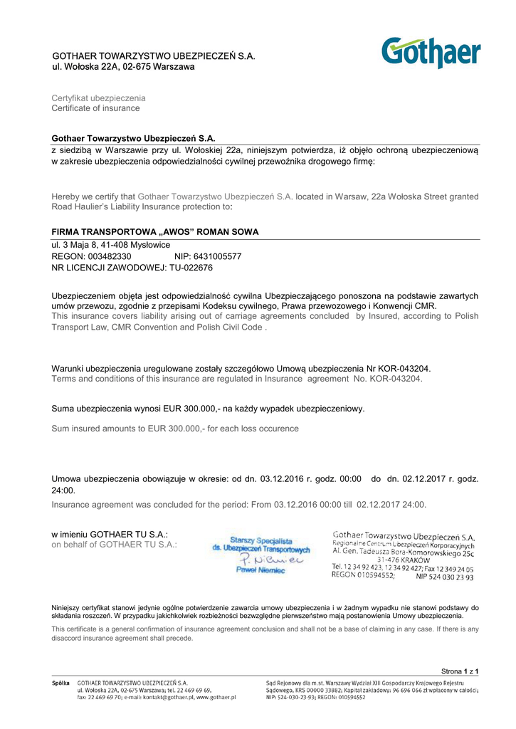 Certyfikat ubezpieczenia Certificate of insurance Gothaer Towarzystwo Ubezpieczeń S.A. z siedzibą w Warszawie przy ul. Wołoskiej 22a, niniejszym potwierdza, iż objęło ochroną ubezpieczeniową w zakresie ubezpieczenia odpowiedzialności cywilnej przewoźnika drogowego firmę: Hereby we certify that Gothaer Towarzystwo Ubezpieczeń S.A. located in Warsaw, 22a Wołoska Street granted Road Haulier’s Liability Insurance protection to: FIRMA TRANSPORTOWA „AWOS” ROMAN SOWA ul. 3 Maja 8, 41-408 Mysłowice REGON: 003482330 NIP: 6431005577 NR LICENCJI ZAWODOWEJ: TU-022676 Ubezpieczeniem objęta jest odpowiedzialność cywilna Ubezpieczającego ponoszona na podstawie zawartych umów przewozu, zgodnie z przepisami Kodeksu cywilnego, Prawa przewozowego i Konwencji CMR. This insurance covers liability arising out of carriage agreements concluded by Insured, according to Polish Transport Law, CMR Convention and Polish Civil Code . Warunki ubezpieczenia uregulowane zostały szczegółowo Umową ubezpieczenia Nr KOR-043204. Terms and conditions of this insurance are regulated in Insurance agreement No. KOR-043204. Suma ubezpieczenia wynosi EUR 300.000,- na każdy wypadek ubezpieczeniowy. Sum insured amounts to EUR 300.000,- for each loss occurence Umowa ubezpieczenia obowiązuje w okresie: od dn. 03.12.2016 r. godz. 00:00 24:00. do dn. 02.12.2017 r. godz. Insurance agreement was concluded for the period: From 03.12.2016 00:00 till 02.12.2017 24:00. w imieniu GOTHAER TU S.A.: on behalf of GOTHAER TU S.A.: Niniejszy certyfikat stanowi jedynie ogólne potwierdzenie zawarcia umowy ubezpieczenia i w żadnym wypadku nie stanowi podstawy do składania roszczeń. W przypadku jakichkolwiek rozbieżności bezwzględne pierwszeństwo mają postanowienia Umowy ubezpieczenia. This certificate is a general confirmation of insurance agreement conclusion and shall not be a base of claiming in any case. If there is any disaccord insurance agreement shall precede. Strona 1 z 1