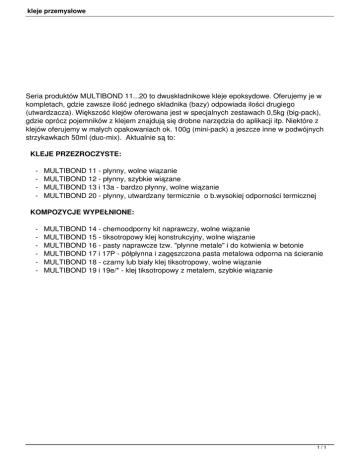 kleje przemysłowe Seria produktów MULTIBOND 11...20 to dwuskładnikowe kleje epoksydowe. Oferujemy je w kompletach, gdzie zawsze ilość jednego składnika (bazy) odpowiada ilości drugiego (utwardzacza). Większość klejów oferowana jest w specjalnych zestawach 0,5kg (big-pack), gdzie oprócz pojemników z klejem znajdują się drobne narzędzia do aplikacji itp. Niektóre z klejów oferujemy w małych opakowaniach ok. 100g (mini-pack) a jeszcze inne w podwójnych strzykawkach 50ml (duo-mix). Aktualnie są to: KLEJE PRZEZROCZYSTE: - MULTIBOND 11 - płynny, wolne wiązanie MULTIBOND 12 - płynny, szybkie wiązane MULTIBOND 13 i 13a - bardzo płynny, wolne wiązanie MULTIBOND 20 - płynny, utwardzany termicznie o b.wysokiej odporności termicznej KOMPOZYCJE WYPEŁNIONE: - MULTIBOND 14 - chemoodporny kit naprawczy, wolne wiązanie MULTIBOND 15 - tiksotropowy klej konstrukcyjny, wolne wiązanie MULTIBOND 16 - pasty naprawcze tzw. "płynne metale" i do kotwienia w betonie MULTIBOND 17 i 17P - półpłynna i zagęszczona pasta metalowa odporna na ścieranie MULTIBOND 18 - czarny lub biały klej tiksotropowy, wolne wiązanie MULTIBOND 19 i 19e/* - klej tiksotropowy z metalem, szybkie wiązanie 1/1