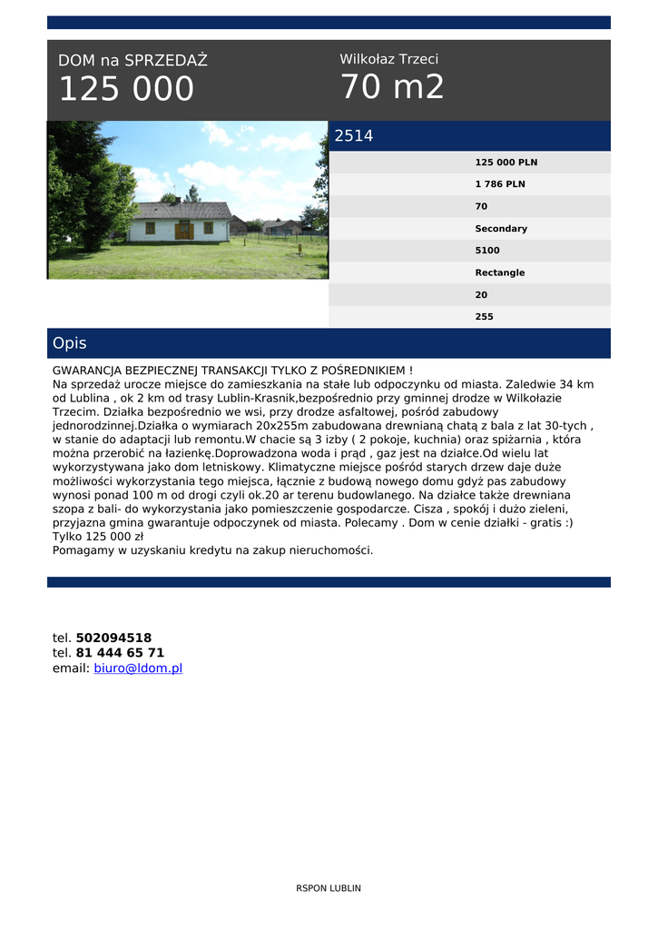 DOM na SPRZEDAŻ 125 000 Wilkołaz Trzeci 70 m2 2514 125 000 PLN 1 786 PLN 70 Secondary 5100 Rectangle 20 255 Opis GWARANCJA BEZPIECZNEJ TRANSAKCJI TYLKO Z POŚREDNIKIEM ! Na sprzedaż urocze miejsce do zamieszkania na stałe lub odpoczynku od miasta. Zaledwie 34 km od Lublina , ok 2 km od trasy Lublin-Krasnik,bezpośrednio przy gminnej drodze w Wilkołazie Trzecim. Działka bezpośrednio we wsi, przy drodze asfaltowej, pośród zabudowy jednorodzinnej.Działka o wymiarach 20x255m zabudowana drewnianą chatą z bala z lat 30-tych , w stanie do adaptacji lub remontu.W chacie są 3 izby ( 2 pokoje, kuchnia) oraz spiżarnia , która można przerobić na łazienkę.Doprowadzona woda i prąd , gaz jest na działce.Od wielu lat wykorzystywana jako dom letniskowy. Klimatyczne miejsce pośród starych drzew daje duże możliwości wykorzystania tego miejsca, łącznie z budową nowego domu gdyż pas zabudowy wynosi ponad 100 m od drogi czyli ok.20 ar terenu budowlanego. Na działce także drewniana szopa z bali- do wykorzystania jako pomieszczenie gospodarcze. Cisza , spokój i dużo zieleni, przyjazna gmina gwarantuje odpoczynek od miasta. Polecamy . Dom w cenie działki - gratis :) Tylko 125 000 zł Pomagamy w uzyskaniu kredytu na zakup nieruchomości. tel. 502094518 tel. 81 444 65 71 email: [email protected] RSPON LUBLIN Powered by TCPDF (www.tcpdf.org)
