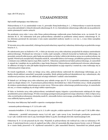 sygn. akt II K 504/14 UZASADNIENIE Sąd ustalił następujący stan faktyczny : Pokrzywdzony A. F. (1), zamieszkały w msc. S., prowadzi firmę budowlaną A- (...). Pokrzywdzony w czasie do stycznia 2014 roku zatrudniał w różnych okresach oskarżonego K. D. (1). Zatrudnienie oskarżonego odbywało się na podstawie umów pisemnych i umów ustnych. Na przełomie 2013 roku i 2014 roku firma pokrzywdzonego realizowała prace budowlane m.in. na terenie W. na zlecenie M. S.. Do wykonania tych prac pokrzywdzony zatrudnił na podstawie ustnej umowy oskarżonego K. D. (1), któremu powierzył do używania w tym czasie samochód osobowy marki A. o nr rej. (...) oraz różne narzędzia budowlane. W styczniu 2014 roku samochód, z którego korzystał oskarżony zepsuł się i oskarżony sholował go na podwórko swego kuzyna A. L.. Po zakończeniu prac na budowie w W., w dniu 30 stycznia 2014 roku oskarżony przyjechał do miejsca zamieszkania pokrzywdzonego. Przekazał mu wówczas w worku część narzędzi, z których korzystał na budowach, informując, że pozostałe zostawił sobie jeszcze, gdyż będą mu potrzebne na fuchę i odda je jak skończy pracę na co pokrzywdzony się zgodził. Wśród tych narzędzi były wkrętarka marki B., mieszadło koloru czerwonego, przedłużacz gumowy budowlany z wtykami oraz szlifierka kątowa typu fleks marki H.. Oskarżony poinformował także pokrzywdzonego, że samochód A. zepsuł się i znajduje się na podwórku u jego brata (kuzyna). Pokrzywdzony poinformował wówczas oskarżonego, że odbierze od niego to auto jak będzie dysponował pieniędzmi na jego naprawę i rozstał się z nim rozliczając się za wykonaną przez niego pracę. Po trzech tygodniach, w dniu 20 lutego 2014 roku, pokrzywdzony zadzwonił do oskarżonego informując, go, że będzie chciał odebrać samochód i pozostałe narzędzia. Kiedy później próbował skontaktować się z oskarżonym, aby zrealizować powyższe, ten nie odbierał już od niego telefonów i unikał z nim kontaktów. W dniach 22 i 26 lutego 2014 roku oskarżony przy udziale swego ojca W. D. (1) sprzedał wymieniony samochód na części na skupie złomu w D.. O powyższym pokrzywdzony dowiedział się w dniu 8 kwietnia 2014 r. kiedy przyjechał do miejsca zamieszkania oskarżonego po swoje rzeczy. Wówczas ojciec oskarżonego poinformował go, że samochodu nie ma, a w domu znajdują się od niego tablice rejestracyjne. W dniu 10 kwietnia 2014 roku pokrzywdzony zawiadomił organy ścigania o przywłaszczeniu należących do niego przedmiotów przez oskarżonego. W toku wszczętego postępowania przygotowawczego oskarżony w dniu 10 lipca 2014 roku zwrócił pokrzywdzonemu wkrętarkę marki B., mieszadło koloru czerwonego, przedłużacz budowlany z wtykami oraz szlifierkę kątową marki H.. Powyższy stan faktyczny Sąd ustalił w oparciu o następujące dowody: - zeznania pokrzywdzonego A. F. (1) k.126v-128; - zeznania świadków : J. M. k.129,32v-33 i A. L. k.128v-129,36v, a także częściowo P. S. k.148v-149 i T. M. k.188v-189v; - dokumenty : protokół zatrzymania rzeczy k.27-28, spis i opis rzeczy k.29, kserokopie przekazów pocztowych k.137-138, wydruk treści sms k.139, kserokopie faktur k.43,66, kserokopia dowodu rejestracyjnego k.66. Oskarżony K. D. (1) nie przyznał się do winy. Wyjaśnił, że pokrzywdzony nie rozliczył się z nim za wykonaną w W. pracę. Z umówionej kwoty 3.000 zł, zapłacił mu tylko 1.800 zł i pozostała dla niego jeszcze kwota 1.200 zł. Wskazał, że w czasie kiedy pracował w W. użytkował samochód A. jako samochód firmowy. Samochód ten jednak popsuł się i ściągnięty został na podwórko do jego brata. Po skończeniu pracy zawiózł pokrzywdzonemu część narzędzi, które znajdowały się w tym samochodzie. Oprócz nich miał w domu jeszcze wiertarkę, fleksę H. i przedłużacz, które potem zwrócił A. F. przy policjantce. Gdy zwracał pokrzywdzonemu narzędzia w rozmowie z nim poinformował go, że samochód się zepsuł i że znajduje się na podwórku u brata. Rozmawiał też z nim o brakującej za pracę kwocie 1.200 złotych i pokrzywdzony potwierdzał ją, ale nie miał pieniędzy, żeby mu zapłacić. Zaproponował wtedy oskarżonemu sprzedaż tego samochodu. Oskarżony mówił mu wtedy, że ma na niego kupca, na co pokrzywdzony kazał mu go sprzedać, mówiąc „bo będzie bieda” i chciał, żeby oskarżony uzyskaną ze sprzedaży kwotę zaliczył na zaległe wynagrodzenie. Oskarżony wówczas sprzedał ten samochód, ale nie sporządzał umowy, bo uzgodnił z pokrzywdzonym, że nie będzie umowy sprzedaży. Podał, że samochód został sprzedany w częściach na złom, a tablice rejestracyjne zatrzymał w domu. Sprzedał go za 1.200 złotych i zaliczył to sobie na zaległe wynagrodzenie. Oskarżony podał także, że po 30 stycznia A. F. nie zwracał się do niego o zwrot narzędzi i samochodu. On nie pojechał po sprzedaży zawiadomić o tym pokrzywdzonego, bo nie miał po co. Czekał, aż to pokrzywdzony do niego przyjedzie i zabierze tablice rejestracyjne i resztę narzędzi. Wskazał także, że gdy był w S. (...) A. F. dzwonił do jego żony, która poinformowała go, że narzędzia, których mu jeszcze nie zwrócił, są w garażu. On nie chciał tych narzędzi zatrzymać, tylko nie wiedział jak ma je zwrócić pokrzywdzonemu. Nie miał po co jechać z nimi do A. F., bo on i tak nie miał pieniędzy. (wyjaśnienia oskarżonego K. D. (1) k.124v-125v,127v,128,149) Sąd zważył, co następuje: Wyjaśnieniom oskarżonego K. D. (1), w szczególności w części, w której podał, że uzgodnił z pokrzywdzonym sprzedaż samochodu i że to pokrzywdzony kazał mu go sprzedać oraz zaliczyć kwotę sprzedaży na zaległe wynagrodzenie, Sąd nie dał wiary, uznając je za wyjątkowo kłamliwe, wykrętne i naciągane. W ocenie Sądu stanowią one jedynie nieudolną linię obrony oskarżonego mającą uwolnić go od odpowiedzialności 