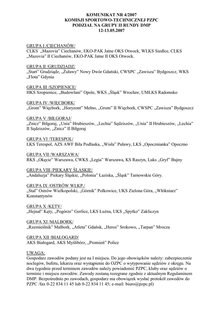 KOMUNIKAT NR 4/2007 KOMISJI SPORTOWO-TECHNICZNEJ PZPC PODZIAŁ NA GRUPY II RUNDY DMP 12-13.05.2007 GRUPA I /CIECHANÓW/ CLKS „Mazovia” Ciechanów, EKO-PAK Jatne OKS Otwock, WLKS Siedlce, CLKS „Mazovia” II Ciechanów, EKO-PAK Jatne II OKS Otwock. GRUPA II /GRUDZIADZ/ „Start” Grudziądz, „śuławy” Nowy Dwór Gdański, CWSPC „Zawisza” Bydgoszcz, WKS „Flota” Gdynia GRUPA III /SZOPIENICE/ HKS Szopienice, „Budowlani” Opole, WKS „Śląsk” Wrocław, UMLKS Radomsko GRUPA IV /WIĘCBORK/ „Grom” Więcbork, „Horyzont” Mełno, „Grom” II Więcbork, CWSPC „Zawisza” Bydgoszcz GRUPA V /BIŁGORAJ/ „Znicz” Biłgoraj, „Unia” Hrubieszów, „Lechia” Sędziszów, „Unia” II Hrubieszów, „Lechia” II Sędziszów, „Znicz” II Biłgoraj GRUPA VI /TERESPOL/ LKS Terespol, AZS AWF Biła Podlaska, „Wisła” Puławy, LKS „Opocznianka” Opoczno GRUPA VII /WARSZAWA/ RKS „Okęcie” Warszawa, CWKS „Legia” Warszawa, KS Raszyn, Luks „Gryf” Bujny GRUPA VIII /PIEKARY ŚLĄSKIE/ „Andaluzja” Piekary Śląskie, „Polonia” Łaziska, „Śląsk” Tarnowskie Góry. GRUPA IX /OSTRÓW WLKP./ „Stal” Ostrów Wielkopolski, „Górnik” Polkowice, UKS Zielona Góra, „Włókniarz” Konstantynów GRUPA X /KĘTY/ „Hejnał” Kęty, „Pogórze” Gorlice, LKS ŁuŜna, UKS „Spytko” Zakliczyn GRUPA XI /MALBORK/ „Rzemieślnik” Malbork, „Atleta” Gdańsk, „Heros” Srokowo, „Tarpan” Mrocza GRUPA XII /BIAŁOGARD/ AKS Białogard, AKS Myślibórz, „Promień” Police UWAGA: Gospodarz zawodów podany jest na I miejscu. Do jego obowiązków naleŜy: zabezpieczenie noclegów, bufetu, lekarza oraz wystąpienie do OZPC o wytypowanie sędziów z okręgu. Na dwa tygodnie przed terminem zawodów naleŜy powiadomić PZPC, kluby oraz sędziów o terminie i miejscu zawodów. Zawody zostaną rozegrane zgodnie z aktualnym Regulaminem DMP. Bezpośrednio po zawodach, gospodarz ma obowiązek wysłać protokół zawodów do PZPC /fax 0-22 834 11 45 lub 0-22 834 11 45; e-mail: [email protected])