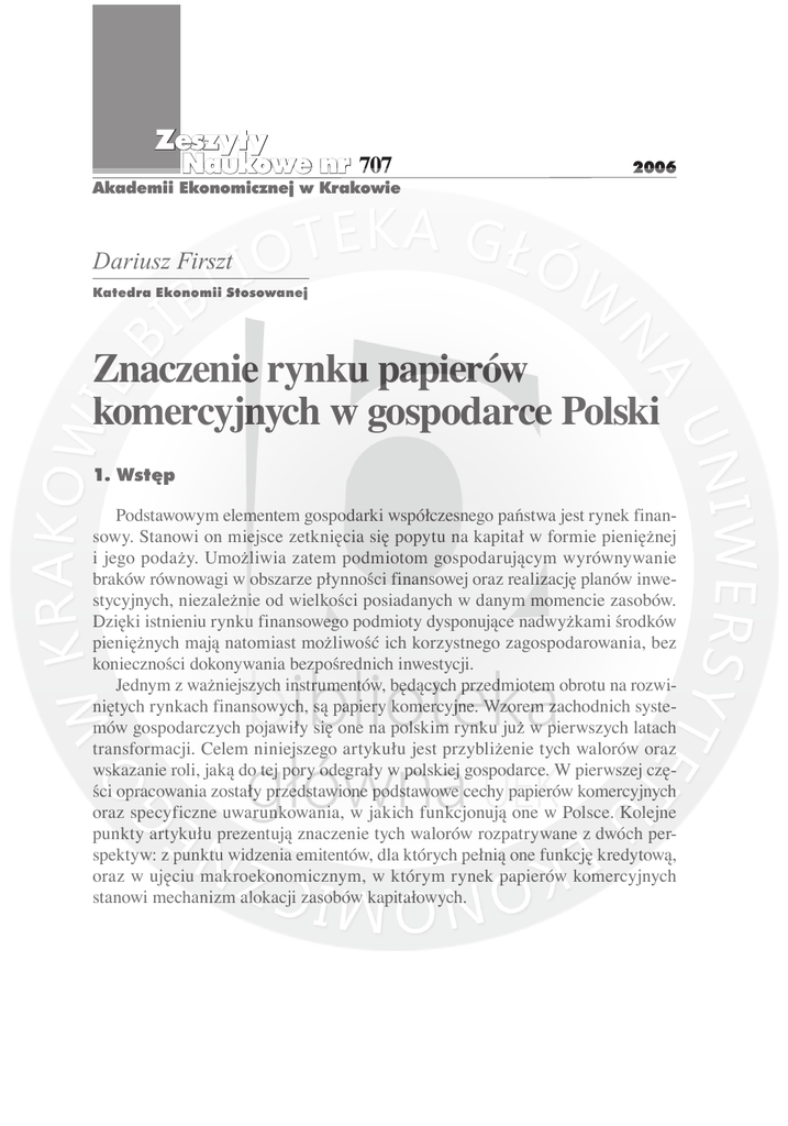 Zeszyty Naukowe nr 707 Akademii Ekonomicznej w Krakowie 2006 Dariusz Firszt Katedra Ekonomii Stosowanej Znaczenie rynku papierów komercyjnych w gospodarce Polski 1. Wstęp Podstawowym elementem gospodarki współczesnego państwa jest rynek finansowy. Stanowi on miejsce zetknięcia się popytu na kapitał w formie pieniężnej i jego podaży. Umożliwia zatem podmiotom gospodarującym wyrównywanie braków równowagi w obszarze płynności finansowej oraz realizację planów inwestycyjnych, niezależnie od wielkości posiadanych w danym momencie zasobów. Dzięki istnieniu rynku finansowego podmioty dysponujące nadwyżkami środków pieniężnych mają natomiast możliwość ich korzystnego zagospodarowania, bez konieczności dokonywania bezpośrednich inwestycji. Jednym z ważniejszych instrumentów, będących przedmiotem obrotu na rozwiniętych rynkach finansowych, są papiery komercyjne. Wzorem zachodnich systemów gospodarczych pojawiły się one na polskim rynku już w pierwszych latach transformacji. Celem niniejszego artykułu jest przybliżenie tych walorów oraz wskazanie roli, jaką do tej pory odegrały w polskiej gospodarce. W pierwszej części opracowania zostały przedstawione podstawowe cechy papierów komercyjnych oraz specyficzne uwarunkowania, w jakich funkcjonują one w Polsce. Kolejne punkty artykułu prezentują znaczenie tych walorów rozpatrywane z dwóch perspektyw: z punktu widzenia emitentów, dla których pełnią one funkcję kredytową, oraz w ujęciu makroekonomicznym, w którym rynek papierów komercyjnych stanowi mechanizm alokacji zasobów kapitałowych. 112 Dariusz Firszt 2. Pojęcie papierów komercyjnych i zasady emisji na polskim rynku Papiery komercyjne, określane w Polsce mianem krótkoterminowych papierów dłużnych przedsiębiorstw (KPD), to nie zabezpieczone, zbywalne zobowiązania pieniężne, imienne lub na okaziciela, emitowane najczęściej w formie instrumentów dyskontowych o dużych nominałach i z terminem zapadalności nie przekraczającym jednego roku. Ich rolą gospodarczą jest zapewnienie emitentom możliwości pozyskiwania kapitałów bezpośrednio z rynku pieniężnego, głównie na finansowanie działalności bieżącej, a także stwarzanie inwestorom okazji do płynnego zagospodarowania nadwyżek finansowych. Emitowane są zwykle przez duże przedsiębiorstwa o dobrej sytuacji finansowej. Przedsiębiorstwa dokonujące emisji krótkoterminowych papierów dłużnych z reguły korzystają z usług pośrednika, tzw. agenta emisji, którym najczęściej jest bank. Do jego zadań należy przygotowanie emisji, wystawienie papierów w imieniu emitenta i dotarcie z ofertą do inwestorów, czyli dystrybucja instrumentów na rynku pierwotnym. Bank występujący w roli agenta emisji z reguły zajmuje się również jej obsługą, w szczególności przechowuje wyemitowane instrumenty na rachunkach oraz dokonuje rozliczeń pieniężnych. Korzystanie z usług agenta emisji oznacza dla emitenta konieczność ponoszenia dodatkowych kosztów w postaci opłat i prowizji. W zdecydowanej większości przypadków jest to jednak tańsze niż tworzenie w firmie odrębnej komórki, zajmującej się organizowaniem i obsługą emisji. Stąd też na emisje bezpośrednie decydują się jedynie największe korporacje amerykańskie. Charakterystyczną cechą papierów komercyjnych jest tryb ich sprzedaży. Sprzedaż tych instrumentów organizowana jest w formie tzw. programów emisji, obejmujących zwykle okres od roku do kilku lat. W ramach uruchomionego programu agent emisji dokonuje sprzedaży kolejnych transz papierów komercyjnych, w zależności od aktualnych potrzeb finansowych zgłaszanych przez emitenta. Często praktykowanym sposobem pozyskiwania środków pieniężnych jest dokonywanie tzw. emisji kroczących, czyli rolowanie zaciągniętego u inwestorów długu. Metoda ta sprowadza się do tego, że zapadające transze wykupywane są ze środków uzyskanych z emisji kolejnych. W przypadku gdy również inwestor chce przedłużyć lokatę w papiery na kolejne okresy, w ramach zapłaty za zapadające Por. M. Nowak, Emisja papierów komercyjnych w Polsce, Twigger SA, Warszawa 1999, s. 17.; P. Żukowski, Commercial papers – krótkoterminowe papiery dłużne, „Bank” 1995, nr 12, s. 39. I.D. Czechowska, Zmiany ilościowe i jakościowe na rynku commercial papers ze szczegól nym uwzględnieniem roli banku, „Bank i Kredyt” 1999, nr 3, s. 21. Znaczenie rynku papierów komercyjnych… 113 instrumenty otrzymuje on inne papiery, o późniejszej dacie wykupu. Wykorzystuje się wtedy instytucję potrącenia. Historia wyżej zdefiniowanych instrumentów sięga końca XIX w., kiedy to pojawiły się one na amerykańskim rynku finansowym. Prekursorami w tym obszarze były małe firmy amerykańskie, które rozpoczęły finansowanie sezonowych zapasów poprzez emisje papierów zwanych commercial papers, pożyczając tym samym fundusze od innych przedsiębiorców z pominięciem banków. Stopniowo zalety tej formy finansowania dostrzegały duże korporacje, takie jak General Motors oraz Ford, stając się dominującymi uczestnikami rynku papierów komercyjnych i przyczyniając się do jego rozkwitu już w latach 20. ubiegłego stulecia. W latach 80. walory tego typu zaczęły zyskiwać popularność poza Stanami Zjednoczonymi. Rynki commercial papers zaczęły funkcjonować w takich krajach, jak: Francja, Szwecja, Hiszpania, Niemcy, Holandia, Wielka Brytania, Włochy, Norwegia, a także poza Europą – w Japonii, Hongkongu, Australii i Kanadzie. Obecnie papiery komercyjne zajmują znaczącą pozycję na rynkach pieniężnych w wielu krajach na całym świecie, a ich znaczenie w finansowaniu działalności podmiotów gospodarczych systematycznie wzrasta. Polski rynek papierów komercyjnych jest stosunkowo młody, gdyż funkcjonuje dopiero od 1992 r. Podstawowym bodźcem, który przyczynił się do pojawienia się krótkoterminowych papierów dłużnych 