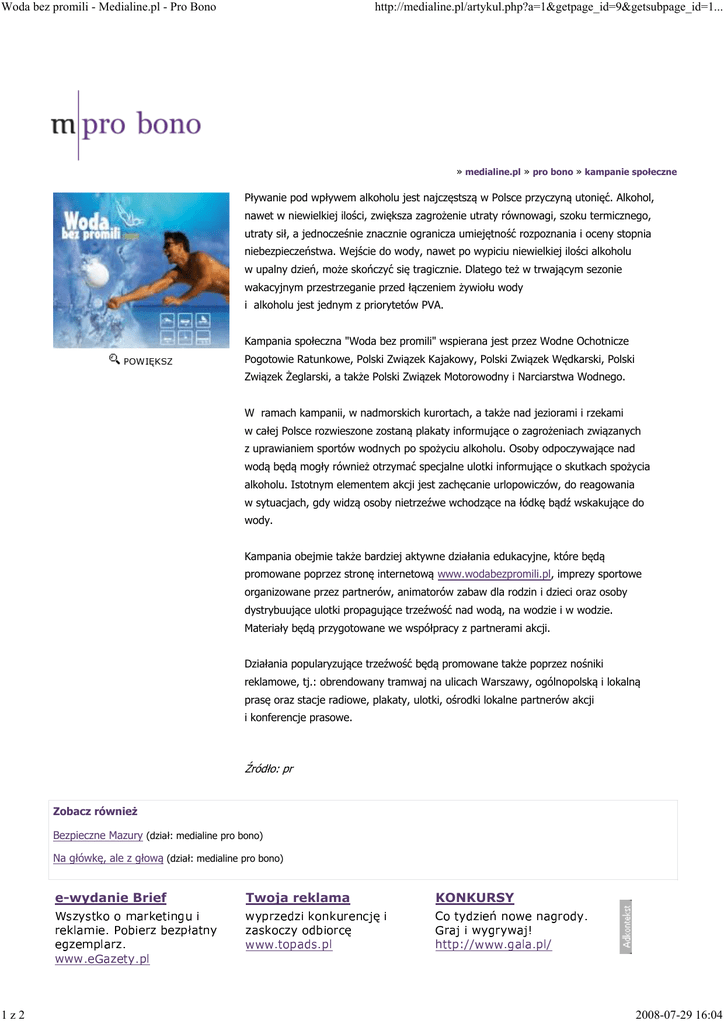 Woda bez promili - Medialine.pl - Pro Bono http://medialine.pl/artykul.php?a=1&getpage_id=9&getsubpage_id=1... » medialine.pl » pro bono » kampanie społeczne Pływanie pod wpływem alkoholu jest najczęstszą w Polsce przyczyną utonięć. Alkohol, nawet w niewielkiej ilości, zwiększa zagrożenie utraty równowagi, szoku termicznego, utraty sił, a jednocześnie znacznie ogranicza umiejętność rozpoznania i oceny stopnia niebezpieczeństwa. Wejście do wody, nawet po wypiciu niewielkiej ilości alkoholu w upalny dzień, może skończyć się tragicznie. Dlatego też w trwającym sezonie wakacyjnym przestrzeganie przed łączeniem żywiołu wody i alkoholu jest jednym z priorytetów PVA. Kampania społeczna "Woda bez promili" wspierana jest przez Wodne Ochotnicze Pogotowie Ratunkowe, Polski Związek Kajakowy, Polski Związek Wędkarski, Polski Związek Żeglarski, a także Polski Związek Motorowodny i Narciarstwa Wodnego. W ramach kampanii, w nadmorskich kurortach, a także nad jeziorami i rzekami w całej Polsce rozwieszone zostaną plakaty informujące o zagrożeniach związanych z uprawianiem sportów wodnych po spożyciu alkoholu. Osoby odpoczywające nad wodą będą mogły również otrzymać specjalne ulotki informujące o skutkach spożycia alkoholu. Istotnym elementem akcji jest zachęcanie urlopowiczów, do reagowania w sytuacjach, gdy widzą osoby nietrzeźwe wchodzące na łódkę bądź wskakujące do wody. Kampania obejmie także bardziej aktywne działania edukacyjne, które będą promowane poprzez stronę internetową www.wodabezpromili.pl, imprezy sportowe organizowane przez partnerów, animatorów zabaw dla rodzin i dzieci oraz osoby dystrybuujące ulotki propagujące trzeźwość nad wodą, na wodzie i w wodzie. Materiały będą przygotowane we współpracy z partnerami akcji. Działania popularyzujące trzeźwość będą promowane także poprzez nośniki reklamowe, tj.: obrendowany tramwaj na ulicach Warszawy, ogólnopolską i lokalną prasę oraz stacje radiowe, plakaty, ulotki, ośrodki lokalne partnerów akcji i konferencje prasowe. Źródło: pr Zobacz również Bezpieczne Mazury (dział: medialine pro bono) Na główkę, ale z głową (dział: medialine pro bono) e-wydanie Brief Twoja reklama KONKURSY ! " # $ " ! ! % & 1z2 ' ( ( ( 2008-07-29 16:04 Woda bez promili - Medialine.pl - Pro Bono http://medialine.pl/artykul.php?a=1&getpage_id=9&getsubpage_id=1... « powrót .F4wFLgU53vBOvsDRuvkfsexfZVkdeNC_RH.o6QoWfP.y7 - Pro bono - Kampanie spoleczne 2z2 2008-07-29 16:04
