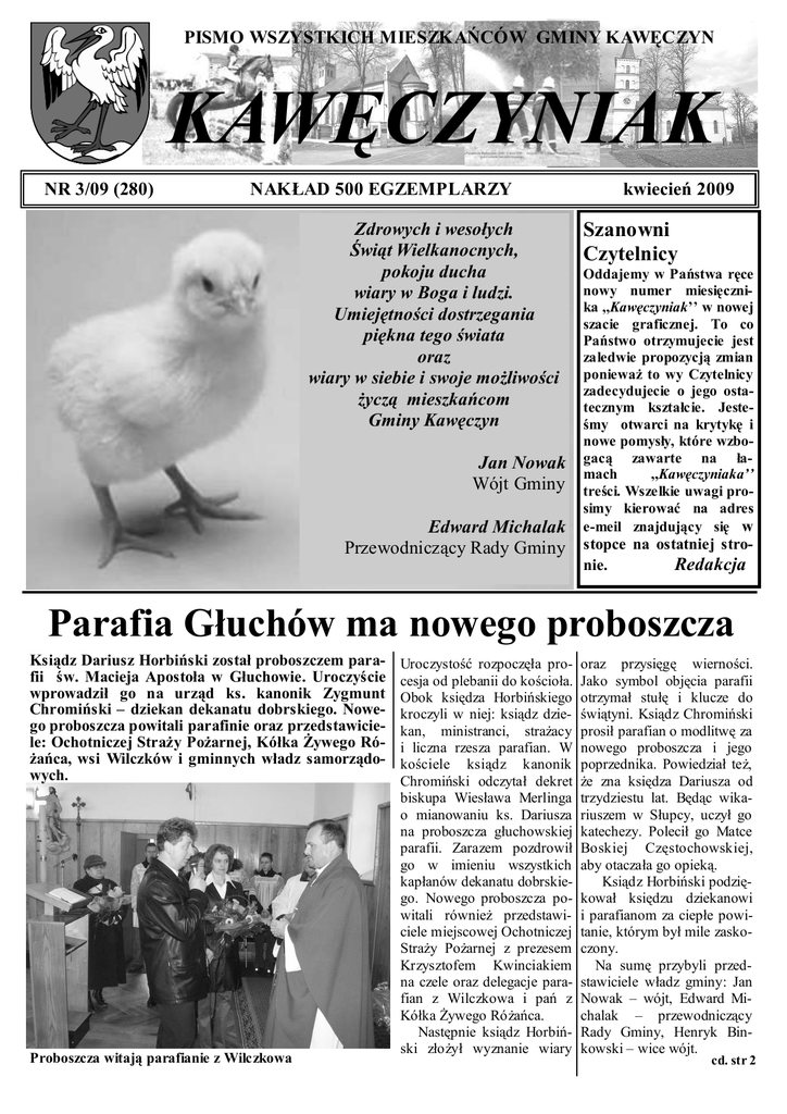 PISMO WSZYSTKICH MIESZKAŃCÓW GMINY KAWĘCZYN KAWĘCZYNIAK NR 3/09 (280) NAKŁAD 500 EGZEMPLARZY Zdrowych i wesołych Świąt Wielkanocnych, pokoju ducha wiary w Boga i ludzi. Umiejętności dostrzegania piękna tego świata oraz wiary w siebie i swoje moŜliwości Ŝyczą mieszkańcom Gminy Kawęczyn Jan Nowak Wójt Gminy kwiecień 2009 Szanowni Czytelnicy Oddajemy w Państwa ręce nowy numer miesięcznika ,,Kawęczyniak’’ w nowej szacie graficznej. To co Państwo otrzymujecie jest zaledwie propozycją zmian poniewaŜ to wy Czytelnicy zadecydujecie o jego ostatecznym kształcie. Jesteśmy otwarci na krytykę i nowe pomysły, które wzbogacą zawarte na łamach ,,Kawęczyniaka’’ treści. Wszelkie uwagi prosimy kierować na adres e-meil znajdujący się w Edward Michalak Przewodniczący Rady Gminy stopce na ostatniej stronie. Redakcja Parafia Głuchów ma nowego proboszcza Ksiądz Dariusz Horbiński został proboszczem parafii św. Macieja Apostoła w Głuchowie. Uroczyście wprowadził go na urząd ks. kanonik Zygmunt Chromiński – dziekan dekanatu dobrskiego. Nowego proboszcza powitali parafinie oraz przedstawiciele: Ochotniczej StraŜy PoŜarnej, Kółka śywego RóŜańca, wsi Wilczków i gminnych władz samorządowych. Proboszcza witają parafianie z Wilczkowa Uroczystość rozpoczęła procesja od plebanii do kościoła. Obok księdza Horbińskiego kroczyli w niej: ksiądz dziekan, ministranci, straŜacy i liczna rzesza parafian. W kościele ksiądz kanonik Chromiński odczytał dekret biskupa Wiesława Merlinga o mianowaniu ks. Dariusza na proboszcza głuchowskiej parafii. Zarazem pozdrowił go w imieniu wszystkich kapłanów dekanatu dobrskiego. Nowego proboszcza powitali równieŜ przedstawiciele miejscowej Ochotniczej StraŜy PoŜarnej z prezesem Krzysztofem Kwinciakiem na czele oraz delegacje parafian z Wilczkowa i pań z Kółka śywego RóŜańca. Następnie ksiądz Horbiński złoŜył wyznanie wiary oraz przysięgę wierności. Jako symbol objęcia parafii otrzymał stułę i klucze do świątyni. Ksiądz Chromiński prosił parafian o modlitwę za nowego proboszcza i jego poprzednika. Powiedział teŜ, Ŝe zna księdza Dariusza od trzydziestu lat. Będąc wikariuszem w Słupcy, uczył go katechezy. Polecił go Matce Boskiej Częstochowskiej, aby otaczała go opieką. Ksiądz Horbiński podziękował księdzu dziekanowi i parafianom za ciepłe powitanie, którym był mile zaskoczony. Na sumę przybyli przedstawiciele władz gminy: Jan Nowak – wójt, Edward Michalak – przewodniczący Rady Gminy, Henryk Binkowski – wice wójt. cd. str 2 Parafia Głuchów ma nowego proboszcza Przedstawicielom gminnych władz, towarzyszył Jarosław Król – prezes Stowarzyszenia Kawęczyńskie Towarzystwo Rozwoju, a zarazem lekarz rodzinny z Tokar. Księdzu proboszczowi, Ŝyczyli wszelkiej pomyślności na nowym stanowisku. Wyrazili nadzieję na dobrą współpracę proboszcza z gminnymi władzami samorządowymi. Na koniec zaśpiewali mu: śyczymy Ŝyczymy Ŝyczymy Ŝyczymy I zdrowia i szczęścia i błogosławieństwa Przez ręce Maryi. Ksiądz Dariusz Horbiński pochodzi ze Słupcy. Wyświęcony został przed siedemnastoma laty. Na początku lat dziewięćdziesiątych ubiegłego wieku był wikariuszem w parafii św. Barbary w Turku. W latach 2003-2005 był wikariuszem parafii Najświętszego Zbawiciela we Włocławku. Tam teŜ uczył religii w Gimnazjum nr 6. Z Włocławka trafił do parafii św. Dominika w Chodczu, gdzie nauczał religii w Zespole Szkół. Z tantąd przeniesiony został na swoją pierwszą samodzielną parafię do Proboszcz Horbiński z księdzem dziekanem Głuchowa Informacja o konkursie na stanowisko dyrektora W dniu 25 marca 2009 r. odbył się konkurs na stanowisko dyrektora Szkoły Podstawowej im. Jana Pawła II w Tokarach. Konkurs przeprowadziła komisja konkursowa w następującym składzie: 1. trzech przedstawicieli Gminy Kawęczyn pan Jan Nowak – Wójt Gminy Kawęczyn – przewodniczący komisji pan Henryk Binkowski – Zastępca Wójta Gminy Kawęczyn pan Janusz JeŜykowski – Radny Rady Gminy Kawęczyn 2. trzech przedstawicieli Wielkopolskiego Kuratora Oświaty: pan Paweł śebrowski – wizytator, pan Tomasz Poniecki – starszy wizytator, pani Jadwiga Kruszyna – starszy wizytator, 3. dwóch przedstawicieli Rady Pedagogicznej: pani Małgorzata Chrzuszcz, pani Katarzyna Bednarkiewicz, 4. dwóch przedstawicieli Rady Rodziców: pani ElŜbieta Janiak, pani Donata Brzezińska, 5. Przedstawiciel ZNP –pani Renata Goślińska Na konkurs wpłynęła jedna oferta pani Ewy Wojtczak Komisja w wyniku przeprowadzonego konkursu wyłoniła jako kandydata na stanowisko Dyrektora Szkoły Podstawowej im. Jana Pawła II w Tokarach panią Ewę Wojtczak- dotychczaso2 KAWĘCZYNIAK kwiecień 2009 KAWĘCZYNIAK HISTORYCZNY R ok powstania Czachulca Nowe- miecką przeniesiono na inne bardziej stanie, Ŝe umierali w drodze do Dogo jest dokładnie znany. Nastą- dostatnie tereny i do administracji brej, a następnie kościele. Stąd wozy piło to w rok po powstaniu Czachul- okupacyjnej. ich przywoŜące zajeŜdŜały od strony ca Starego, czyli w 1781 roku i to na Getto jak podają źródła historycz- wejścia głównego, a następnie podjeŜidentycznych zasadach. Nowo załoŜo- ne, powstało 20 października 1941 dŜały do zakrystii, gdzie ładowano na na, zarosła borem wieś, oddana zosta- roku po likwidacji getta w Turku. nie zmarłych. Chowano ich na kirkuła aktem nadawczym osadnikom nie- Czachulec Nowy był siedzibą jego cie (cmentarzu Ŝydowskim) połoŜomieckim. Dziedzicem, który ich tam władz. nym przy drodze do Warty. W sumie sprowadził, był Maciej na Zabłociu Od jesieni 1941 roku do lipca 1942 w tym czasie wywieziono do Dobrej Zabłocki syn Jana Zabłockiego i He- roku, przez getto przeszło od 4000 do około 1100 śydów. Pozostałych przy leny z Potockich — właściciel Skar- 6000 śydów. Byli to w większości Ŝyciu, juŜ samochodami, wywie