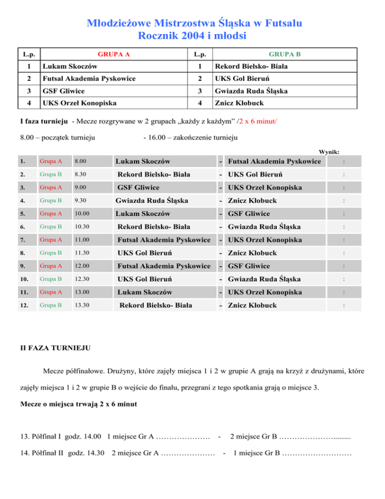 Młodzieżowe Mistrzostwa Śląska w Futsalu Rocznik 2004 i młodsi L.p. GRUPA A L.p. GRUPA B 1 Lukam Skoczów 1 Rekord Bielsko- Biała 2 Futsal Akademia Pyskowice 2 UKS Gol Bieruń 3 GSF Gliwice 3 Gwiazda Ruda Śląska 4 UKS Orzeł Konopiska 4 Znicz Kłobuck I faza turnieju - Mecze rozgrywane w 2 grupach „każdy z każdym” /2 x 6 minut/ 8.00 – początek turnieju - 16.00 – zakończenie turnieju Wynik: Lukam Skoczów - Futsal Akademia Pyskowice : 8.30 Rekord Bielsko- Biała - UKS Gol Bieruń : Grupa A 9.00 GSF Gliwice - UKS Orzeł Konopiska : 4. Grupa B 9.30 Gwiazda Ruda Śląska - Znicz Kłobuck : 5. Grupa A 10.00 Lukam Skoczów - GSF Gliwice : 6. Grupa B 10.30 Rekord Bielsko- Biała - Gwiazda Ruda Śląska : 7. Grupa A 11.00 Futsal Akademia Pyskowice - UKS Orzeł Konopiska : 8. Grupa B 11.30 UKS Gol Bieruń - Znicz Kłobuck : 9. Grupa A 12.00 Futsal Akademia Pyskowice - GSF Gliwice : 10. Grupa B 12.30 UKS Gol Bieruń - Gwiazda Ruda Śląska : 11. Grupa A 13.00 Lukam Skoczów - UKS Orzeł Konopiska : 12. Grupa B 13.30 Rekord Bielsko- Biała - Znicz Kłobuck : 1. Grupa A 8.00 2. Grupa B 3. II FAZA TURNIEJU Mecze półfinałowe. Drużyny, które zajęły miejsca 1 i 2 w grupie A grają na krzyż z drużynami, które zajęły miejsca 1 i 2 w grupie B o wejście do finału, przegrani z tego spotkania grają o miejsce 3. Mecze o miejsca trwają 2 x 6 minut 13. Półfinał I godz. 14.00 1 miejsce Gr A ………………… 14. Półfinał II godz. 14.30 2 miejsce Gr A ………………… - 2 miejsce Gr B …………………......... - 1 miejsce Gr B ……………………… 15. Mecz o miejsce 3 godz. 15.00 Przegrany z półfinału I ………………………… - Przegrany z półfinału II ………………………… 16. Mecz finałowy o miejsce 1 godz. 15.30 Wygrany z półfinału I ……………………… - Wygrany z półfinału II ...................................... Ceremonia zakończenia połączona z uroczystym wręczeniem pucharów, dyplomów i nagród wszystkim uczestnikom turnieju około godziny 16.00