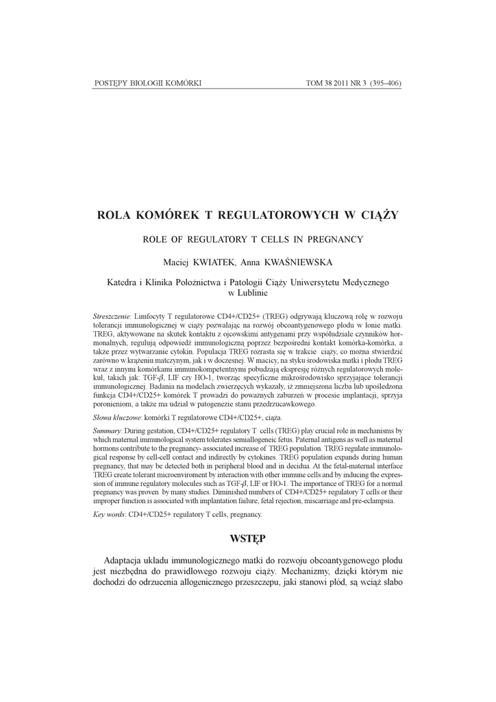 tak¿e przez wytwarzanie cytokin. Populacja TREG rozrasta siê w trakcie ci¹¿y, co mo¿na stwierdziæ