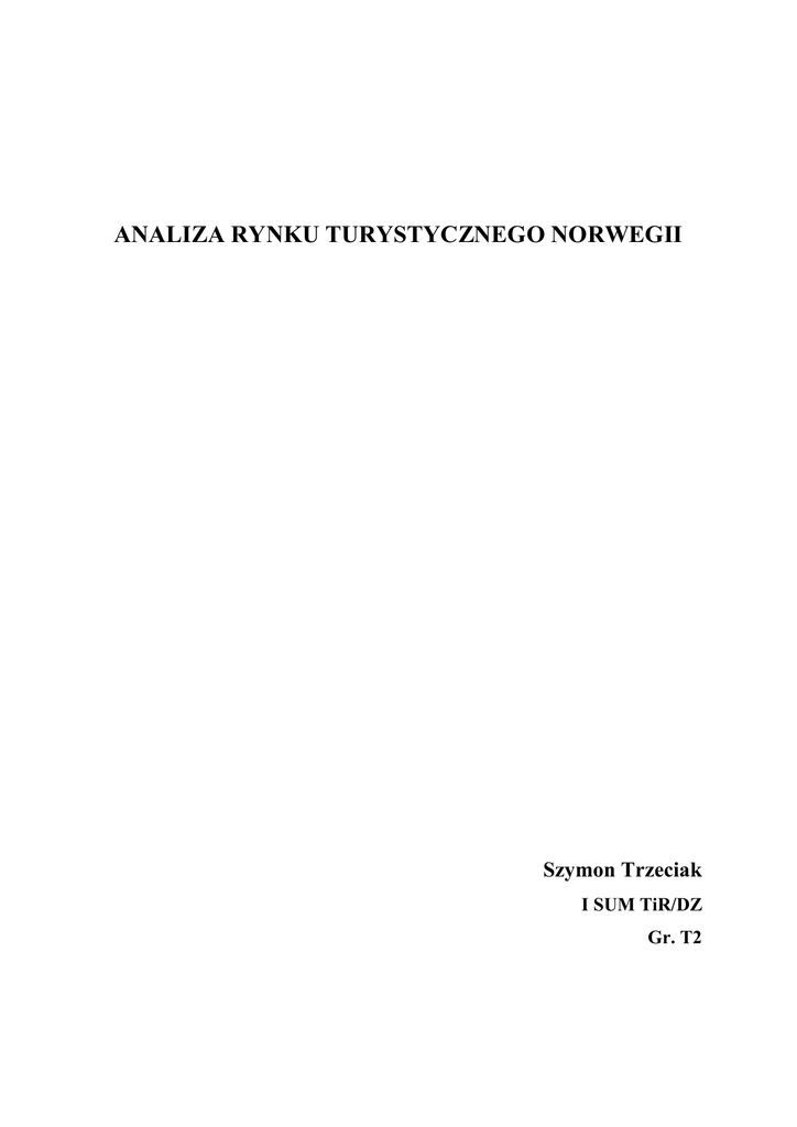 ANALIZA RYNKU TURYSTYCZNEGO NORWEGII Szymon Trzeciak I SUM TiR/DZ Gr. T2 Spis treści: I. 1. INFORMACJE OGÓLNE Wprowadzenie............................................................................................................4 1.1. Dane statystyczne.....................................................................................4 1.2. Dane gospodarcze.....................................................................................5 1.3. Dane geograficzne, regiony administracyjne............................................6 2. Warunki rozwoju turystyki w Norwegii, kultura, zabytki, atrakcje turystyczne......10 2.1. Norweskie szlaki turystyczne.................................................................13 II. 1. ANALIZA RYNKU TURYSTYCZNEGO Rynek recepcji turystycznej......................................................................................14 1.1. Wielkość przyjazdów do Norwegii...........................................................14 1.2. Kraje emitujące turystów do Norwegii......................................................15 1.3. Dochody z Turystyki przyjazdowej w wybranych krajach Europy..........16 1.4. Cele przyjazdów turystów do Norwegii....................................................16 1.5. Najczęściej odwiedzane rejony Norwegii w 2005 r..................................17 2. Rynek emisji turystycznej...........................................................................................18 2.1. Liczba podróŜujących Norwegów.............................................................18 2.2. Najczęściej odwiedzane kraje przez Norwegów.......................................19 2.3. Charakterystyka wiekowa podróŜujących Norwegów...............................20 2.4. PodróŜe Norwegów wg płci w 2006 r.......................................................20 2.5. Miesiące, w których Norwegowie podróŜują.............................................21 2.6. Najchętniej wybierane zakwaterowanie podróŜujących Norwegów..........22 2.7. BranŜa turystyczna w Norwegii..................................................................23 2.8. Targi turystyczne w Norwegii....................................................................24 III. ZNACZENIE RYNKU TURYSTYCZNEGOI NORWEGII DLA POLSKI 1. Liczba przyjazdów wybranych turystów europejskich z uwzględnieniem Norwegów..................................................................................................25 2. Zakwaterowanie Norwegów w Polsce..................................................... 26 IV. PODSUMOWANIE..................................................................................27 Bibliografia, spis tabel, rycin i fotografii............................................................29 2 Ryc.1 Flaga Norwegii Ryc. 2 Godło Norwegii Źródło: wikipedia.com (15-05-08) 3 I. INFORMACJE OGÓLNE 1.Wprowadzenie Historia-Pierwsi ludzie na terenach obecnej Norwegii osiedlili się tu juŜ w czasach prehistorii. DuŜy wpływ na to osiedlenie miało wycofanie się lodowca po ostatnim zlodowaceniu. Pierwsi Norwegowie osiedlali się w małych grupach i głównie zajmowali się myślistwem. Zajmowali się równieŜ swoistą sztuką, której przykłady moŜna znaleźć praktycznie na całym obszarze współczesnej Norwegii. Kraj ten przyjął chrzest w 994 r. MoŜna powiedzieć, Ŝe państwo to powstało na nowo w 1814 r. po przyjęciu nowej konstytucji i nie przyjęciu przekazania terytorium Norwegii pod panowanie Szwecji. Mimo tego wielokrotnie musiało walczyć o swoje przetrwanie i pozycję w Europie. RównieŜ gospodarka notowała szereg wahań: kryzys ekonomiczny, zerwanie rynku z Danią oraz ograniczenie eksportu drewna do Wielkiej Brytanii co powodowało bankructwo wielu przedsiębiorców. Historia Norwegii i Polski łączy się ponad tysiąc lat temu w okresie wprowadzania chrześcijaństwa na te tereny. Ta historia nigdy nie była konfliktowa, a patrząc w dziejewielokroć sojusznicza. W czasach II Wojny Światowej Norwegia nie uniknęła okupacji hitlerowskiej. Po zakończeniu wojny w roku 1949, zrzekła się neutralności i wstąpiła do NATO. Tereny Skandynawii są bogate w naturalne złoŜa energetyczne co zostało odpowiednio wykorzystane i zagospodarowane przez Norwegów. Co więcej, w sposób znaczący przyczyniło się do bardzo dynamicznego rozwoju tego państwa. Na ziemiach norweskich znajdują się liczne mogiły Polaków tam poległych w czasie wojny, a w czasach powojennych wzniesiono tam kilka pomników ku czci tych Ŝe Polaków. 1.1 Dane statystyczne Królestwo Norwegii obejmuje zachodnie i północne części Półwyspu Skandynawskiego oraz północne terytoria archipelagu Jan Mayer i Svalbard, a na półkuli południowej równieŜ Wyspę Bouveta, Wyspę Piotra I oraz Ziemię Królowej Maud. Od wschodu Norwegia graniczy ze Szwecją, Finlandią i Rosją, a od strony północnej, zachodniej i południowej oblewają ją wody Morza Barentsa, Morza Norweskiego i Morza Północnego. Nazwa: Norwegia. UwaŜa się, Ŝe nazwa „Norwegia” znaczy „Droga na Północ”. Stolica: Oslo (548,617 mieszkańców w 2007) Powierzchnia: 324,220 km² (bez Svalbardu i wysp Jan Mayen). Pod względem wielkości masywu lądowego Norwegia jest szóstym krajem w Europie. Długość linii brzegowej: łącznie z fiordami i zatokami, przekracza 25.000 km (więcej niŜ linia brzegowa USA!) 4 Ludność: 4,681,134 (2007). Pod względem liczby mieszkańców Norwegia zajmuje 28 miejsce. Gęstość zaludnienia: 14 osoby/km2 Ustrój: monarchia parlamentarna Podział administracyjny: 19 okręgów (fylke) i miasto wydzielone Oslo; do Norweii naleŜą archipelag Spitsbergen, wyspy Niedźwiedzia i Jan Mayen na Morzu Arktycznym oraz wyspy Bouveta i Piotra I w Arktyce Język urzędowy: norweski (Bokmål i Nynorsk) oraz język saami w sześciu gminach Finnmarku. Jednostka monetarna: 1 korona norweska = 100 ore Grupy etniczno - rasowe: Norwegowie (96,6%), Duńczycy (0,4