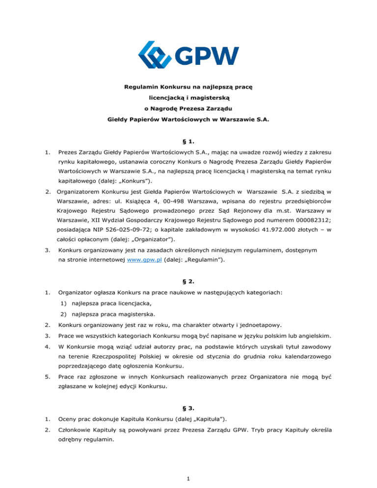 Regulamin Konkursu na najlepszą pracę licencjacką i magisterską o Nagrodę Prezesa Zarządu Giełdy Papierów Wartościowych w Warszawie S.A. § 1. 1. Prezes Zarządu Giełdy Papierów Wartościowych S.A., mając na uwadze rozwój wiedzy z zakresu rynku kapitałowego, ustanawia coroczny Konkurs o Nagrodę Prezesa Zarządu Giełdy Papierów Wartościowych w Warszawie S.A., na najlepszą pracę licencjacką i magisterską na temat rynku kapitałowego (dalej: „Konkurs”). 2. Organizatorem Konkursu jest Giełda Papierów Wartościowych w Warszawie S.A. z siedzibą w Warszawie, adres: ul. Książęca 4, 00-498 Warszawa, wpisana do rejestru przedsiębiorców Krajowego Rejestru Sądowego prowadzonego przez Sąd Rejonowy dla m.st. Warszawy w Warszawie, XII Wydział Gospodarczy Krajowego Rejestru Sądowego pod numerem 000082312; posiadająca NIP 526-025-09-72; o kapitale zakładowym w wysokości 41.972.000 złotych – w całości opłaconym (dalej: „Organizator”). 3. Konkurs organizowany jest na zasadach określonych niniejszym regulaminem, dostępnym na stronie internetowej www.gpw.pl (dalej: „Regulamin”). § 2. 1. Organizator ogłasza Konkurs na prace naukowe w następujących kategoriach: 1) najlepsza praca licencjacka, 2) najlepsza praca magisterska. 2. Konkurs organizowany jest raz w roku, ma charakter otwarty i jednoetapowy. 3. Prace we wszystkich kategoriach Konkursu mogą być napisane w języku polskim lub angielskim. 4. W Konkursie mogą wziąć udział autorzy prac, na podstawie których uzyskali tytuł zawodowy na terenie Rzeczpospolitej Polskiej w okresie od stycznia do grudnia roku kalendarzowego poprzedzającego datę ogłoszenia Konkursu. 5. Prace raz zgłoszone w innych Konkursach realizowanych przez Organizatora nie mogą być zgłaszane w kolejnej edycji Konkursu. § 3. 1. Oceny prac dokonuje Kapituła Konkursu (dalej „Kapituła”). 2. Członkowie Kapituły są powoływani przez Prezesa Zarządu GPW. Tryb pracy Kapituły określa odrębny regulamin. 1 3. Przy ocenie prac pod uwagę brany jest jej poziom merytoryczny, a w szczególności: oryginalność, sposób analizy zjawisk związanych z tematem pracy, zakres zrealizowanych badań, samodzielność i innowacyjność formułowanych wniosków, a także dobór źródeł bibliograficznych i poprawność językowa. 4. Decyzja Kapituły jest ostateczna i nie przysługuje od niej odwołanie. 5. Konkurs zostanie rozstrzygnięty na zasadzie anonimowości. Członkom Kapituły zostaną zaprezentowane zakodowane prace. § 4. 1. O przyznanie nagrody za prace licencjackie i magisterskie mogą wystąpić wyłącznie ich autorzy. 2. Zgłoszenie pracy na Konkurs wymaga złożenia w terminie do 30 czerwca każdego roku: 1) wypełnionego formularza zawierającego imię i nazwisko autora, adres do korespondencji z autorem, jego telefon i adres poczty elektronicznej; 2) oświadczenia autora, zgodnie z wzorem stanowiącym Załącznik nr 1 do Regulaminu, w którym wyraża on zgodę na przechowywanie i przetwarzanie danych osobowych dla potrzeb Konkursu oraz akceptuje treść Regulaminu; 3) kopii dokumentu potwierdzającego nadanie, w oparciu o zgłoszoną pracę, tytułu zawodowego (licencjata, magistra), wraz z datą jego nadania, nazwiskiem promotora oraz nazwą jednostki uprawnioną do nadania stopnia; 4) jednego egzemplarza pracy oraz streszczenia w wersji papierowej i w postaci pliku w formacie PDF na nośniku elektronicznym (płyta CD/DVD); 5) zwięzłej opinii promotora na temat pracy oraz zgody promotora na przetwarzanie danych osobowych oraz opublikowanie imienia i nazwiska promotora w przypadku pracy nagrodzonej w Konkursie (Załącznik nr 2 do Regulaminu). 3. Zgłoszenie, opisane jako „Praca na Konkurs”, powinno nastąpić w podanym terminie w siedzibie GPW (w Kancelarii GPW) lub pocztą. Decyduje data stempla pocztowego. 4. Organizator nie zwraca nadesłanych prac. Organizator zobowiązuje się, że nie wykorzysta prac, które nie zostały nagrodzone. 5. Prace konkursowe niespełniające warunków określonych w Regulaminie nie zostaną dopuszczone do Konkursu. § 5. 1. Autorzy najlepszych prac magisterskich otrzymują nagrody: 1) za najlepszą pracę magisterską - nagroda pieniężna w wysokości 5.000 zł (słownie: pięć tysięcy złotych); 2) za dwie kolejne, wyróżnione prace magisterskie - wyróżnienie niepieniężne. 2. Autorzy najlepszych prac licencjackich otrzymują nagrody: 1) za najlepszą pracę licencjacką - nagroda pieniężna w wysokości 3.000 zł (słownie: trzy tysiące złotych) oraz bezpłatny staż na GPW; 2 2) za dwie kolejne, wyróżnione prace licencjackie - bezpłatny staż na GPW. 3. Bezpłatny staż, o którym mowa w ust. 2 realizowany będzie na podstawie odrębnej umowy zawartej pomiędzy Organizatorem a nagrodzonym. 4. Ponadto Kapituła przyznaje dyplomy dla promotorów nagrodzonych prac. 5. Kapituła może zaproponować Organizatorowi inny podział nagród bądź odstąpić od przyznania którejkolwiek z nagród. 6. Nagrody pieniężne wskazane w ust. 1-2 zostaną wypłacone po pomniejszeniu o podatek, który Organizator zobowiązany jest pobrać zgodnie z ustawą o podatku dochodowym od osób fizycznych. 7. Zwycięzcy Konkursu zostaną poinformowani o przyznaniu nagrody przez Organizatora na podany w Załączniku nr 1 adres e-mail bądź telefonicznie. § 6. 1. Ogłoszenie wyników Konkursu oraz wręczenie nagród następuje w IV kwartale roku kalendarzowego, w którym dana edycja Konkursu jest przeprowadzona. 2. Lista laureatów oraz termin uroczystego wręczenia nagród podawane są do publicznej wiadomości przez zamieszczenie na stronie internetowej (www.gpw.pl). 3. Organizator Konkursu zastrzega sobie prawo do opublikowania imienia, nazwiska i informacji o zwycięzcy Konkursu, promotorze, a także nadesłanej przez niego pracy oraz umieszczenia tych informacji w materiałach reklamowych Organizatora, w mediach i w Internecie. § 7. 1. Uczestnicy Konkursu, przystępując d