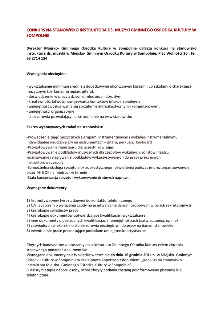 KONKURS NA STANOWISKO INSTRUKTORA DS. MUZYKI GMINNEGO OŚRODKA KULTURY W SOMPOLNIE Dyrektor Miejsko- Gminnego Ośrodka Kultury w Sompolnie ogłasza konkurs na stanowisko instruktora ds. muzyki w Miejsko- Gminnym Ośrodku Kultury w Sompolnie, Plac Wolności 26 , tel. 63 2714 134 Wymagania niezbędne: - wykształcenie minimum średnie z dodatkowymi ukończonymi kursami lub szkołami o charakterze muzycznym (perkusja, fortepian, gitara), - doświadczenie w pracy z dziećmi, młodzieżą i dorosłymi - kreatywność, łatwość nawiązywania kontaktów interpersonalnych - umiejętność posługiwania się sprzętem elektroakustycznym i komputerowym , - umiejętności organizacyjne - stan zdrowia pozwalający na zatrudnienie na w/w stanowisku Zakres wykonywanych zadań na stanowisku: -Prowadzenie zajęć muzycznych z grupami instrumentalnymi i wokalno-instrumentalnymi, indywidualne nauczanie gry na instrumentach – gitara, perkusja, keyboard -Przygotowywanie repertuaru dla uczestników zajęć, -Przygotowywanie podkładów muzycznych dla zespołów wokalnych, solistów i teatru, -aranżowanie i nagrywanie podkładów wykorzystywanych do pracy przez innych instruktorów i zespoły. -Samodzielna obsługa sprzętu elektroakustycznego i oświetlenia podczas imprez organizowanych przez M- GOK na miejscu i w terenie -Stała konserwacja sprzętu i wykonywanie drobnych napraw. Wymagane dokumenty: 1) list motywacyjny (wraz z danymi do kontaktu telefonicznego) 2) C.V. z zapisem o wyrażeniu zgody na przetwarzanie danych osobowych w celach rekrutacyjnych 3) kserokopie świadectw pracy 4) kserokopie dokumentów potwierdzające kwalifikacje i wykształcenie 5) inne dokumenty o posiadanych kwalifikacjach i umiejętnościach (zaświadczenia, opinie) 7) zaświadczenie lekarskie o stanie zdrowia niezbędnym do pracy na danym stanowisku 8) ewentualnie prace prezentujące posiadane umiejętności artystyczne Chętnych kandydatów zapraszamy do sekretariatu Gminnego Ośrodka Kultury celem złożenia stosownego podania i dokumentów. Wymagane dokumenty należy składać w terminie do dnia 16 grudnia 2011 r. w Miejsko- Gminnym Ośrodku Kultury w Sompolnie w zaklejonych kopertach z dopiskiem: „Konkurs na stanowisko instruktora Miejsko- Gminnego Ośrodka Kultury w Sompolnie”. O dalszym etapie naboru osoby, które złożyły podania zostaną poinformowane pisemnie lub telefonicznie.