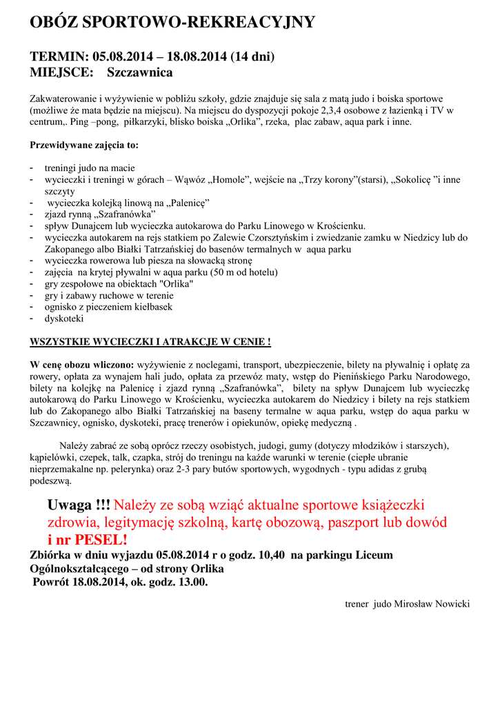 OBÓZ SPORTOWO-REKREACYJNY TERMIN: 05.08.2014 – 18.08.2014 (14 dni) MIEJSCE: Szczawnica Zakwaterowanie i wyżywienie w pobliżu szkoły, gdzie znajduje się sala z matą judo i boiska sportowe (możliwe że mata będzie na miejscu). Na miejscu do dyspozycji pokoje 2,3,4 osobowe z łazienką i TV w centrum,. Ping –pong, piłkarzyki, blisko boiska „Orlika”, rzeka, plac zabaw, aqua park i inne. Przewidywane zajęcia to: - treningi judo na macie wycieczki i treningi w górach – Wąwóz „Homole”, wejście na „Trzy korony”(starsi), „Sokolicę ”i inne szczyty wycieczka kolejką linową na „Palenicę” zjazd rynną „Szafranówka” spływ Dunajcem lub wycieczka autokarowa do Parku Linowego w Krościenku. wycieczka autokarem na rejs statkiem po Zalewie Czorsztyńskim i zwiedzanie zamku w Niedzicy lub do Zakopanego albo Białki Tatrzańskiej do basenów termalnych w aqua parku wycieczka rowerowa lub piesza na słowacką stronę zajęcia na krytej pływalni w aqua parku (50 m od hotelu) gry zespołowe na obiektach "Orlika" gry i zabawy ruchowe w terenie ognisko z pieczeniem kiełbasek dyskoteki WSZYSTKIE WYCIECZKI I ATRAKCJE W CENIE ! W cenę obozu wliczono: wyżywienie z noclegami, transport, ubezpieczenie, bilety na pływalnię i opłatę za rowery, opłata za wynajem hali judo, opłata za przewóz maty, wstęp do Pienińskiego Parku Narodowego, bilety na kolejkę na Palenicę i zjazd rynną „Szafranówka”, bilety na spływ Dunajcem lub wycieczkę autokarową do Parku Linowego w Krościenku, wycieczka autokarem do Niedzicy i bilety na rejs statkiem lub do Zakopanego albo Białki Tatrzańskiej na baseny termalne w aqua parku, wstęp do aqua parku w Szczawnicy, ognisko, dyskoteki, pracę trenerów i opiekunów, opiekę medyczną . Należy zabrać ze sobą oprócz rzeczy osobistych, judogi, gumy (dotyczy młodzików i starszych), kąpielówki, czepek, talk, czapka, strój do treningu na każde warunki w terenie (ciepłe ubranie nieprzemakalne np. pelerynka) oraz 2-3 pary butów sportowych, wygodnych - typu adidas z grubą podeszwą. Uwaga !!! Należy ze sobą wziąć aktualne sportowe książeczki zdrowia, legitymację szkolną, kartę obozową, paszport lub dowód i nr PESEL! Zbiórka w dniu wyjazdu 05.08.2014 r o godz. 10,40 na parkingu Liceum Ogólnokształcącego – od strony Orlika Powrót 18.08.2014, ok. godz. 13.00. trener judo Mirosław Nowicki