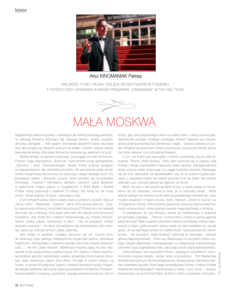 felieton Artur KINOMANIAK Pietras WIELBICIEL FILMU I MLEKA. OGLĄDA SIEDEM FILMÓW W TYGODNIU, A POTEM O NICH OPOWIADA W SWOIM PROGRAMIE „KINOMANIAK” W TV4 I NIE TYLKO. Najwybitniejsi światowi reżyserzy i scenarzyści jak mantrę powtarzają wewnętrzny dekalog filmowca dotyczący tak zwanego tematu: śmierć, przyjaźń, zbrodnia, pieniądze… Jeśli uważny kinomaniak przypomni sobie ukochane filmy albo przyjrzy się obrazom uznanym za wielkie i wybitne, zawsze odkryje takie właśnie tematy, które przez filmowców nazywane są „większymi niż życie”. Wielkie tematy od zawsze inspirowały i przyciągały nie tylko filmowców. Picasso i jego antywojenna „Guernica”, ostre protest songi Springsteena, „Zbrodnia i kara” Dostojewskiego. Nawet moda próbuje podążać za najważniejszymi dla człowieka emocjami. Ale jest jeszcze jeden temat, chyba najważniejszy dla twórców, bo dotyczący całego naszego życia. Czy pamiętacie wielkie i niezwykłe uczucie, które narodziło się na pokładzie filmowego „Titanica”? Pamiętacie delikatny uśmiech Ingrid Bergman w zadymionej knajpie gdzieś w Casablance? A Rhett Butler i Scarlett O'Hara, którzy przeminęli z wiatrem? To miłość, bez której nic nie może istnieć. Temat większy niż życie i upływający czas… Z tym tematem polscy twórcy radzili sobie w przeróżny sposób. Były już „Noce i dnie”, „Trędowata”, „Znachor”, ale to filmy sprzed wielu lat... Czyżby współcześni filmowcy nie potrafili nas poruszyć? Polskie kino nie najlepiej obchodzi się z miłością, która bywa tylko tłem dla stanów emocjonalnych bohaterów. Jest „Krótki film o miłości” Kieślowskiego, są „Historie miłosne” Stuhra, niezbyt udana „Samotność w sieci”… Ale na szczęście „miłość wszystko zwycięży” i my także doczekaliśmy się melodramatu, który wzruszy, zaskoczy, wzbudzi śmiech, płacz, tęsknotę. Jeśli byłaby to powieść, mogłaby zaczynać się od: „Dawno temu do dziwnego kraju pełnego barbarzyńców przyjechała piękna, złotowłosa księżniczka. Zamieszkała w warownej twierdzy otoczonej morzem biednych ludzi…”. Ale film „Mała Moskwa” Waldemara Krzystka bajką nie jest, więc reżyser snuje swoją historię zupełnie inaczej. Do Legnicy, w której stacjonował potężny garnizon radzieckiego wojska, przyjeżdża młody kapitan lotnictwa i jego zjawiskowo piękna żona Wiera. Początki w nowym miejscu są trudne, w ponad 50-tysięcznej Legnicy mieszka kilkanaście tysięcy Rosjan, ale władze radzieckie absolutnie zakazują prywatnych kontaktów z Polakami. Nad porządkiem i rosyjską „czystością” czuwają oficerowie polityczni. Ale co 78 WITTCHEN zrobić, gdy żona radzieckiego lotnika na wielkim balu z okazji rewolucji październikowej poznaje młodego polskiego oficera? Najpierw po rosyjsku śpiewa piękną piosenkę Ewy Demarczyk i nagle… zaczyna śpiewać po polsku. Rosjanie są zaskoczeni, Polacy zachwyceni, a porucznik Michał Janicki nie może oderwać oczu od pięknej Rosjanki… O tym, jak trudno jest opowiadać o miłości, przekonało się już wielu reżyserów. Twórca „Małej Moskwy”, który sam wychował się w Legnicy, całą historię i intrygę poprowadził w klasyczny wręcz sposób. Zaangażował bez reszty uczucia widza, proponując mu ciągłą huśtawkę nastojów. Wybierając się do kina, absolutnie nie spodziewałem się, że ta polsko-rosyjska opowieść o zakazanej miłości tak bardzo przykuje mnie do fotela. Nie pozwoli oderwać oczu i poruszy gdzieś tak głęboko, aż do łez… Wiem, że wielu z nas wstydzi się takich uczuć, a nawet uważa, że nie powinno się ich okazywać, również w kinie, że to niemodny temat… Może właśnie dlatego nie mieliśmy od tak wielu lat prawdziwego melodramatu, który mógłby zawalczyć o nasze uczucia, obok „Titanica”, „Uwierz w ducha” czy „Pożegnania z Afryką”. Pokochaliśmy plastikowy i sztuczny świat polskich komedii romantycznych, które przecież niewiele mają wspólnego z miłością… To przedziwne, że nasi filmowcy stronią od melodramatu, a widzowie po raz kolejny oglądają… „Titanica”. A może filmy o miłości to gorszy gatunek sztuki filmowej? Takie wrażenie odniosłem właśnie na Festiwalu Filmów Fabularnych w Gdyni, gdzie poważni krytycy, kiedy już otarli ukradkiem łzy, zaczęli głosić, że są ważniejsze tematy niż zwykła miłość, nawet jeśli jest tak dramatyczna… Na szczęście „Mała Moskwa” pokonała te stereotypy i zdobyła główną nagrodę festiwalu – Złote Lwy. Współczuję tym wszystkim, którzy szukając czegoś głębokiego i wstrząsającego, co zdiagnozuje współczesnego człowieka i jego pogmatwany świat, odrzucają na bok całą tę banalną miłość. „Mała Moskwa” jest niezwykłym filmem, ukazującym przedziwne i złożone polsko-rosyjskie związki – kiedyś, teraz, w przyszłości… Film Waldemara Krzystka jest w pewnym sensie ponadczasowy, dotyka prawdy i kłamstwa w bardzo uniwersalny sposób. Równolegle opowiada dwie historie: o miłości w Małej Moskwie lat sześćdziesiątych i współczesną, tu i teraz, o ojcu i córce… I proszę, nie pozwólcie, by ktoś wmówił Wam, że filmy o miłości są banalne i niemodne. Fot. Urszula Pietrala MAŁA MOSKWA