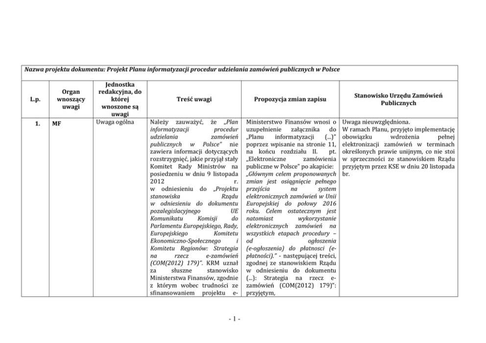 Nazwa projektu dokumentu: Projekt Planu informatyzacji procedur udzielania zamówień publicznych w Polsce L.p. 1. Organ wnoszący uwagi MF Jednostka redakcyjna, do której wnoszone są uwagi Uwaga ogólna Treść uwagi Propozycja zmian zapisu Należy zauważyć, że „Plan informatyzacji procedur udzielania zamówień publicznych w Polsce” nie zawiera informacji dotyczących rozstrzygnięć, jakie przyjął stały Komitet Rady Ministrów na posiedzeniu w dniu 9 listopada 2012 r. w odniesieniu do „Projektu stanowiska Rządu w odniesieniu do dokumentu pozalegislacyjnego UE Komunikatu Komisji do Parlamentu Europejskiego, Rady, Europejskiego Komitetu Ekonomiczno-Społecznego i Komitetu Regionów: Strategia na rzecz e-zamówień (COM(2012) 179)”. KRM uznał za słuszne stanowisko Ministerstwa Finansów, zgodnie z którym wobec trudności ze sfinansowaniem projektu e- Ministerstwo Finansów wnosi o uzupełnienie załącznika do „Planu informatyzacji (...)” poprzez wpisanie na stronie 11, na końcu rozdziału II. pt. „Elektroniczne zamówienia publiczne w Polsce” po akapicie: „Głównym celem proponowanych zmian jest osiągnięcie pełnego przejścia na system elektronicznych zamówień w Unii Europejskiej do połowy 2016 roku. Celem ostatecznym jest natomiast wykorzystanie elektronicznych zamówień na wszystkich etapach procedury – od ogłoszenia (e-ogłoszenia) do płatnosci (epłatności).” - następującej treści, zgodnej ze stanowiskiem Rządu w odniesieniu do dokumentu (...): Strategia na rzecz ezamówień (COM(2012) 179)”: przyjętym, -1- Stanowisko Urzędu Zamówień Publicznych Uwaga nieuwzględniona. W ramach Planu, przyjęto implementację obowiązku wdrożenia pełnej elektronizacji zamówień w terminach określonych prawie unijnym, co nie stoi w sprzeczności ze stanowiskiem Rządu przyjętym przez KSE w dniu 20 listopada br. zamówień, Polska powinna popierać inicjatywę KE dotyczącą tworzenia systemu elektronicznych zamówień publicznych tylko wówczas, gdy tworzenie takiego systemu będzie nieobligatoryjne. -2- po decyzji Komitetu Rady Ministrów, przez Komitet do Spraw Europejskich: „Należy zauważyć, że w „Stanowisku Rządu w odniesieniu do dokumentu pozalegislacyjnego UE Komunikatu Komisji do Parlamentu Europejskiego, Rady, Europejskiego Komitetu Ekonomiczno Społecznego i Komitetu Regionów: Strategia na rzecz e-zamówień (COM(2012) 179)” przyjętym przez Komitet do Spraw Europejskich w dniu 20 listopada 2012 r. Rząd RP, pomimo, że nie sprzeciwia się propozycji Komisji dotyczącej przejścia na system elektronicznych zamówień publicznych w Unii Europejskiej i dostrzega korzyści z niego płynące, stoi na stanowisku, że elektronizacja powinna mieć charakter fakultatywny, tak aby poszczególne państwa członkowskie miały możliwość podjęcia decyzji o terminie przejścia na komunikację elektroniczną w zamówieniach publicznych z uwzględnieniem swoich możliwości finansowych. Należy bowiem brać pod uwagę fakt, że pełna elektronizacja zamówień publicznych, przede 2. MF Uwaga ogólna 3. MF Ogólna uwaga Należy wskazać, że na posiedzeniu Komitetu Rady Ministrów w dniu 9 listopada br. na rzecz Ministra Finansów rozstrzygnięta została rozbieżność dotycząca projektu stanowiska Rządu w sprawie e-zamówień (dokument COM(2012)179) odnosząca się do źródeł finansowania projektu e-zamówienia. W przedstawionych w Rozdziale 1 pkt 4 omawianego projektu Założeniach budowy Systemu eZamównień wskazano, iż w ramach Usług zintegrowanych System eZamówień zintegrowany zostanie z oferowanymi przez administrację publiczną rejestrami m. in.: CEIDG, zarządzanym przez Ministerstwo Gospodarki w zakresie pozyskiwania informacji dot. wpisu do ewidencji, KRS i KRK, -3- wszystkim w początkowym okresie wdrażania, wymaga wysokich nakładów finansowych, które mogą być trudne do zaplanowania w budżetach państw członkowskich z uwagi na mający miejsce kryzys finansowy.” W omawianym projekcie należy analogicznie wskazać koszty planowanego wdrożenia, tym bardziej, że wstępnie zostały one już dokonane oraz określić planowane źródła finansowania, stosownie do ustaleń KRM. Z punktu widzenia zamówień publicznych przedmiotowa kwestia jest bardzo istotna, tym samym Ministerstwo Finansów proponuje rozszerzenie projektu założeń w ww. zakresie. Niezbędne jest: 1. dokonanie zmiany wyrażenia „NIP” na wyrażenie „CRP KEP”; 2. doprecyzowanie w jakim zakresie System eZamówień miałby pozyskiwać Uwaga uwzględniona. W Planie pojawi się informacja, że budowa systemu eZamówień będzie finansowana ze środków UE zgodnie z ustaleniami Komitetu Stałego Rady Ministrów z 9 listopada br. Uwaga uwzględniona. Treść Planu w przedmiotowym zakresie zostanie przeredagowana poprzez powiązanie właściwych usług, ich właścicieli w kontekście danych wymaganych przepisami PZP. obsługiwanymi przez Ministerstwo Sprawiedliwości w zakresie pozyskiwania informacji dot. reprezentacji i statusu wykonawców, NIP i REGON, zarządzanymi przez odpowiednio Ministerstwo Finansów oraz Główny Urząd Statystyczny, TERYT - w zakresie pozyskiwania informacji dot. danych adresowych, którego operatorem jest Główny Urząd Statystyczny oraz ZUS - w zakresie pozyskiwania informacji dot. statusu ubezpieczonego. Należy zauważyć, iż: 1) Ministerstwo Finansów nie zarządza rejestrem NIP. Zgodnie z przepisami ustawy z dnia 13 października 1995 r. o zasadach ewidencji i identyfikacji podatników i płatników (Dz. U. z 2004 r. Nr 269, poz. 2681,z późn. zm.) minister właściwy do spraw finansów publicznych prowadzi Centralny Rejestr Podmiotów – Krajową Ewidencję Podatników (CRP KEP), przy użyciu którego następuje nadanie numeru -4- informacje (jakie dane) z CRP KEP (np. NIP); 3. zintegrowanie Systemu eZamówień z rejestrami, które są właścicielami danych; 4. wskazanie, iż w zakresie informacji o