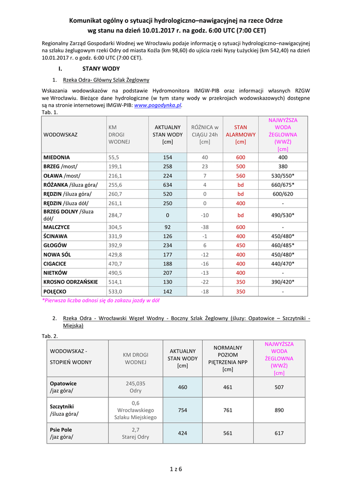 Komunikat ogólny o sytuacji hydrologiczno–nawigacyjnej na rzece Odrze wg stanu na dzień 10.01.2017 r. na godz. 6:00 UTC (7:00 CET) Regionalny Zarząd Gospodarki Wodnej we Wrocławiu podaje informację o sytuacji hydrologiczno–nawigacyjnej na szlaku żeglugowym rzeki Odry od miasta Koźla (km 98,60) do ujścia rzeki Nysy Łużyckiej (km 542,40) na dzień 10.01.2017 r. o godz. 6:00 UTC (7:00 CET). I. 1. STANY WODY Rzeka Odra- Główny Szlak Żeglowny Wskazania wodowskazów na podstawie Hydromonitora IMGW-PIB oraz informacji własnych RZGW we Wrocławiu. Bieżące dane hydrologiczne (w tym stany wody w przekrojach wodowskazowych) dostępne są na stronie internetowej IMGW-PIB: www.pogodynka.pl. Tab. 1. NAJWYŻSZA KM AKTUALNY RÓŻNICA w STAN WODA WODOWSKAZ DROGI STAN WODY CIĄGU 24h ALARMOWY ŻEGLOWNA WODNEJ [cm] [cm] [cm] (WWŻ) [cm] MIEDONIA 55,5 154 40 600 400 BRZEG /most/ 199,1 258 23 500 380 OŁAWA /most/ 216,1 224 7 560 530/550* RÓŻANKA /śluza góra/ 255,6 634 4 bd 660/675* RĘDZIN /śluza góra/ 260,7 520 0 bd 600/620 RĘDZIN /śluza dół/ BRZEG DOLNY /śluza dół/ MALCZYCE 261,1 250 0 400 - 284,7 0 -10 bd 490/530* 304,5 92 -38 600 - ŚCINAWA 331,9 126 -1 400 450/480* GŁOGÓW 392,9 234 6 450 460/485* NOWA SÓL 429,8 177 -12 400 450/480* CIGACICE 470,7 188 -16 400 440/470* NIETKÓW 490,5 207 -13 400 - KROSNO ODRZAŃSKIE 514,1 130 -22 350 390/420* POŁĘCKO 533,0 142 *Pierwsza liczba odnosi się do zakazu jazdy w dół -18 350 - 2. Rzeka Odra - Wrocławski Węzeł Wodny - Boczny Szlak Żeglowny (śluzy: Opatowice – Szczytniki Miejska) Tab. 2. KM DROGI WODNEJ AKTUALNY STAN WODY [cm] NORMALNY POZIOM PIĘTRZENIA NPP [cm] NAJWYŻSZA WODA ŻEGLOWNA (WWŻ) [cm] Opatowice /jaz góra/ 245,035 Odry 460 461 507 Szczytniki /śluza góra/ 0,6 Wrocławskiego Szlaku Miejskiego 754 761 890 2,7 Starej Odry 424 561 617 WODOWSKAZ STOPIEŃ WODNY Psie Pole /jaz góra/ 1z6 II. GŁĘBOKOŚCI TRANZYTOWE 1. Rzeka Odra skanalizowana wraz z Wrocławskim Węzłem Wodnym (WWW) Tab. 3. GŁĘBOKOŚĆ ODCINEK SZLAKU ŻEGLOWNEGO TRANZYTOWA UWAGI [cm] Rzeka Odra km 98,6 (granica administracyjna RZGW we Wrocławiu)- km 216,42 (most w Oławie) Rzeka Odra/Główny szlak żeglowny km 216,42 (most w Oławie) – km 0,60 Głównego Szlaku Żeglownego (śluza Bartoszowice) Główny Szlak Żeglowny km 0,60 Głównego Szlaku Żeglownego (śluza Bartoszowice) - km 5,1 (śluza Zacisze) Główny Szlak Żeglowny km 5,1(śluza Zacisze) - km 9,2 (śluza Różanka) Główny Szlak Żeglowny/rzeka Odra – km 9,2 (śluza Różanka) – km 260,7 rzeki Odry (śluza Rędzin) Rzeka Odra km 260,7 (śluza Rędzin) - km 281,6 rz. Odry (śluza Brzeg Dolny)*** Szlak zamknięty Komunikat 02/2017 Szlak zamknięty Komunikat 03/2017 Szlak zamknięty Komunikat 03/2017 Szlak zamknięty Komunikat 03/2017 Szlak zamknięty Komunikat 03/2017 Szlak zamknięty Uwaga zamknięcie Śluzy Brzeg Dolny od 20.12.2016 r. -remont Komunikat 51/2016 Komunikat 01/2017 Boczny Szlak Żeglowny km 243,50 rzeki Odry (wejście do górnego kanału śluzy Opatowice) * - km 1,0 kanału (śluza Opatowice) Boczny Szlak Żeglowny km 1,0 kanału (śluza Opatowice) * – km 0,60 Wrocławskiego Szlaku Miejskiego (śluza Szczytniki) Szlak zamknięty Uwaga! od dnia 19.12.2016 r śluza Opatowice zamknięta – remont Komunikat 50/2016 Szlak zamknięty Uwaga! od dnia 19.12.2016 r śluza Opatowice zamknięta – remont Komunikat 50/2016 Boczny Szlak Żeglowny śluza Szczytniki- śluza Miejska** Szlak zamknięty Komunikat 03/2017 Górna Odra Wrocławska km 0,60 Wrocławskiego Szlaku Miejskiego (śluza Szczytniki) – km 250,50 rzeki Odry (Most Grunwaldzki) Górna Odra Wrocławska km 250,50 (most Grunwaldzki) – km 251,55 (most Piaskowy) i km 0,20 Odry Północnej (most Tumski) Szlak zamknięty Komunikat 03/2017 Szlak zamknięty Komunikat 03/2017 Śródmiejski Węzeł Wodny km 251,55 (most Piaskowy i km 0,20 Odry Północnej (most Tumski) - km 252,30 (śluza Mieszczańska)** Śródmiejski Węzeł Wodny km 252,50 Odry Płd. (wejście do dolnego kanału śluzy Mieszczańskiej) - km 253,36 (most Dmowskiego) Śródmiejski Węzeł Wodny (szlak wodny poniżej mostów mieszczańskich) km 1,80 Odry Płn. – km 254,10 rz. Odry (połączenie Odry Płd. i Płn.) Wrocławski Szlak Miejski km 6,80 (nabrzeże przeładunkowe węgla EC Wrocław) - km 7,10 (połączenie wrocławskiego Szlaku Miejskiego ze Szlakiem Głównym) Odra Wrocławska km 253,36 (m. Dmowskiego) – km 255,60 połączenie Szlaku Gł. z Odrą Szlak zamknięty Na odcinku obowiązuje zakaz ruchu jednostek bez napędu mechanicznego. Szlak zamknięty Komunikat 1/2015 Szlak zamknięty Komunikat 03/2017 GODZINY 1 ŚLUZOWAŃ Szlak otwarty 140 Szlak zamknięty 1 Komunikat 03/2017 W podanych godzinach śluzy pracują codziennie, również w soboty, niedziele i święta * Śluzowania na stopniu wodnym Opatowice będą odbywać się po wcześniejszym zgłoszeniu potrzeby przejazdu jednostek pływających – na śluzie Bartoszowice, tel. 71-347-85-50, lub za pośrednictwem kanału 74 UKF o częstotliwości 156,725 MHz (dotyczy okresu, gdy śluza jest otwarta) ** Śluzy Miejska, Mieszczańska – zamknięte *** Ze względu na konieczność manewrowania jazem w Brzegu Dolnym mogą następować zmiany piętrzenia na tym polu. Załogi statków wchodzących na ten odcinek są zobowiązane do zapoznania się z aktualnymi stanami wody na tym akwenie 2z6 2. Odra swobodnie płynąca Głębokości tranzytowe na Odrze swobodnie płynącej są zmienne i uzależnione od aktualnych stanów wody na danym odcinku rzeki Odry. Tab. 4 NADZÓR WODNY BRZEG DOLNY (281,60 - 310,00) CHOBIENIA (310,00 - 370,00) BYTOM ODRZAŃSKI (370,00-423,00) CIGACICE (km 423,00 - 480,00) KROSNO ODRZAŃSKIE (km 480,00 - 542,40) III. MIEJSCA NAJMNIEJSZYCH GŁĘBOKOŚCI [km Odry] GŁĘBOKOŚĆ TRANZYTOWA [cm] wyjście awanportu dolnego 40 296,000 - 301,000 40 326,900 165 327,100 175 330,000 175 370,300 - 371,700 373,200 - 374,400 140 140 376,500 140 389,000 - 391,000 150 4