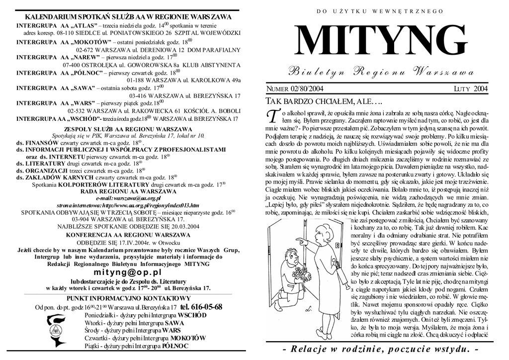 16 KALENDARIUM SPOTKAŃ SŁUśB AA W REGIONIE WARS ZAWA DO INTERGRUPA AA „ATLAS” – trzecia niedzi ela godz. 1400 spotkania w terenie adres koresp. 08-110 SIEDLCE ul. PONIATOWSKIEGO 26 SZPITAL WOJEWÓDZKI INTERGRUPA AA „MOKOTÓW” – ostatni poniedziałek godz. 1800 02-672 WARSZAWA ul. DERENIOWA 12 DOM PARAFIALNY INTERGRUPA AA „NAREW” – pierwsza niedziel a godz. 1700 07-400 OSTROŁĘKA ul. GOWOROWSKA 8a KLUB ABSTYNENTA INTERGRUPA AA „PÓŁNOC” – pierwszy czwart ek godz. 1800 01-188 WARSZAWA ul. KAROLKOWA 49a INTERGRUPA AA „SAWA” – ostatnia sobota godz. 1700 03-416 WARSZAWA ul. BEREZYŃSKA 17 INTERGRUPA AA „WARS” – pierwszy piątek godz.1800 02-532 WARSZAWA ul. RAKOWIECKA 61 KOŚCIÓŁ A. BOBOLI INTERGRUPA AA „WSCHÓD”- trzecia środa godz.1800 WARSZAWA ul. BEREZYŃSKA 17 ZESPOŁY SŁUśB AA REGIONU WARSZAWA Spotykają się w PIK, Warszawa ul. Berezyńska 17, lokal nr 10. ds. FINANSÓW czwarty czwartek m-ca godz. 1800 . ds. INFORMACJI PUBLICZNEJ I WSPÓŁPRACY Z PROFESJONALISTAMI oraz ds. INTERNETU pierwszy czwartek m-ca godz. 1800 ds. LITERATURY drugi czwartek m-ca godz. 1800 ds. ORGANIZACJI trzeci czwartek m-ca godz. 1800 ds. ZAKŁADÓW KARNYCH czwarty czwartek m-ca godz. 1800 Spotkania KOLPORTERÓW LITERATURY drugi czwart ek m-ca godz. 1730 RADA REGIONU AA WARSZAWA e-mail: [email protected] strona internetowa: http://www.aa.org.pl/regiony/index013.htm SPOTKANIA ODBYWAJĄ SIĘ W TRZECIĄ SOBOTĘ – miesiące nieparzyste godz. 1600 03-904 WARSZAWA ul. BEREZYŃSKA 17. NAJBLIśSZE SPOTKANIE ODBĘDZIE SIĘ 20.03.2004 KONFERENCJA AA REGIONU WARSZAWA ODBĘDZIE SIĘ 17.IV.2004r. w Otwocku JeŜeli chcecie by w naszym Kalendarium prezentowane były rocznice Was zych Grup, Intergrup lub inne wydarzenia, przysyłajcie materiały i informacje do Redakcji Regionalnego Biuletynu Informacyjnego MITYNG m i t yn g @o p . p l lub dostarczajcie je do Zespołu ds. Literatury w kaŜdy wtorek i czwartek w god z. 1700- 2000 ul. Berezyńska 17. ____________________________________________________________________________________________________________________________________________________________________________ PUNKT INFORMACYJNO KONTAKTOWY Od pon. do pt. godz 16 00-21 00 Warszawa ul.Berezyńska 17 tel. 616-05-68 Poniedziałki - dyŜury pełni Intergrupa WSCHÓD Wtorki - dyŜury pełni Intergrupa SAWA Środy - dyŜury pełni Intergrupa WARS Czwartki - dyŜury pełni Intergrupa MOKOTÓW Piątki - dyŜury pełni Intergrupa PÓŁNOC U śY TK U WEWNĘ TR ZNEGO MITYNG Biu le tyn Re gio nu W arsz aw a NUMER 02/80/2004 LUTY 2004 TAK BARDZO CHCIAŁEM, ALE…. T o alkohol sprawił, Ŝe opuściła mnie Ŝona i zabrała ze sobą nasza córkę. Nagle ocknąłem się. Byłem przegrany. Zacząłem raptownie myśleć nad tym, co robić, co jest dla mnie waŜne? - Po pierwsze przestałem pić. Zobaczyłem w tym jedyną szansę na ich powrót. Podjąłem terapię z nadzieją, Ŝe nauczę się rozwiązywać swoje problemy. Po kilku miesiącach doszło do powrotu moich najbliŜszych. Uświadamiałem sobie powoli, Ŝe nie ma dla mnie powrotu do alkoholu. Po kilku kolejnych miesiącach pojawiły się widoczne profity mojego postępowania. Po długich dniach milczenia zaczęliśmy w rodzinie rozmawiać ze sobą. Starałem się wynagrodzić im lata mojego picia. Dawałem pieniądze na wszystko, nadskakiwałem w kaŜdej sprawie, byłem zawsze na posterunku zwarty i gotowy. Układało się po mojej myśli. Prawie sielanka do momentu, gdy się okazało, jakie jest moje trzeźwienie. Ciągle miałem wobec bliskich jakieś oczekiwania. Bolało mnie to, iŜ postępują inaczej niŜ ja oczekuję. Nie wynagradzają poświęcenia, nie widzą zachodzących we mnie zmian. „Lepiej było, gdy piłeś” słyszałem niejednokrotnie. Sądziłem, Ŝe będę nagradzany za to, co robię, zapominając, Ŝe miłości się nie kupi. Chciałem zaskarbić sobie wdzięczność bliskich, nie zaś postępować z miłością. Chciałem być szanowany i kochany za to, co robię. Tak juŜ dawniej robiłem. Kac moralny i dla odmiany odrabianie strat. Nie potrafiłem być szczęśliwy prowadząc stare gierki. W końcu nadeszły te chwile, których bardzo się obawiałem. Byłem jeszcze słaby psychicznie, a system wartości miałem nie do końca sprecyzowany. Do tej pory najwaŜniejsze było, aby nie pić; teraz nadszedł czas zmieniania siebie. CięŜko było z akceptacją. Tyle lat nie piję, chodzę na mityngi a ciągle napotykam jakieś kłody pod nogami. Czułem się zagubiony i nie wiedziałem, co robić. W głowie mętlik. Nawet mojemu sponsorowi opadały ręce. CięŜko było wysłuchiwać tylu ciągłych narzekań. Nie oszczędzałem równieŜ znajomych. Oni teŜ byli zmęczeni. Tylko, Ŝe była to moja wersja. Myślałem, Ŝe moja Ŝona i córka robią mi ciągle na złość. Chcą dokuczyć i odpłacić - R ela c je w ro d zini e , p o cz u ci e wst y du . - 2 „Alkohol niczym chciwy wierzyciel, dosłownie wysysa z nas wszelką niezaleŜność i całą wolę oporu wobec jego Ŝądań.” za wiele lat upokorzeń. Na pytanie sponsora, co w tej sytuacji dalej zamierzam zrobić, mocno się dziwiłem. Potrafiłem jednym tchem wyliczyć swoje zasługi. To oni powinni się zmienić. Nic, tylko ciągle mnie prześladują, a ja dla nich wszystko.. W końcu zorientowaca zostało łem się, Ŝe stosunki w rodzinie są miarą trzeźwienia. Innych łatwo było nabrać na pokorę, tolerancję, czy głoszone puste hasła. NajbliŜsi nie dali się oszukać. Są dla mnie surowym, ale sprawiedliwym sędzią. W takich momentach czułem, Ŝe nie jestem im obojętny. WaŜne jest nasze wspólne dobro, nasza cała rodzina. Ale muszę pamiętać, Ŝe jeŜeli sam nie wnoszę do niej ciepła, spokoju, nie daję miłości, to sam równieŜ nie dostaję. Wiem równieŜ, Ŝe nie od razu wszystko będzie cacy. Zanim mi uwierzą, Ŝe się zmieniam, muszę przekonać swoim codziennym postępowaniem. Nie mogę wiecznie grać. Muszę zmienić