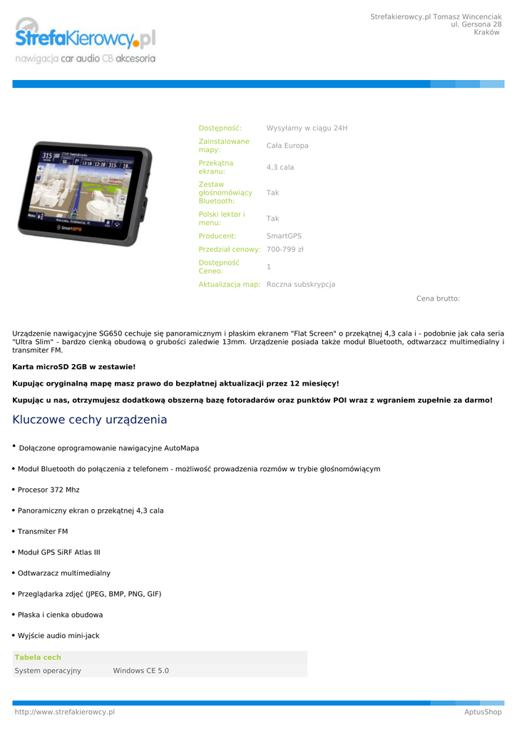 Strefakierowcy.pl Tomasz Wincenciak ul. Gersona 28 Kraków Dostępność: Wysyłamy w ciągu 24H Zainstalowane mapy: Cała Europa Przekątna ekranu: 4,3 cala Zestaw głośnomówiący Bluetooth: Tak Polski lektor i menu: Tak Producent: SmartGPS Przedział cenowy: 700-799 zł Dostępność Ceneo: 1 Aktualizacja map: Roczna subskrypcja Cena brutto: Urządzenie nawigacyjne SG650 cechuje się panoramicznym i płaskim ekranem "Flat Screen" o przekątnej 4,3 cala i - podobnie jak cała seria "Ultra Slim" - bardzo cienką obudową o grubości zaledwie 13mm. Urządzenie posiada także moduł Bluetooth, odtwarzacz multimedialny i transmiter FM. Karta microSD 2GB w zestawie! Kupując oryginalną mapę masz prawo do bezpłatnej aktualizacji przez 12 miesięcy! Kupując u nas, otrzymujesz dodatkową obszerną bazę fotoradarów oraz punktów POI wraz z wgraniem zupełnie za darmo! Kluczowe cechy urządzenia Dołączone oprogramowanie nawigacyjne AutoMapa Moduł Bluetooth do połączenia z telefonem - możliwość prowadzenia rozmów w trybie głośnomówiącym Procesor 372 Mhz Panoramiczny ekran o przekątnej 4,3 cala Transmiter FM Moduł GPS SiRF Atlas III Odtwarzacz multimedialny Przeglądarka zdjęć (JPEG, BMP, PNG, GIF) Płaska i cienka obudowa Wyjście audio mini-jack Tabela cech System operacyjny Windows CE 5.0 http://www.strefakierowcy.pl AptusShop Strefakierowcy.pl Tomasz Wincenciak ul. Gersona 28 Kraków Procesor 372Mhz Pamięć RAM 64 MB Pamięć wbudowana ROM 64 MB Obsługiwane typy kart microSD Gniazdo słuchawek Gniazdo "jack" 3.5mm stereo Wyświetlacz panel dotykowy TFT-LCD 4,3" Rozdzielczość 480x272 pikseli Transmisja danych Port USB, Bluetooth Odbiornik GPS SiRF Atlas III Wymiary 122 x 78x 12.5mm Wejście AV Nie http://www.strefakierowcy.pl AptusShop