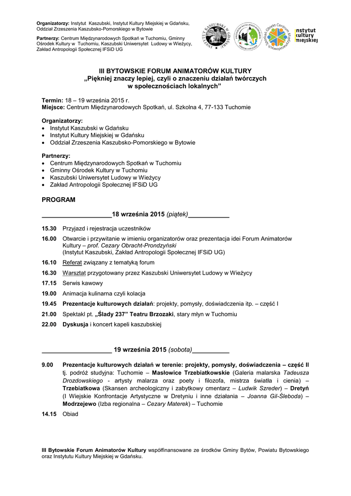 Organizatorzy: Instytut Kaszubski, Instytut Kultury Miejskiej w Gdańsku, Oddział Zrzeszenia Kaszubsko-Pomorskiego w Bytowie Partnerzy: Centrum Międzynarodowych Spotkań w Tuchomiu, Gminny Ośrodek Kultury w Tuchomiu, Kaszubski Uniwersytet Ludowy w Wieżycy, Zakład Antropologii Społecznej IFSiD UG III BYTOWSKIE FORUM ANIMATORÓW KULTURY „Piękniej znaczy lepiej, czyli o znaczeniu działań twórczych w społecznościach lokalnych” Termin: 18 – 19 września 2015 r. Miejsce: Centrum Międzynarodowych Spotkań, ul. Szkolna 4, 77-133 Tuchomie Organizatorzy: Instytut Kaszubski w Gdańsku Instytut Kultury Miejskiej w Gdańsku Oddział Zrzeszenia Kaszubsko-Pomorskiego w Bytowie Partnerzy: Centrum Międzynarodowych Spotkań w Tuchomiu Gminny Ośrodek Kultury w Tuchomiu Kaszubski Uniwersytet Ludowy w Wieżycy Zakład Antropologii Społecznej IFSiD UG PROGRAM 18 września 2015 (piątek) 15.30 Przyjazd i rejestracja uczestników 16.00 Otwarcie i przywitanie w imieniu organizatorów oraz prezentacja idei Forum Animatorów Kultury – prof. Cezary Obracht-Prondzyński (Instytut Kaszubski, Zakład Antropologii Społecznej IFSiD UG) 16.10 Referat związany z tematyką forum 16.30 Warsztat przygotowany przez Kaszubski Uniwersytet Ludowy w Wieżycy 17.15 Serwis kawowy 19.00 Animacja kulinarna czyli kolacja 19.45 Prezentacje kulturowych działań: projekty, pomysły, doświadczenia itp. – część I 21.00 Spektakl pt. „Ślady 237” Teatru Brzozaki, stary młyn w Tuchomiu 22.00 Dyskusja i koncert kapeli kaszubskiej 19 września 2015 (sobota) 9.00 Prezentacje kulturowych działań w terenie: projekty, pomysły, doświadczenia – część II tj. podróż studyjna: Tuchomie – Masłowice Trzebiatkowskie (Galeria malarska Tadeusza Drozdowskiego - artysty malarza oraz poety i filozofa, mistrza światła i cienia) – Trzebiatkowa (Skansen archeologiczny i zabytkowy cmentarz – Ludwik Szreder) – Dretyń (I Wiejskie Konfrontacje Artystyczne w Dretyniu i inne działania – Joanna Gil-Śleboda) – Modrzejewo (Izba regionalna – Cezary Materek) – Tuchomie 14.15 Obiad III Bytowskie Forum Animatorów Kultury współfinansowane ze środków Gminy Bytów, Powiatu Bytowskiego oraz Instytutu Kultury Miejskiej w Gdańsku.