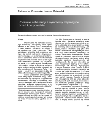 Sztuka Leczenia 2005, tom XII, nr 3-4 str. 21-28 Aleksandra Kroemeke, Joanna Mateusiak Poczucie koherencji a symptomy depresyjne przed i po porodzie Sense of coherence and pre- and postnatal depression symptoms Wstęp Oczekiwanie na pierwsze dziecko, jego narodziny i początkowy okres opieki nad nim to dla kobiety czas, z jednej strony – pełen radości i szczęścia, a z drugiej – nie pozbawiony obaw i niepokoju. Dwuwartościowy charakter tych wydarzeń, wiążące się z nimi zachwianie dotychczasowej równowagi, a w jej konsekwencji konieczność dokonania zmian w mechanizmach przystosowania pozwala uznać je za krytyczne wydarzenia życiowe (18). Wydarzenia, które choć spostrzegane subiektywnie i różnorodnie, często w literaturze rozpatrywane są jako możliwe źródła zaburzeń nie tylko somatycznych (koncepcja Raha i Holmesa – por. 24) czy psychicznych (8), ale także zaburzeń systemu rodzinnego (15). Wśród problemów emocjonalnych ściśle związanych z okresem ciąży i porodu wymienia się najczęściej przygnębienie poporodowe, depresję poporodową i psychozę połogową – zaburzenia nastroju występujące w okresie poporodowym, a różniące się względną ciężkością objawów1 1 Zaktualizowana wersja klasyfikacji DSM– V (za: 2) zawiera opis depresyjnych zaburzeń postnatalnych spełniających kryteria wielkiej depresji, depresji jedno lub dwubiegunowej lub krótkiego epizodu psychotycznego, gdy objawy nie trwają krócej niż cztery tygodnie po porodzie. (20, 22). Problematyce depresji w trakcie trwania ciąży literatura poświęca mało miejsca, co wynika prawdopodobnie z uznania labilności emocjonalnej okresu ciąży za normalny objaw jej towarzyszący. Jak podają Steiner i Yonkers (20) tylko 20% kobiet z problemami emocjonalnymi w trakcie ciąży spełnia kryteria mniejszego lub dużego zaburzenia depresyjnego. Wyodrębnienie zaburzeń psychicznych okresu okołoporodowego nastręcza zatem wiele trudności zarówno teoretycznych, jak i praktycznych. Do tej pory nie udało się jasno rozgraniczyć depresji okresu okołoporodowego od depresji występującej w innych okresach życia. Carson, Butcher i Mineka (2) sądzą, iż wielka depresja nie pojawia się częściej w okresie poporodowym, a niektóre uczucia depresyjne w tym okresie mieszczą się w granicach normalnych wahań nastroju. Kwestię tą komplikuje niewątpliwie fakt, że wiele objawów somatycznych tych zaburzeń, może stanowić normalny proces przebiegu ciąży i przystosowania po porodzie (22). Rozważania dotyczące możliwego spadku nastroju u kobiet w ciąży i połogu skłaniają do pytania o czynniki go warunkujące; pytania zakorzenionego w tradycyjnym, patogenetycznym paradygmacie, ukierunkowanym na poszukiwanie psychologicznych uwarunkowań chorób i zaburzeń. Z drugiej strony, pojawia się równie 21 Poczucie koherencji a symptomy depresyjne przed i po porodzie wartościowe pytanie o to, jak to się dzieje, że pomimo występowania szeregu czynników stresowych są kobiety, które w obliczu takiego wydarzenia życiowego, jakim jest ciąża i poród, dobrze sobie radzą, nie doświadczając symptomów obniżenia nastroju. Pytanie to inspirowane jest, wprowadzonym przez Antonovsky’ego, salutogenetycznym podejściem do człowieka (poszukującym podłoża zdrowia), w którym centralną rolę odgrywa poczucie koherencji (SOC), uznane za zmienną kluczową dla zdrowia i często łączone ze stanem emocjonalnym jednostki (1). Poczucie koherencji (SOC) zdefiniowane zostało jako względnie stała orientacja, wyznaczająca określony sposób spostrzegania świata: jako przewidywalnego, sterowalnego oraz wartego wysiłku i zaangażowania (1). Na SOC składają się trzy – ściśle ze sobą powiązane – komponenty: poczucie zrozumiałości (przekonanie o spójności i przewidywalności środowiska), zaradności (przekonanie o możliwości sprostania stawianym wymaganiom) i sensowności (przekonanie o sensowności własnych działań). Antonovsky (1) zakładał, że im silniejsze poczucie koherencji, tym większa szansa na utrzymanie przez człowieka lub poprawienie jego pozycji na kontinuum zdrowie – choroba. Wynika to z przekonania osób o silnym SOC, że życie ma sens, jest przewidywalne i uporządkowane oraz że posiadają zasoby pozwalające radzić sobie z problemami. Problematyka Empiryczna weryfikacja modelu salutogenetycznego cieszy się dużym zainteresowaniem badaczy, mimo to, badania nad relacjami łączącymi poczucie koherencji i zdrowie psychiczne nadal nie przynoszą jednoznacznych rozstrzygnięć. Rezultaty większości badań wskazują na silne dodatnie korelacje SOC ze wskaźnikami zdrowia pozytywnego oraz ujemne – ze wskaźnikami zdrowia negatywne-go (por. 5, 14, 17, 19), co potwierdza – zakładaną przez Antonovsky’ego – prozdrowotną rolę SOC. 22 Zgodnie z koncepcją Antonovsky’ego, im wyższe poczucie koherencji, tym lepszy stan zdrowia jednostki. Istnieją jednak badania, z których wynika, że to raczej niskie poczucie koherencji jest bardziej związane z załamaniem się zdrowia i negatywnymi emocjami, niż wysokie SOC z jego utrzymaniem i poprawą (por. 9, 23, 25). Co więcej, Kravetz, Drory i Florian (12) zauważyli, że poczucie koherencji koreluje w tym samym stopniu ze wskaźnikami zdrowia, co ze wskaźnikami negatywnych emocji (współczynnik korelacji przyjmował te same rozmiary, lecz przeciwny znak). Podobne rezultaty uzyskali Strümpfer, Gouws i Viviers (21) wskazując, że poczucie koherencji korelowało zarówno z negatywnymi jak i pozytywnymi emocjami, choć związek z emocjami negatywnymi był silniejszy. Mogłoby to wskazywać, zdaniem autorów, że poczucie koherencji i negatywna afektywność znajdują się na dwóch krańcach tego samego kontinuum. Podobne stanowisko zajmuje również Geyer (4). Powyższe dane podważają założenia teoretyczne dotyczące konstruktu wprowadzonego przez Antonovsky’ego, zgodnie z który