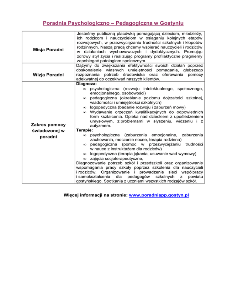 Poradnia Psychologiczno – Pedagogiczna w Gostyniu Misja Poradni Wizja Poradni Zakres pomocy świadczonej w poradni Jesteśmy publiczną placówką pomagającą dzieciom, młodzieży, ich rodzicom i nauczycielom w osiąganiu kolejnych etapów rozwojowych, w przezwyciężaniu trudności szkolnych i kłopotów rodzinnych. Naszą pracą chcemy wspierać nauczycieli i rodziców w działaniach wychowawczych i dydaktycznych. Promując zdrowy styl życia i realizując programy profilaktyczne pragniemy zapobiegać patologiom społecznym. Dążymy do zwiększania efektywności swoich działań poprzez doskonalenie własnych umiejętności pomagania, głębszego rozpoznania potrzeb środowiska oraz oferowania pomocy adekwatnej do oczekiwań naszych klientów. Diagnoza: • psychologiczna (rozwoju intelektualnego, społecznego, emocjonalnego, osobowości) • pedagogiczna (określanie poziomu dojrzałości szkolnej, wiadomości i umiejętności szkolnych) • logopedyczna (badanie rozwoju i zaburzeń mowy) • Wydawanie orzeczeń kwalifikacyjnych do odpowiednich form kształcenia. Opieka nad dzieckiem z upośledzeniem umysłowym, z problemami w słyszeniu, widzeniu i z autyzmem. Terapie: • psychologiczna (zaburzenia emocjonalne, zaburzenia zachowania, moczenie nocne, terapia rodzinna) • pedagogiczna (pomoc w przezwyciężaniu trudności w nauce z instruktażem dla rodziców) • logopedyczna (terapia jąkania, usuwanie wad wymowy) • zajęcia socjoterapeutyczne, Diagnozowanie potrzeb szkół i przedszkoli oraz organizowanie wspomagania pracy szkoły poprzez szkolenia dla nauczycieli i rodziców. Organizowanie i prowadzenie sieci współpracy i samokształcenia dla pedagogów szkolnych z powiatu gostyńskiego. Spotkania z uczniami wszystkich rodzajów szkół. Więcej informacji na stronie: www.poradniapp.gostyn.pl Zespół Szkół Ogólnokształcących w Gostyniu Zespół Szkół Ogólnokształcących w Gostyniu jest szkołą z wieloletnią tradycją, jej początki sięgają 1919 roku. W licznym gronie absolwentów szkoły znajduje się wielu naukowców i profesorów wyższych uczelni. Aktualnie w Zespole Szkół Ogólnokształcących im. Ziemi Gostyńskiej funkcjonują dwa typy szkół: • Liceum Ogólnokształcące z Oddziałami Dwujęzycznymi • Liceum Ogólnokształcące dla Dorosłych W 13 oddziałach Liceum uczy się dzisiaj 345 uczniów. W ofercie edukacyjnej szkoły są następujące profile: - matematyczno – fizyczny - biologiczno – chemiczny - humanistyczny - ogólny - dwujęzyczny z językiem angielskim jako drugim językiem nauczania. Od roku 2012 w klasach, w których wdrożona została reforma programowa, trzy przedmioty nauczania realizowane są w zakresie rozszerzonym. W zależności od profilu klasy oraz wyboru uczniów mogą to być: język polski, historia, matematyka, fizyka, biologia, chemia, geografia, informatyka, wiedza o społeczeństwie, filozofia, język angielski, język niemiecki, biologia w języku angielskim, historia nauczana częściowo w języku angielskim (za wyjątkiem historii Polski). Każdy uczeń uczy się dwóch języków obcych nowożytnych. Język wiodący wybiera spośród: języka angielskiego i języka niemieckiego, drugi język spośród: języka angielskiego, niemieckiego, rosyjskiego, francuskiego, hiszpańskiego. Języki obce nauczane są w grupach międzyoddziałowych. Szkoła wprowadza nowatorskie rozwiązania, które wpływają na wszechstronny rozwój uczniów i uzyskiwanie wysokich efektów kształcenia, wychowania i opieki. Wdrożone zostało nauczanie dwujęzyczne z językiem angielskim jako drugim językiem nauczania. Szkoła podjęła współpracę z wyższymi uczelniami. Realizowane są innowacje pedagogiczne. Szkoła jest organizatorem powiatowych i szkolnych konkursów oraz zawodów sportowych. Organizujemy uroczystości, wystawy, debaty, drzwi otwarte, pikniki i turnieje sportowe z udziałem społeczności lokalnej. Na zajęciach dodatkowych uczniowie rozwijają swoje umiejętności i pasje. W szkole działają: chór szkolny, grupa teatralna, szkolny klub PCK, Szkolne Koło Krajoznawczo – Turystyczne, Liga Ochrony Przyrody. Prężnie działa szkolny wolontariat. Samorząd Uczniowski, który w szkole działa bardzo aktywnie, od 2014r. wydaje gazetę szkolną „Limbus”. Szkoła jest dobrze wyposażona w nowoczesne środki dydaktyczne: tablice interaktywne, zestawy multimedialne. Uczniowie kształcą się w wyremontowanych salach i pracowniach lekcyjnych; chemicznej, biologicznej, geograficznej, językowej, informatycznych, fizycznych, matematycznych. Do realizacji zajęć wychowania fizycznego służy nowoczesna hala sportowa z pełnowymiarowym boiskiem do piłki nożnej oraz pozostałych gier zespołowych. W szkole panuje bardzo dobra atmosfera. Lp. Typ szkoły dla młodzieży Przedmioty nauczane w zakresie rozszerzonym 1. Liceum Profil klasy matematyczno – fizyczny: • rozszerzona matematyka • rozszerzona fizyka • rozszerzenie do wyboru: chemia, geografia, informatyka, język angielski, język niemiecki Profil klasy biologiczno – chemiczny: • rozszerzona biologia • rozszerzona chemia • rozszerzenie do wyboru: geografia, informatyka, fizyka, język angielski, język niemiecki, matematyka, Profil klasy humanistyczny: • rozszerzony język polski • rozszerzona historia • rozszerzenie do wyboru: wiedza o społeczeństwie, filozofia, Profil klasy ogólny: • rozszerzony język angielski • rozszerzona geografia • rozszerzenie do wyboru: fizyka, informatyka, chemia, matematyka Oddział dwujęzyczny: • rozszerzony język polski, oraz do wyboru dwie możliwości: Profil dwujęzyczny historyczny: • rozszerzona historia nauczana częściowo w języku angielskim • rozszerzony WOS lub filozofia Profil dwujęzyczny biologiczny: • rozszerzona biologia nauczana w języku angielskim • rozszerzona chemia lub geografia Aktualnie realizowane Innowacje na podstawie programów własnych nauczycieli w ramac