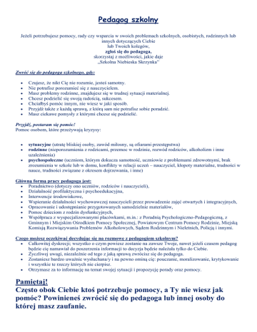 Pedagog szkolny Jeżeli potrzebujesz pomocy, rady czy wsparcia w swoich problemach szkolnych, osobistych, rodzinnych lub innych dotyczących Ciebie lub Twoich kolegów, zgłoś się do pedagoga, skorzystaj z możliwości, jakie daje „Szkolna Niebieska Skrzynka” Zwróć się do pedagoga szkolnego, gdy: Czujesz, że nikt Cię nie rozumie, jesteś samotny. Nie potrafisz porozumieć się z nauczycielem. Masz problemy rodzinne, znajdujesz się w trudnej sytuacji materialnej. Chcesz podzielić się swoją radością, sukcesem. Chciałbyś pomóc innym, nie wiesz w jaki sposób. Przyjdź także z każdą sprawą, z którą sam nie potrafisz sobie poradzić. Masz ciekawe pomysły z którymi chcesz się podzielić. Przyjdź, postaram się pomóc! Pomoc osobom, które przeżywają kryzysy: sytuacyjne (utratę bliskiej osoby, zawód miłosny, są ofiarami przestępstwa) rodzinne (nieporozumienia z rodzicami, przemoc w rodzinie, rozwód rodziców, alkoholizm i inne uzależnienia) psychospołeczne (uczniom, którym dokucza samotność, uczniowie z problemami zdrowotnymi, brak zrozumienia w szkole lub w domu, konflikty w relacji uczeń – nauczyciel, kłopoty materialne, trudności w nauce, trudności związane z okresem dojrzewania, i inne) Główną formą pracy pedagoga jest: Poradnictwo (dotyczy ono uczniów, rodziców i nauczycieli), Działalność profilaktyczna i psychoedukacyjna, Interwencje środowiskowe, Wspieranie działalności wychowawczej nauczycieli przez prowadzenie zajęć otwartych i integracyjnych, Opracowanie i udostępnianie przygotowanych samodzielnie materiałów, Pomoc dzieciom z rodzin dysfunkcyjnych, Współpraca z wyspecjalizowanymi placówkami, m.in.: z Poradnią Psychologiczno-Pedagogiczną, z Gminnym i Miejskim Ośrodkiem Pomocy Społecznej, Powiatowym Centrum Pomocy Rodzinie, Miejską Komisją Rozwiązywania Problemów Alkoholowych, Sądem Rodzinnym i Nieletnich, Policją i innymi. Czego możesz oczekiwać decydując się na rozmowę z pedagogiem szkolnym? Całkowitej dyskrecji; wszystko o czym powiesz zostanie na zawsze Twoje, nawet jeżeli czasem pedagog będzie cię namawiał do poszerzenia informacji to decyzja będzie należała tylko do Ciebie. Życzliwej uwagi, niezależnie od tego z jaką sprawą zwrócisz się do pedagoga. Zostaniesz bardzo uważnie wysłuchana/y i na pewno ominą cię: pouczanie, moralizowanie, krytykowanie i wszystkie te rzeczy których nie cierpisz. Otrzymasz za to informację na temat swojej sytuacji i propozycję porady oraz pomocy. Pamiętaj! Często obok Ciebie ktoś potrzebuje pomocy, a Ty nie wiesz jak pomóc? Powinieneś zwrócić się do pedagoga lub innej osoby do której masz zaufanie.