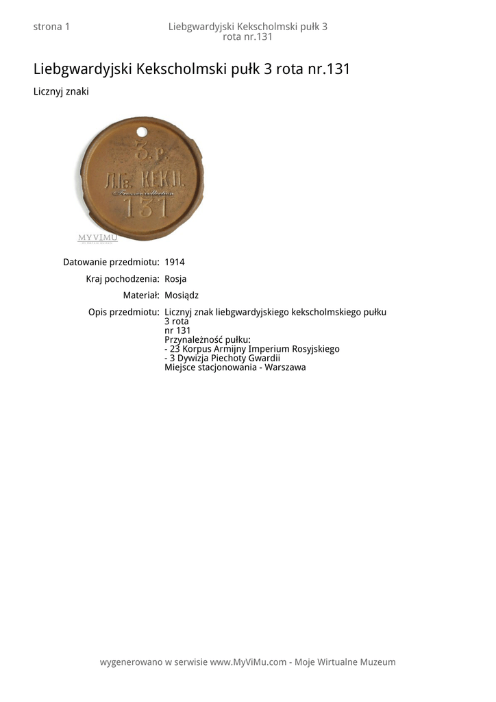 strona 1 Liebgwardyjski Kekscholmski pułk 3 rota nr.131 Liebgwardyjski Kekscholmski pułk 3 rota nr.131 Licznyj znaki Datowanie przedmiotu: 1914 Kraj pochodzenia: Rosja Materiał: Mosiądz Opis przedmiotu: Licznyj znak liebgwardyjskiego kekscholmskiego pułku 3 rota nr 131 Przynależność pułku: - 23 Korpus Armijny Imperium Rosyjskiego - 3 Dywizja Piechoty Gwardii Miejsce stacjonowania - Warszawa wygenerowano w serwisie www.MyViMu.com - Moje Wirtualne Muzeum strona 1 3 Narwski Pułk Piechoty 1 rota nr.133 3 Narwski Pułk Piechoty 1 rota nr.133 Licznyj znaki Datowanie przedmiotu: 1914 Kraj pochodzenia: Rosja Materiał: Mosiądz Opis przedmiotu: Licznyj znak 3 narwskiego pułku piechoty 1 rota nr 133 Przynależność pułku: - 13 Korpus Armijny - 1 Dywizja Piechoty - 2 Brygada Piechoty Miejsce stacjonowania - Smoleńsk wygenerowano w serwisie www.MyViMu.com - Moje Wirtualne Muzeum strona 1 4 Koporski Pułk Piechoty 5 rota nr.110 4 Koporski Pułk Piechoty 5 rota nr.110 Licznyj znaki Datowanie przedmiotu: 1914 Kraj pochodzenia: Rosja Opis przedmiotu: Licznyj znak 4 koporskiego pułku piechoty 5 rota nr 110 wygenerowano w serwisie www.MyViMu.com - Moje Wirtualne Muzeum strona 1 4 Koporski Pułk Piechoty 5 rota nr.117 4 Koporski Pułk Piechoty 5 rota nr.117 Licznyj znaki Datowanie przedmiotu: 1914 Kraj pochodzenia: Rosja Opis przedmiotu: Licznyj znak 4 koporskiego pułku piechoty 5 rota nr 117 wygenerowano w serwisie www.MyViMu.com - Moje Wirtualne Muzeum strona 1 7 Rewelski pułk piechoty 8 rota nr.3 7 Rewelski pułk piechoty 8 rota nr.3 Licznyj znaki Datowanie przedmiotu: 1914 Kraj pochodzenia: Rosja Materiał: Mosiądz Opis przedmiotu: Licznyj znak 7 piechotnego rewelskiego pułku 8 rota nr 3 Przynależność pułku: - 23 Korpus Armijny - 2 Dywizja Piechoty - 2 Brygada Piechoty Miejsce stacjonowania - Pułtusk wygenerowano w serwisie www.MyViMu.com - Moje Wirtualne Muzeum strona 1 13 Biełozierski pułk piechoty 3 rota nr. 83 13 Biełozierski pułk piechoty 3 rota nr. 83 Licznyj znaki Datowanie przedmiotu: 1914 Kraj pochodzenia: Rosja Materiał: Cynk Opis przedmiotu: Licznyj znak 13 biełozierskiego pułku piechoty 3 rota nr. 83 Przynależność pułku: - 6 Korpus Armijny - 3 Dywizja Piechoty - 1 Brygada Piechoty Miejsce stacjonowania - Łomża wygenerowano w serwisie www.MyViMu.com - Moje Wirtualne Muzeum strona 1 13 Biełozierski pułk piechoty 8 rota nr. 146 13 Biełozierski pułk piechoty 8 rota nr. 146 Licznyj znaki Datowanie przedmiotu: 1914 Kraj pochodzenia: Rosja Materiał: Cynk Opis przedmiotu: Licznyj znak 13 biełozierskiego pułku piechoty 8 rota nr. 146 Przynależność pułku: - 6 Korpus Armijny - 3 Dywizja Piechoty - 1 Brygada Piechoty Miejsce stacjonowania - Łomża wygenerowano w serwisie www.MyViMu.com - Moje Wirtualne Muzeum strona 1 15 Szlisselburski Pułk Piechoty 13 rota nr 21 15 Szlisselburski Pułk Piechoty 13 rota nr 21 Licznyj znaki Datowanie przedmiotu: 1914 Kraj pochodzenia: Rosja Materiał: Mosiądz Opis przedmiotu: Licznyj znak 15 Szlisselburskiego Pułku Piechoty 13 rota nr 21 Przynależność pułku: - 6 Korpus Armijny - 4 Dywizja Piechoty (Łomża) - 2 Brygada Piechoty (Zambrów) wygenerowano w serwisie www.MyViMu.com - Moje Wirtualne Muzeum strona 1 21 Muromski pułk piechoty 1 rota nr.76 21 Muromski pułk piechoty 1 rota nr.76 Licznyj znaki Datowanie przedmiotu: 1914 Kraj pochodzenia: Rosja Materiał: Mosiądz Opis przedmiotu: Licznyj znak 21 piechotnego muromskiego pułku 1 rota nr 76 Przynależność pułku to: - 15 Korpus Armijny - 8 Dywizja Piechoty - 1 Brygada Piechoty Miejsce stacjonowania - Różan wygenerowano w serwisie www.MyViMu.com - Moje Wirtualne Muzeum strona 1 23 piechotny nizowski pułk 1 rota nr. 175 23 piechotny nizowski pułk 1 rota nr. 175 Licznyj znaki Datowanie przedmiotu: 1914 Kraj pochodzenia: Rosja Materiał: Mosiądz Opis przedmiotu: Licznyj znak 23 piechotnego nizowskiegu pułku 1 rota nr 175 Przynależność pułku to: - 15 Korpus Armijny - 8 Dywizja Piechoty - 2 Brygada Piechoty Miejsce stacjonowania - Ostrów wygenerowano w serwisie www.MyViMu.com - Moje Wirtualne Muzeum strona 1 23 piechotny nizowski pułk 2 rota nr. 213 23 piechotny nizowski pułk 2 rota nr. 213 Licznyj znaki Datowanie przedmiotu: 1914 Kraj pochodzenia: Rosja Materiał: Mosiądz Opis przedmiotu: Licznyj znak 23 piechotnego nizowskiegu pułku 2 rota nr 213 Przynależność pułku to: - 15 Korpus Armijny - 8 Dywizja Piechoty - 2 Brygada Piechoty Miejsce stacjonowania - Ostrów wygenerowano w serwisie www.MyViMu.com - Moje Wirtualne Muzeum strona 1 23 piechotny nizowski pułk 4 rota nr. 228 23 piechotny nizowski pułk 4 rota nr. 228 Licznyj znaki Datowanie przedmiotu: 1914 Kraj pochodzenia: Rosja Materiał: Mosiądz Opis przedmiotu: Licznyj znak: 23 piechotnego nizowskiegu pułku 4 rota nr 228 Przynależność pułku to: - 15 Korpus Armijny - 8 Dywizja Piechoty - 2 Brygada Piechoty Miejsce stacjonowania - Ostrów wygenerowano w serwisie www.MyViMu.com - Moje Wirtualne Muzeum strona 1 23 piechotny nizowski pułk 5 rota nr. 192 23 piechotny nizowski pułk 5 rota nr. 192 Licznyj znaki Datowanie przedmiotu: 1914 Kraj pochodzenia: Rosja Materiał: Mosiądz Opis przedmiotu: Licznyj znak: 23 piechotnego nizowskiegu pułku 5 rota nr 192 Przynależność pułku to: - 15 Korpus Armijny - 8 Dywizja Piechoty - 2 Brygada Piechoty Miejsce stacjonowania - Ostrów wygenerowano w serwisie www.MyViMu.com - Moje Wirtualne Muzeum strona 1 23 piechotny nizowski pułk 7 rota nr. 106 23 piechotny nizowski pułk 7 rota nr. 106 Licznyj znaki Datowanie przedmiotu: 1914 Kraj pochodzenia: Rosja Materiał: Mosiądz Opis przedmiotu: Licznyj znak: 23 piechotnego nizowskiegu pułku 7 rota nr 106 Przynależność pułku to: - 15 Korpus Armijny - 8 Dywizja Piechoty - 2 Brygada Piechoty Miejsce stacjonowania - Ostrów wygenerowano w serwisie www.MyViMu.com - Moje Wirtualne Muzeum strona 1 23 piechotny nizowski pułk 9 rota nr. 197 23 piechotny nizowski pułk 9 rota nr. 197 Licznyj znaki Dato