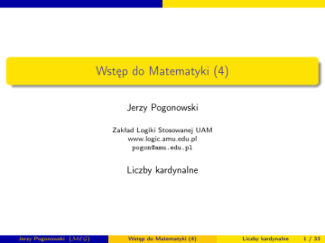 Wstęp do Matematyki (4) Jerzy Pogonowski Zakład Logiki Stosowanej UAM www.logic.amu.edu.pl [email protected] Liczby kardynalne Jerzy Pogonowski (MEG) Wstęp do Matematyki (4) Liczby kardynalne 1 / 33 Wprowadzenie Wprowadzenie Ta prezentacja ma charakter mocno Humanistyczny. Mówimy w niej mianowicie o bardzo ezoterycznych bytach: liczbach porządkowych i kardynalnych. Z czysto matematycznego punktu widzenia, używane pojęcia są bardzo proste — wykorzystujemy pojęcia teorii mnogości takie, jak: zbiór, relacja, funkcja. Rozumienie przedstawionych konstrukcji wymaga jednak, oprócz skupienia, także wyobraźni. A tego właśnie — wyobraźni — Humanistkom przecież nie brakuje. Jerzy Pogonowski (MEG) Wstęp do Matematyki (4) Liczby kardynalne 2 / 33 Wprowadzenie Czym jest liczba elementów zbioru? Posługując się definicjami: pojęcia równoliczności zbioru N wszystkich liczb naturalnych (definicja von Neumanna) nieskończoności (w sensie Dedekinda) możemy zdefiniować, jak widzieliśmy, zbiory: skończone, przeliczalne i nieprzeliczalne. Z Twierdzenia Cantora wynika, że istnieją nierównoliczne zbiory nieskończone. Jak określić liczbę ich elementów? Jak liczby te porównywać? W jaki sposób określić na nich działania arytmetyczne? Jerzy Pogonowski (MEG) Wstęp do Matematyki (4) Liczby kardynalne 3 / 33 Równoliczność Równoliczność Będziemy stosować oznaczenia: Jeśli zbiory X i Y są równoliczne (czyli gdy istnieje bijekcja z X na Y ), to piszemy: |X | = |Y |. Jeśli istnieje iniekcja z X w Y , to piszemy |X | 6 |Y |. Jeśli |X | 6 |Y | oraz nie zachodzi |X | = |Y |, to piszemy |X | < |Y |. Mówimy, że: zbiory X i Y są tej samej mocy, gdy są równoliczne, czyli gdy |X | = |Y |. zbiór X jest mocy niewiększej niż zbiór Y , gdy |X | 6 |Y |. zbiór X jest mocy mniejszej niż zbiór Y , gdy |X | < |Y |. Uwaga. To tylko sposób mówienia. Nie zdefiniowaliśmy, czym są moce zbiorów. Jerzy Pogonowski (MEG) Wstęp do Matematyki (4) Liczby kardynalne 4 / 33 Równoliczność Równoliczność Dla dowolnych zbiorów A, B, C , D: Jeśli |A| = |B|, |C | = |D| oraz A ∩ B = ∅ = C ∩ D, to |A ∪ B| = |C ∪ D|. Jeśli |A| = |B|, to |℘(A)| = |℘(B)|. |℘(A)| = |{0, 1}A |. Jeśli |A| = |C | i |B| = |D|, to |AB | = |C D |. Jeśli B ∩ C = ∅, to dla dowolnego A: |AB∪C | = |AB × AC |. (|AB )C | = |AB×C |. |A| < |℘(A)|. Uwaga! Aksjomaty teorii mnogości ZF nie rozstrzygają, czy z tego, że |A| < |B| wynika, iż |℘(A)| < |℘(B)|. Jerzy Pogonowski (MEG) Wstęp do Matematyki (4) Liczby kardynalne 5 / 33 Równoliczność Twierdzenie Cantora-Bernsteina Twierdzenie Cantora-Bernsteina Lemat Banacha. Niech f : A → B oraz g : b → A będą iniekcjami. Wtedy istnieją zbiory A1 , A2 , B1 , B2 takie, że: A1 ∪ A2 = A, A1 ∩ A2 = ∅, B1 ∪ B2 = B, B1 ∩ B2 = ∅, f [A1 ] = B1 , g [B2 ] = a2 . Twierdzenie Cantora-Bernsteina. Jeśli |A| 6 |B| oraz |B| 6 |A|, to |A| = |B|. Jerzy Pogonowski (MEG) Wstęp do Matematyki (4) Liczby kardynalne 6 / 33 Równoliczność Zbiory przeliczalne Zbiory przeliczalne Jak może wiesz ze szkoły, piszemy |A| = ℵ0 zamiast |A| = |N| (czyli sformułowania: A jest przeliczalny). Skończony produkt zbiorów przeliczalnych jest przeliczalny. Suma przeliczalnej rodziny zbiorów przeliczalnych jest przeliczalna. Równoliczność |N × N| = |N| ustalają np. bijekcje: f (n, m) = 2n · (2m + 1) − 1 + n. g (n, m) = n+m+1 2 Równoliczność Z × N oraz Q ustala np. suriekcja: f (n, m) = Jerzy Pogonowski (MEG) n . m+1 Wstęp do Matematyki (4) Liczby kardynalne 7 / 33 Równoliczność Zbiory mocy kontinuum Zbiory mocy kontinuum Jak może wiesz ze szkoły, jeśli |A| = |R|, to mówimy, że A jest mocy kontinuum i piszemy |A| = c. |℘(N)| = c. |N| < |R|. |R × R| = |R|. Zbiory mocy kontinuum są nieprzeliczalne. Istnieją też zbiory nieprzeliczalne, które nie są mocy kontinuum: np. zbiór ℘(R). Jerzy Pogonowski (MEG) Wstęp do Matematyki (4) Liczby kardynalne 8 / 33 Liczby porządkowe Liczby porządkowe Mówimy, że zbiór X jest: przechodni, gdy każdy element X jest podzbiorem X ; liczbą porządkową, gdy X jest zbiorem przechodnim i dla wszystkich różnych elementów Y , Z ∈ X zachodzi alternatywa: Y ∈ Z lub Z ∈ Y; liczbą kardynalną, gdy jest liczbą porządkową i |Y | < |X | dla wszystkich Y ∈ X . Przypominamy, że X ∗ oznacza zbiór X ∪ {X }. Niech ω oznacza ⊆-najmniejszy zbiór zawierający jako element zbiór ∅ oraz domknięty na operację ∗ (tj. zawierający, wraz z każdym elementem X także element X ∗ ). Liczby porządkowe oznaczamy literami α, β, γ, itd. Jerzy Pogonowski (MEG) Wstęp do Matematyki (4) Liczby kardynalne 9 / 33 Liczby porządkowe Liczby porządkowe Elementy dowolnej liczby porządkowej są liczbami porządkowymi. Dla dowolnych elementów X , Y liczby porządkowej α: X ⊆ Y wtedy i tylko wtedy, gdy X ∈ Y lub X = Y . Dla dowolnych liczb porządkowych α, β: α ∈ β lub β ∈ α lub α = β. Dla dowolnych liczb porządkowych definiujemy: α ≺ β wtedy i tylko wtedy, gdy α ∈ β. Niech α β oznacza, że α ≺ β lub α = β. Wtedy: Dla każdej liczby porządkowej α, relacja dobrze porządkuje α. Jeśli α jest liczbą porządkową i X ⊆ α jest odcinkiem -początkowym, to: X = α lub X = β, gdzie β jest -najmniejszym elementem w α − X . Jerzy Pogonowski (MEG) Wstęp do Matematyki (4) Liczby kardynalne 10 / 33 Liczby porządkowe Liczby porządkowe Każdy odcinek początkowy liczby porządkowej jest liczbą porządkową. Jeśli α jest liczbą porządkową, to α ∪ {α} jest liczbą porządkową. S Jeśli A jest zbiorem liczb porządkowych, to A jest liczbą porządkową. Nie istnieje zbiór wszystkich liczb porządkowych. Zermelo. Dla każdego zbioru X istnieje dobry porządek w X . Ernst Zermelo (1871–1953) był twórcą pierwszej aksjomatyki dla teorii mnogości. Jedną z głównych motywacji dla stworzenia tej aksjomatyki był właśnie dowód pow