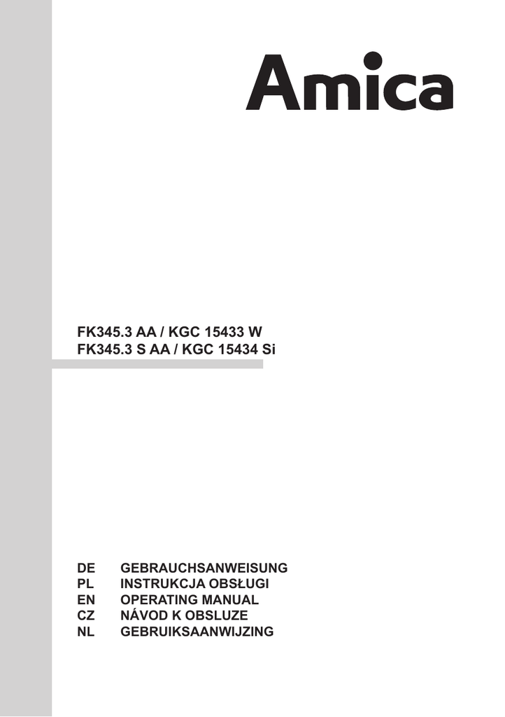 FK345.3 AA / KGC 15433 W FK345.3 S AA / KGC 15434 Si DE PL EN CZ NL GEBRAUCHSANWEISUNG INSTRUKCJA OBSŁUGI OPERATING MANUAL NÁVOD K OBSLUZE GEBRUIKSAANWIJZING INHALT SICHERHEITSHINWEISE INBETRIEBNAHME UND BETRIEBSBEDINGUNGEN DES GERÄTES BEDIENUNG UND FUNKTIONEN ENERGIESPARENDE NUTZUNG DES KÜHLSCHRANKS ABTAUEN, REINIGEN UND PFLEGEN LOKALISIERUNG VON STÖRUNGEN UMWELTSCHUTZ KLIMAKLASSE 8 8 10 12 13 14 15 16 SPIS TREŚCI WSKAZÓWKI DOTYCZĄCE BEZPIECZEŃSTWA UŻYTKOWANIA INSTALACJA I WARUNKI PRACY URZĄDZENIA OBSŁUGA I FUNKCJE JAK EKONOMICZNIE UŻYTKOWAĆ LODÓWKĘ ODSZRANIANIE, MYCIE I KONSERWACJA LOKALIZACJA USTEREK OCHRONA ŚRODOWISKA KLASA KLIMATYCZNA GWARANCJA, OBSŁUGA POSPRZEDAŻNA 17 17 19 21 22 23 24 25 25 TABLE OF CONTENTS GUIDELINES CONCERNING THE SAFETY OF USE 26 INSTALLATION AND OPERATING CONDITIONS OF THE APPLIANCE26 OPERATION AND FUNCTIONS 28 USING THE REFRIGERATOR EFFICIENTLY 30 DEFROSTING, WASHING AND MAINTENANCE 31 TROUBLE-SHOOTING 32 ENVIRONMENTAL PROTECTION 33 CLIMATE RANGE 34 OBSAH POKYNY TÝKAJÍCÍ SE BEZPEČNOSTI POUŽÍVÁNÍ INSTALACE A PROVOZNÍ PODMÍNKY SPOTŘEBIČE OBSLUHA A FUNKCE JAK EKONOMICKY POUŽÍVAT CHLADNIČKU ODMRAZOVÁNÍ, MYTÍ A ÚDRŽBA URČOVÁNÍ ZÁVAD OCHRANA ŽIVOTNÍHO PROSTŘEDÍ KLIMATICKÁ TŘÍDA 35 35 37 39 40 41 42 43 INHOUD AANWIJZINGEN BETREFFENDE VEILIGHEID VAN GEBRUIK IINSTALLATIE EN WERKOMSTANDIGHEDEN VAN HET APPARAAT BEDIENING EN FUNCTIES HOE KAN DE KOELKAST ECONOMISCH GEBRUIKT WORDEN? ONTDOOIEN, WASSEN EN ONDERHOUD STORINGEN VINDEN EN VERHELPEN MILIEUBESCHERMING 44 44 46 48 49 50 51 DE Geehrte Kunden, das Kühl- und Gefriergerät steht für eine außergewöhnlich leichte Benutzung und ausgezeichnete Effektivität. Jedes Gerät wurde noch in der Fabrik auf Sicherheit und Funktionalität sorgfältig überprüft. Wir weisen Sie darauf hin, die Gebrauchsanweisung vor der Inbetriebnahme genau zu lesen. Achtung! Das Kühl- und Gefriergerät ist ausschließlich im Haushalt zu gebrauchen. Der Hersteller behält sich das Recht vor, bestimmte Änderungen, die den Betrieb des Gerätes nicht beeinflussen, vorzunehmen. Zulässig sind Ausstattungsänderungen sowie Veränderungen im Innen- und Außendesign, die sowohl die Funktionalität des Gerätes als auch seine Sicherheit nicht beeinträchtigen. PL Szanowni Państwo, Chłodziarko-zamrażarka Amica to połączenie wyjątkowej łatwości obsługi i doskonałej efektywności. Każde urządzenie przed opuszczeniem fabryki zostało dokładnie sprawdzone pod względem bezpieczeństwa i funkcjonalności. Prosimy Państwa o uważną lekturę instrukcji obsługi przed uruchomieniem urządzenia. Uwaga! Chłodziarko-zamrażarka przeznaczona jest wyłącznie do użytku domowego. Producent zastrzega sobie możliwość dokonywania zmian nie wpływających na działanie urządzenia. Dopuszczalne są zmiany w wyposażeniu, wystroju wewnętrznym i zewnętrznym wyrobu, nie wpływające na jego funkcjonalność i bezpieczeństwo. EN Dear Customer, This fridge-freezer combines exceptional user-friendliness and excellent efficiency. Prior to dispatch, each unit was carefully checked for its safety and operating capabilities. Before starting the appliance, please read this Operating Manual carefully Note! This fridge-freezer is intended for household use only. The manufacturer reserves the right to introduce modifications, which do not affect the operation of the appliance. CZ Vážení klienti, Chladnička s mrazničkou Amica je spojením výjimečně jednoduché obsluhy a dokonalé účinnosti. Každý spotřebič byl před expedicí z továrny důkladně zkontrolován s ohledem na bezpečnost a funkčnost. Prosíme Vás, abyste si důkladně přečetli návod k obsluze před uvedením spotřebiče do provozu. Upozornění! Chladnička s mrazničkou je určena výlučně pro domácí použití. Výrobce si vyhrazuje možnost provádění změn neovlivňujících fungování spotřebiče. Změny jsou přípustné ve vybavení, vnitřním a vnějším dizajnu, neovlivňující jeho funkčnost a bezpečnost. NL Geachte Klant, De vriezer biedt u een verbinding van makkelijke bediening en uitstekende efficiency. Elk apparaat, voordat het de fabriek uitgaat, wordt nauwkeurig gecontroleerd op het gebied van veiligheid en functionaliteit. Wij adviseren om deze handleiding aandachtig te lezen, voordat u het apparaat in gebruik neemt. Let Op! De vriezer is alleen voor thuisgebruik bestemd. Producent behoudt zich het recht voor op veranderingen die de functie van het apparaat niet beinvloeden. Wijzigingen in de uitrusting, binnen- en buiten inrichting van het product, die zijn werking en veiligheid niet aantasten, zijn toegelaten. 9 10 1 5 2 6 3 1 2 7 1 4 5 4 8 2 3 9 10 11 16 12 14 15 DE SICHERHEITSHINWEISE lDas aus dem Gefrierraum her- ausgenommene Gefriergut (Eis, Eiswürfel usw.) darf nicht direkt in den Mund genommen werden, es könnte schmerzhafte Erfrierungen verursachen. lDas Kühlsystem niemals beschädigen. Das Kältemittel ist leicht entflammbar. Bei Kontakt mit den Augen sofort gründlich mit Wasser spülen und einen Arzt konsultieren. l Das Gerät darf nur von autorisierten Personen, die das Gerät kennen, bedient werden. l Beachten Sie genau die Gebrauchtsanweisung. Der Hersteller haftet bei Nichtbeachtung nicht für Schäden. lBewahren Sie die Gebrauchtsanweisung gut auf! l Kindern ist die unbeaufsichtigte Benutzung des Gerätes verboten! lDas Gerät ist nur für den Gebrauch in Innenräumen geeignet, allerdings nicht in unbeheizten Kellerräumen, Hausfluren oder Sommerhäusern. lZum Aufstellen und Verschieben des Gerätes dürfen nie die Türgriffe, die Kondensatorröhrchen oder die Kompressoreinheit benutzt werden. l Ist die Anschlussleitung beschädigt, muss sie ersetzt werden. Diese darf nur von einer autorisierten Fachwerkstatt ausgewechselt werden. l Das Kühl- und Gefriergerät sollte während des Transports oder der Aufstellung nur bis zu 40° geneigt werden. Ist der Winkel größer, darf das G