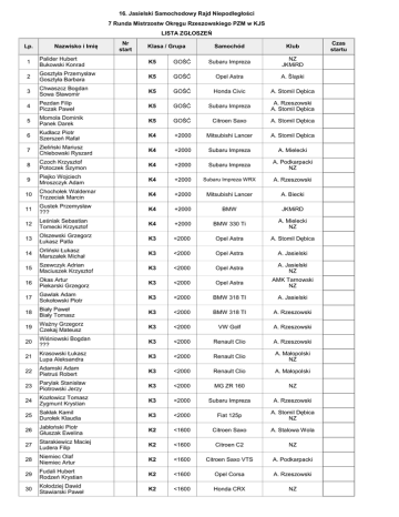 16. Jasielski Samochodowy Rajd Niepodległości 7 Runda Mistrzostw Okręgu Rzeszowskiego PZM w KJS LISTA ZGŁOSZEŃ Lp. Nazwisko i Imię Nr start Klasa / Grupa Samochód Klub Czas startu 1 Palider Hubert Bukowski Konrad K5 GOŚĆ Subaru Impreza NZ JKMiRD 10:00 2 Gosztyła Przemysław Gosztyła Barbara K5 GOŚĆ Opel Astra A. Śląski 10:02 3 Chwaszcz Bogdan Sowa Sławomir K5 GOŚĆ Honda Civic A. Stomil Dębica 10:04 4 Pezdan Filip Piczak Paweł K5 GOŚĆ Subaru Impreza A. Rzeszowski A. Stomil Dębica 10:06 5 Momola Dominik Panek Darek K5 GOŚĆ Citroen Saxo A. Stomil Dębica 10:08 6 Kudłacz Piotr Szerszeń Rafał K4 +2000 Mitsubishi Lancer A. Stomil Dębica 10:10 7 Zieliński Mariusz Chlebowski Ryszard K4 +2000 Subaru Impreza A. Mielecki 10:12 8 Czoch Krzysztof Potoczek Szymon K4 +2000 Subaru Impreza A. Podkarpacki NZ 10:14 9 Piejko Wojciech Mroszczyk Adam K4 +2000 Subaru Impreza WRX A. Rzeszowski 10:16 10 Chochołek Waldemar Trzzeciak Marcin K4 +2000 Mitsubishi Lancer A. Biecki 10:18 11 Gustek Przemysław ??? K4 +2000 BMW JKMiRD 10:20 12 Leśniak Sebastian Tomecki Krzysztof K4 +2000 BMW 330 Ti A. Mielecki NZ 10:22 13 Olszewski Grzegorz Łukasz Patla K3 <2000 Opel Astra A. Stomil Dębica 10:24 14 Orliński Łukasz Marszałek Michał K3 <2000 Opel Astra A. Jasielski 10:26 15 Szewczyk Adrian Maciuszek Krzysztof K3 <2000 Opel Astra A. Jasielski NZ 10:28 16 Okas Artur Piekarski Grzegorz K3 <2000 Opel Astra AMK Tarnowski NZ 10:30 17 Gawlak Adam Sokołowski Piotr K3 <2000 BMW 318 TI A. Jasielski 10:32 18 Biały Paweł Biały Tomasz K3 <2000 BMW 318 TI A. Rzeszowski 10:34 19 Ważny Grzegorz Czekaj Mateusz K3 <2000 VW Golf A. Rzeszowski 10:36 20 Wiśniowski Bogdan ??? K3 <2000 Renault Clio A. Rzeszowski 10:38 21 Krasowski Łukasz Lupa Aleksandra K3 <2000 Renault Clio A. Małopolski NZ 10:40 22 Adamski Adam Pietruś Robert K3 <2000 Renault Clio A. Małopolski 10:42 23 Parylak Stanisław Piotrowski Jerzy K3 <2000 MG ZR 160 NZ 10:44 24 Kozłowicz Tomasz Zygmunt Krystian K3 <2000 Subaru Impreza A. Rzeszowski 10:46 25 Sakłak Kamil Durołek Klaudia K3 <2000 Fiat 125p A. Stomil Dębica NZ 10:48 26 Jabłoński Piotr Głuszak Ewelina K2 <1600 Citroen Saxo A. Stalowa Wola 10:50 27 Starakiewicz Maciej Ludera Filip K2 <1600 Citroen C2 NZ 10:52 28 Niemiec Olaf Niemiec Artur K2 <1600 Citroen Saxo VTS A. Podkarpacki 10:54 29 Fudali Hubert Rodzeń Krystian K2 <1600 Opel Corsa A. Rzeszowski 10:56 30 Kołodziej Dawid Stawiarski Paweł K2 <1600 Honda CRX NZ 10:58 31 Gajewski Marek Knapczyk Stanisław K2 <1600 Honda Civic NZ A. Zamkowy 11:00 32 Wojtunik Adam Gryzło Michał K2 <1600 Honda Civic A. Kielecki A. Biecki 11:02 33 Pomprowicz Przemysław Radzik Grzegorz K2 <1600 Honda Civic JKMiRD 11:04 34 Wiszyński Arkadiusz Bodniak Mateusz K1 <1400 Peugeot 106 A. Biecki 11:06 35 Wronkowicz Jacek Orliński Wiesław K1 <1400 Peugeot 106 A. Biecki 11:08 36 Skroban Marcin Wagner Jakub K1 <1400 Peugeot 106 A. Biłgoraj 11:10 37 Osękowski Przemysław Turoń Patryk K1 <1400 Honda Civic NZ A. Rzeszowski 11:12 38 Gurgul Piotr Kubik Szymon K1 <1400 Suzuki Swift AMK Tarnowski NZ 11:14 39 Kisała Karolina Przybyło Krzysztof K1 <1400 Suzuki Swift NZ A. Rzeszowski 11:16 40 Przywara Dominik Piekarska Aleksandra K FIAT Fiat CC A.Stomil Dębica NZ 11:18 41 Florkiewicz Adam Sulisz Jan K FIAT Fiat SC A. Stomil Dębica NZ 11:20 42 Dubanik Mariusz Dubanik Grzegorz K FIAT Fiat SC A. Stomil Dębica NZ 11:22 43 Michałek Andrzej Michałek Piotr K FIAT Fiat SC A. Stalowa Wola 11:24 44 Bogusławski Aleksander Rusinek Tomasz K FIAT Fiat SC A. Stalowa Wola 11:26 45 Niemiec Jerzy Saganowski Bartosz K FIAT Fiat SC A. Stalowa Wola NZ 11:28 46 Szczepan Michał Kołodziej Sławomir K FIAT Fiat CC NZ 11:30 47 Dunaj Ryszard Dunaj Kinga K FIAT Fiat CC A. Małopolski 11:32 48 Szalacha Patryk Banaś Maciej K FIAT Fiat SC NZ 11:34 49 Górski Michał Sajdak Adrian K FIAT Fiat CC A. Śląski NZ 11:36 50 Bukowiec Damian Biłos Damian K FIAT Fiat SC NZ 11:38 51 Długosz Anna Mezei Martin K FIAT Fiat SC NZ 11:40 52 Leśniak Sławomir Leśniak Artur K FIAT Fiat CC NZ Dyrektor KJS Stanisław Radzik