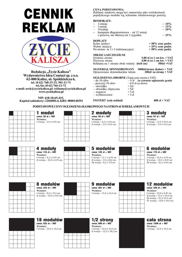 CENNIK REKLAM CENA PODSTAWOWA: Reklamy ramkowe mog¹ byæ zamawiane jako wielokrotnoæ pojedyñczego modu³u wg schematu zilustrowanego poni¿ej. BONIFIKATY: 3 emisje 5 emisji 10 emisji kampania d³ugoterminowa od 12 emisji z przerw¹ nie d³u¿sz¹ ni¿ 2 tygodnie DOP£ATY Kolor (pe³ny) Wybór miejsca: Na stronie nr 2 i 3 (informacyjne): 10% 15% 20% 25% + 50% ceny podst. + 25% ceny podst. + 50% ceny podst. MIEJSCA SZCZEGÓLNE Ostatnia strona: 3,00 z³ za 1 cm kw. + VAT Pierwsza strona: 4,00 z³ za 1 cm kw. + VAT Reklama na 1 stronie obok winiety (6x8 cm) 500z³ +VAT Redakcja ¯ycie Kalisza Wydawnictwo Idea Contact sp. z o.o. 62-800 Kalisz, ul. Spó³dzielcza 6, tel. (0 62) 768-33-33, 501-11-71 tel./fax (0 62) 766-12-72 e-mail: [email protected] [email protected] www.zyciekalisza.pl NIP: 618-18-65-415, Kapita³ zak³adowy: 2204000 z³, KRS: 0000140391 MATERIA£ SPONSOROWANY 1800z³/strona (kolor) + VAT Opracowanie dziennikarskie tekstu 200z³/ za stronê + VAT OG£OSZENIA DROBNE (Tutaj ceny razem z VAT) do 10 s³ów 9 z³ co czwarte og³oszenie gratis powy¿ej 10 s³ów 0,9 z³ za s³owo obwódka + 5z³ obwódka eliptyczna + 5z³ negatyw + 5 z³ wyt³uszczenie + 3 z³ INSTERT (ca³y nak³ad) PODSTAWOWE CENY OG£OSZENIA RAMKOWEGO NA STRONACH REKLAMOWYCH 800 z³ + VAT Fax do wydawnictwa: (062) 766-12-72 ........, dnia:........................... nazwa firmy .......................................... .......................................... .......................................... .......................................... NIP .......................................... Zamówienie reklamy w ¯yciu Kalisza Niniejszym zlecamy wydawnctwu Idea Contact sp. z o.o. publikacjê w tygodniku ¯yciu Kalisza nastêuj¹cej reklamy : iloæ modu³ów:............ iloæ emisji:................ data rozpoczêcia emisji:......................... treæ reklamy:............. wysy³amy e-mailem na adres [email protected] lub w za³¹czniku (najlpiej pliki w postaci: *cdr, *eps, lub inne) inne ustalenia:............ UPOWA¯NIENIE STA£E jestem p³atnikiem podatku VAT i upowa¿niam firmê IDEA CONTACT sp. z o.o. do wystawienia faktury bez mojego podpisu .................................... czytelny podpis osoby zamawiaj¹cej Fax do wydawnictwa: (062) 766-12-72