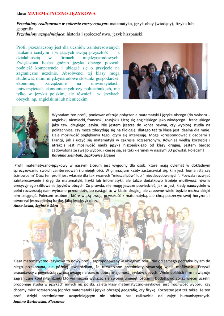 klasa MATEMATYCZNO-JĘZYKOWA Przedmioty realizowane w zakresie rozszerzonym: matematyka, język obcy (wiodący), fizyka lub geografia. Przedmioty uzupełniające: historia i społeczeństwo, język hiszpański. Profil przeznaczony jest dla uczniów zainteresowanych naukami ścisłymi i wiążących swoją przyszłość z działalnością w firmach międzynarodowych. Zwiększona liczba godzin języka obcego pozwoli podnieść kompetencje i ubiegać się o przyjęcie na zagraniczne uczelnie. Absolwenci tej klasy mogą studiować m.in. międzynarodowe stosunki gospodarcze, ekonomię, zarządzanie na uniwersytetach, uniwersytetach ekonomicznych czy politechnikach, nie tylko w języku polskim, ale również w językach obcych, np. angielskim lub niemieckim. Wybrałam ten profil, ponieważ oferuje połączenie matematyki i języka obcego (do wyboru – angielski, niemiecki, francuski, rosyjski). Uczę się angielskiego jako wiodącego i francuskiego jako tzw. drugiego języka. Nie jestem jeszcze do końca pewna, czy wybiorę studia na politechnice, czy może zdecyduję się na filologię, dlatego też ta klasa jest idealna dla mnie. Daje możliwość pogłębiania tego, czym się interesuję. Mogę korespondować z osobami z Francji, jak i uczyć się matematyki w zakresie rozszerzonym. Również wielką korzyścią i atrakcją jest możliwość nauki języka hiszpańskiego od klasy drugiej. Jestem bardzo zadowolona ze swego wyboru i cieszę się, że taki kierunek w naszym LO powstał. Polecam! Karolina Siembab, Ząbkowice Śląskie Profil matematyczno-językowy w naszym Liceum jest wygodny dla osób, które mają dylemat w dokładnym sprecyzowaniu swoich zainteresowań i umiejętności. W gimnazjum każdy zastanawiał się, kim jest: humanistą czy ścisłowcem? Otóż ten profil jest właśnie dla tak zwanych "mieszańców" lub " niezdecydowanych". Pozwala rozwijać zainteresowanie i dryg do matematyki, fizyki lub informatyki, ale także dodatkowo istnieje możliwość równie precyzyjnego szlifowania języków obcych. Co prawda, nie mogę jeszcze powiedzieć, jak to jest, kiedy nauczyciele w pełni rozszerzają nam wybrane przedmioty, bo nastąpi to w klasie drugiej, ale zapewne wiele będzie można dzięki nim osiągnąć. Polecam osobom, które wiążą swoją przyszłość z matematyką, ale chcą poszerzyć swój horyzont i otworzyć jeszcze jedną furtkę, jaką jest język obcy. Anna Laska, Srebrna Góra Klasa matematyczno-językowa to nowy profil, zaproponowany w ubiegłym roku. Nie od samego początku byłam do niego przekonana, ale później stwierdziłam, że rozszerzone przedmioty stwarzają wiele możliwości. Przyszli pracodawcy z pewnością zwrócą uwagę na bardzo dobrą znajomość języków obcych. Wiele polskich firm nawiązuje zagraniczne kontakty, dzięki którym można wykazać się swoimi umiejętnościami. Dodatkowo coraz więcej uczelni proponuje studia w językach innych niż polski. Zaletą klasy matematyczno-językowej jest możliwość wyboru, czy chcemy mieć rozszerzoną (oprócz matematyki i języka obcego) geografię, czy fizykę. Korzystne jest też także, że ten profil dzięki przedmiotom uzupełniającym nie odcina nas całkowicie od zajęć humanistycznych. Joanna Garbowska, Kluczowa
