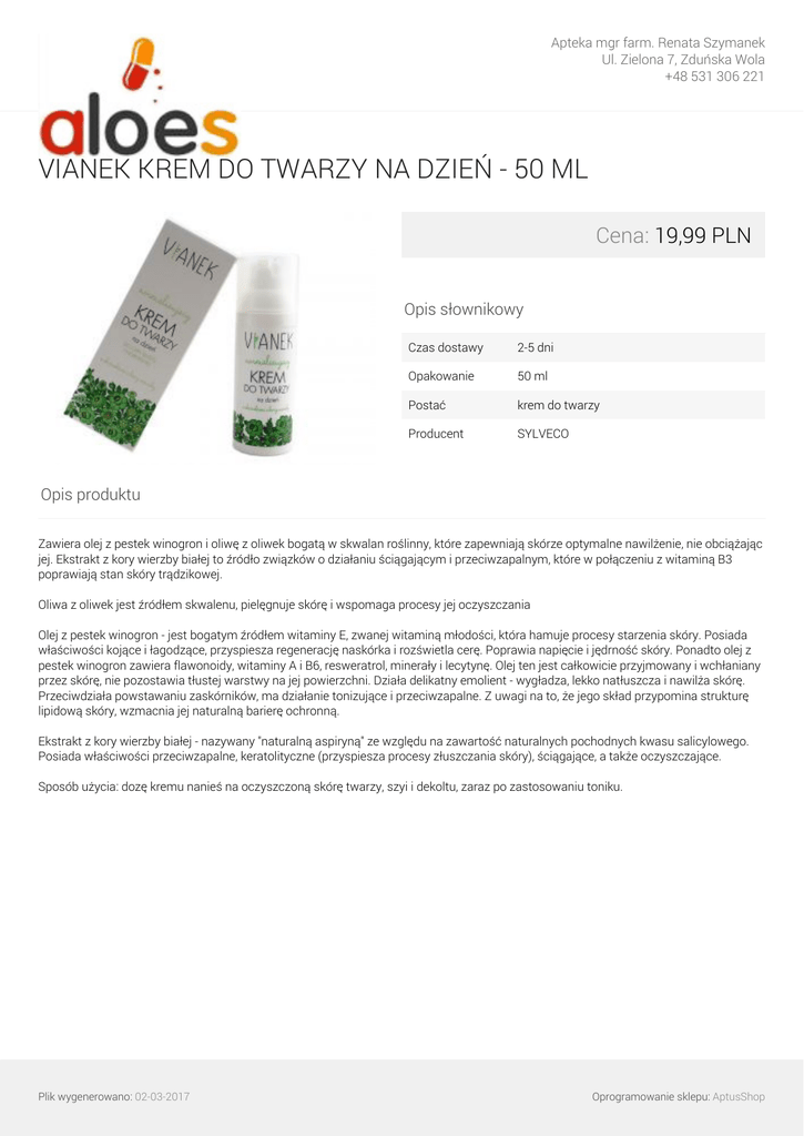 Apteka mgr farm. Renata Szymanek Ul. Zielona 7, Zduńska Wola +48 531 306 221 VIANEK KREM DO TWARZY NA DZIEŃ - 50 ML Cena: 19,99 PLN Opis słownikowy Czas dostawy 2-5 dni Opakowanie 50 ml Postać krem do twarzy Producent SYLVECO Opis produktu Zawiera olej z pestek winogron i oliwę z oliwek bogatą w skwalan roślinny, które zapewniają skórze optymalne nawilżenie, nie obciążając jej. Ekstrakt z kory wierzby białej to źródło związków o działaniu ściągającym i przeciwzapalnym, które w połączeniu z witaminą B3 poprawiają stan skóry trądzikowej. Oliwa z oliwek jest źródłem skwalenu, pielęgnuje skórę i wspomaga procesy jej oczyszczania Olej z pestek winogron - jest bogatym źródłem witaminy E, zwanej witaminą młodości, która hamuje procesy starzenia skóry. Posiada właściwości kojące i łagodzące, przyspiesza regenerację naskórka i rozświetla cerę. Poprawia napięcie i jędrność skóry. Ponadto olej z pestek winogron zawiera flawonoidy, witaminy A i B6, resweratrol, minerały i lecytynę. Olej ten jest całkowicie przyjmowany i wchłaniany przez skórę, nie pozostawia tłustej warstwy na jej powierzchni. Działa delikatny emolient - wygładza, lekko natłuszcza i nawilża skórę. Przeciwdziała powstawaniu zaskórników, ma działanie tonizujące i przeciwzapalne. Z uwagi na to, że jego skład przypomina strukturę lipidową skóry, wzmacnia jej naturalną barierę ochronną. Ekstrakt z kory wierzby białej - nazywany "naturalną aspiryną" ze względu na zawartość naturalnych pochodnych kwasu salicylowego. Posiada właściwości przeciwzapalne, keratolityczne (przyspiesza procesy złuszczania skóry), ściągające, a także oczyszczające. Sposób użycia: dozę kremu nanieś na oczyszczoną skórę twarzy, szyi i dekoltu, zaraz po zastosowaniu toniku. Plik wygenerowano: 02-03-2017 Powered by TCPDF (www.tcpdf.org) Oprogramowanie sklepu: AptusShop