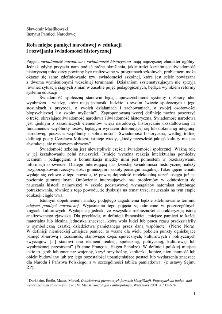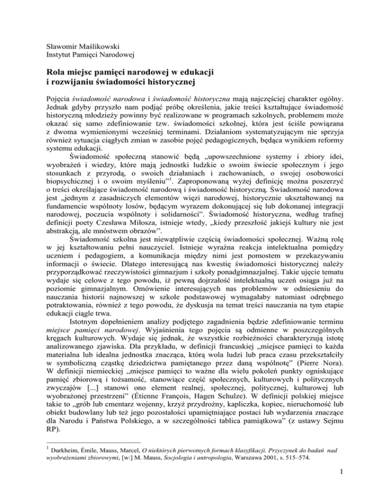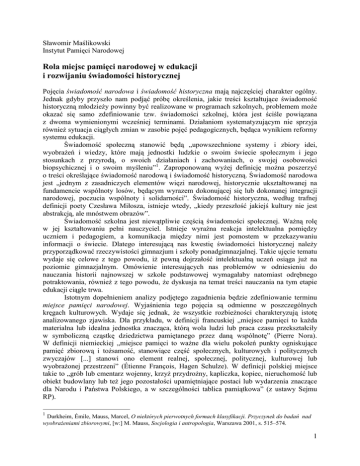 Sławomir Maślikowski Instytut Pamięci Narodowej Rola miejsc pamięci narodowej w edukacji i rozwijaniu świadomości historycznej Pojęcia świadomość narodowa i świadomość historyczna mają najczęściej charakter ogólny. Jednak gdyby przyszło nam podjąć próbę określenia, jakie treści kształtujące świadomość historyczną młodzieŜy powinny być realizowane w programach szkolnych, problemem moŜe okazać się samo zdefiniowanie tzw. świadomości szkolnej, która jest ściśle powiązana z dwoma wymienionymi wcześniej terminami. Działaniom systematyzującym nie sprzyja równieŜ sytuacja ciągłych zmian w zasobie pojęć pedagogicznych, będąca wynikiem reformy systemu edukacji. Świadomość społeczną stanowić będą „upowszechnione systemy i zbiory idei, wyobraŜeń i wiedzy, które mają jednostki ludzkie o swoim świecie społecznym i jego stosunkach z przyrodą, o swoich działaniach i zachowaniach, o swojej osobowości biopsychicznej i o swoim myśleniu”1. Zaproponowaną wyŜej definicję moŜna poszerzyć o treści określające świadomość narodową i świadomość historyczną. Świadomość narodowa jest „jednym z zasadniczych elementów więzi narodowej, historycznie ukształtowanej na fundamencie wspólnoty losów, będącym wyrazem dokonującej się lub dokonanej integracji narodowej, poczucia wspólnoty i solidarności”. Świadomość historyczna, według trafnej definicji poety Czesława Miłosza, istnieje wtedy, „kiedy przeszłość jakiejś kultury nie jest abstrakcją, ale mnóstwem obrazów”. Świadomość szkolna jest niewątpliwie częścią świadomości społecznej. WaŜną rolę w jej kształtowaniu pełni nauczyciel. Istnieje wyraźna reakcja intelektualna pomiędzy uczniem i pedagogiem, a komunikacja między nimi jest pomostem w przekazywaniu informacji o świecie. Dlatego interesującą nas kwestię świadomości historycznej naleŜy przyporządkować rzeczywistości gimnazjum i szkoły ponadgimnazjalnej. Takie ujęcie tematu wydaje się celowe z tego powodu, iŜ pewną dojrzałość intelektualną uczeń osiąga juŜ na poziomie gimnazjalnym. Omówienie interesujących nas problemów w odniesieniu do nauczania historii najnowszej w szkole podstawowej wymagałaby natomiast odrębnego potraktowania, równieŜ z tego powodu, Ŝe dyskusja na temat treści nauczania na tym etapie edukacji ciągle trwa. Istotnym dopełnieniem analizy podjętego zagadnienia będzie zdefiniowanie terminu miejsce pamięci narodowej. Wyjaśnienia tego pojęcia są odmienne w poszczególnych kręgach kulturowych. Wydaje się jednak, Ŝe wszystkie rozbieŜności charakteryzują istotę analizowanego zjawiska. Dla przykładu, w definicji francuskiej „miejsce pamięci to kaŜda materialna lub idealna jednostka znacząca, którą wola ludzi lub praca czasu przekształciły w symboliczną cząstkę dziedzictwa pamiętanego przez daną wspólnotę” (Pierre Nora). W definicji niemieckiej „miejsce pamięci to waŜne dla wielu pokoleń punkty ogniskujące pamięć zbiorową i toŜsamość, stanowiące część społecznych, kulturowych i politycznych zwyczajów [...] stanowi ono element realnej, społecznej, politycznej, kulturowej lub wyobraŜonej przestrzeni” (Étienne François, Hagen Schulze). W definicji polskiej miejsce takie to „grób lub cmentarz wojenny, krzyŜ przydroŜny, kapliczka, kopiec, nieruchomość lub obiekt budowlany lub teŜ jego pozostałości upamiętniające postaci lub wydarzenia znaczące dla Narodu i Państwa Polskiego, a w szczególności tablica pamiątkowa” (z ustawy Sejmu RP). 1 Durkheim, Émile, Mauss, Marcel, O niektórych pierwotnych formach klasyfikacji. Przyczynek do badań nad wyobraŜeniami zbiorowymi, [w:] M. Mauss, Socjologia i antropologia, Warszawa 2001, s. 515–574. 1 Próba określenia roli miejsc pamięci narodowej w edukacji, czyli w świadomości szkolnej, będzie zatem mniej lub bardziej udanym zabiegiem polegającym na określeniu zakresu wiedzy przeciętnego ucznia, czyli stanu jego świadomości historycznej, zarówno dotyczącej historii całego kraju, jak i dziejów regionu. Pomocne nam będą badania prowadzone przez pracującego na Uniwersytecie Jagiellońskim Marka Kucię, będącego niekwestionowanym pionierem w tej dziedzinie. Od ponad dekady próbuje on zdiagnozować wiedzę młodych Polaków o ojczystej historii, ogniskując swoje zainteresowania wokół zagadnień związanych z najwaŜniejszymi wydarzeniami z okresu II wojny światowej. Analizowaną grupą byli uczniowie pochodzący z róŜnych regionów Polski, dlatego z duŜym prawdopodobieństwem moŜna postawić tezę o reprezentatywności wyników analiz. Jest zrozumiałe, Ŝe wydarzenia historyczne były sytuowane zarówno w kontekście dziejowym, jak i w ściśle określonym miejscu. To właśnie umiejętność identyfikacji przez ucznia wydarzenia oraz miejsca z nim związanego pozwalała na określenie stanu jego świadomości historycznej. Tutaj trzeba stwierdzić, Ŝe w trakcie ankiet przeprowadzanych w środowisku krakowskim uczniowie wykazywali się stosunkowo dobrą znajomością historii. Marek Kucia podczas opracowywania ankiety dąŜył do wykroczenia poza wątek martyrologiczny, dlatego w kwestionariuszu pojawiły się pytania nie tylko o Oświęcim czy Katyń, lecz takŜe np. o agresję radziecką z 17 września 1939 r. Spośród przebadanych w 2005 r. młodych ludzi aŜ 60% uznało, Ŝe najwaŜniejszym miejscem pamięci jest dla Polaków Oświęcim, a wydarzenia, które się tam rozegrały, pojmowane są jako najbardziej tragiczne w całej historii II wojny światowej. Na kolejnej pozycji wymieniono agresję niemiecką na Polskę 1 września 1939 r. (18%), a następnie powstanie warszawskie (6%), obronę Westerplatte i zbrodnię katyńską (po 4% wskazań). Co wydaje się ciekawe, zarówno starcia pod Lenino, jak i bitwę pod Monte Cassino wymieniło jedynie po 2% ankietowanych. Agresję radziecką z 17 wrześni