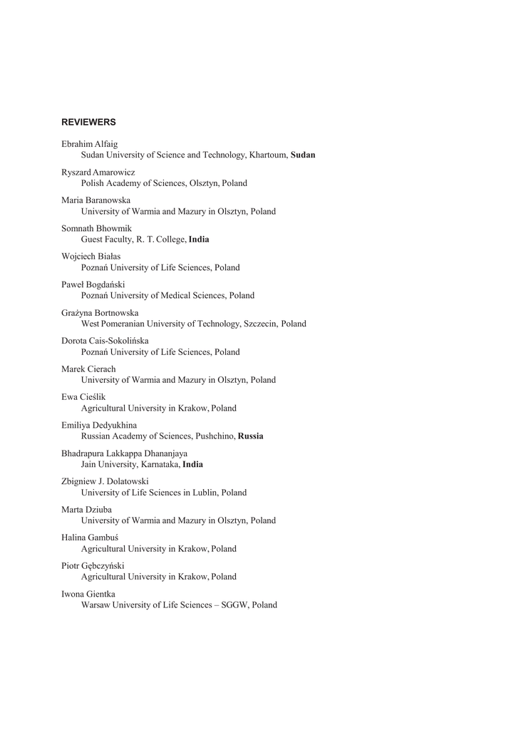 REVIEWERS Ebrahim Alfaig Sudan University of Science and Technology, Khartoum, Sudan Ryszard Amarowicz Polish Academy of Sciences, Olsztyn, Poland Maria Baranowska University of Warmia and Mazury in Olsztyn, Poland Somnath Bhowmik Guest Faculty, R. T. College, India Wojciech Białas Poznań University of Life Sciences, Poland Paweł Bogdański Poznań University of Medical Sciences, Poland Grażyna Bortnowska West Pomeranian University of Technology, Szczecin, Poland Dorota Cais-Sokolińska Poznań University of Life Sciences, Poland Marek Cierach University of Warmia and Mazury in Olsztyn, Poland Ewa Cieślik Agricultural University in Krakow, Poland Emiliya Dedyukhina Russian Academy of Sciences, Pushchino, Russia Bhadrapura Lakkappa Dhananjaya Jain University, Karnataka, India Zbigniew J. Dolatowski University of Life Sciences in Lublin, Poland Marta Dziuba University of Warmia and Mazury in Olsztyn, Poland Halina Gambuś Agricultural University in Krakow, Poland Piotr Gębczyński Agricultural University in Krakow, Poland Iwona Gientka Warsaw University of Life Sciences – SGGW, Poland Suvroma Gupta Haldia Institute of Technology, Haldia, India Michał Halagarda Agricultural University in Krakow, Poland Mohamed Fawzy Ramadan Hassanien Zagazig University, Sharkia, Egypt Dorota Jankowiak West Pomeranian University of Technology, Szczecin, Poland Andrzej Jarmoluk Wrocław University of Environmental and Life Sciences, Poland Katarzyna Kajak-Siemaszko Warsaw University of Life Sciences – SGGW, Poland Salih Karasu Erciyes University, Kayseri, Turkey Anna Kocira The State School of Higher Education in Chełm, Poland Jarosław Kowalik University of Warmia and Mazury in Olsztyn, Poland Wanda Kudełka Cracow University of Economics, Poland Radosław Kujawski Institute of Natural Fibres and Medicinal Plants, Poznań, Poland Secundino López Universidad de Leon, Spain Edyta Mądry Poznań University of Medical Sciences, Poland Abraham Wall Medrano Universidad Autónoma de Ciudad Juárez, Mexico Iwona Michalska-Pożoga Koszalin University of Technology, Poland Rasim Mogulkoc Selcuk University, Konya, Turkey Ken Nickerson University of Nebrasca-Lincoln, USA Anna Olejnik Poznań University of Life Sciences, Poland Muthusamy Palaniswamy Karpagam University, India Roman Przybylski University of Lethbridge, Canada Sabrina Ratti University of Milan, Italy Abdur Rauf University of Swabi, Khyber Pakhtunkhwa, Pakistan Kamila Rybczyńska University of Information Technology and Management in Rzeszow, Poland Mahammed Athar Alli Saikh Faculty of Health Sciences, Shiats, Uttar Pradesh, India Katarzyna Samborska Warsaw University of Life Sciences – SGGW, Poland Ted Schevey University of Illinois, USA Marcin Schmidt Poznań University of Life Sciences, Poland Rohit Sharma National Dairy Research Institute, India Alexander G. Shleikin St. Petersburg National Research University of Information Technologies, Mechanics and Optics, Russia Idzi Siatkowski Poznań University of Life Sciences, Poland Bartosz Sołowiej University of Life Sciences in Lublin, Poland Zbigniew Sroka Wrocław Medical University, Poland Halina Staniek Poznań University of Life Sciences, Poland Monika Szulińska Poznań University of Medical Sciences, Poland Mariusz Szymczak West Pomeranian University of Technology, Szczecin, Poland Michał Świeca University of Life Sciences in Lublin, Poland Alexey Tinkov Orenburg State Medical Academy, Russia Hayrettin Toylan Kırklareli University, Turkey Katarzyna Waszkowiak Poznań University of Life Sciences, Poland Adam Waśko University of Life Sciences in Lublin, Poland Erwin Wąsowicz University of Physical Education in Poznań, Poland Agnieszka Wójtowicz University of Life Sciences in Lublin, Poland
