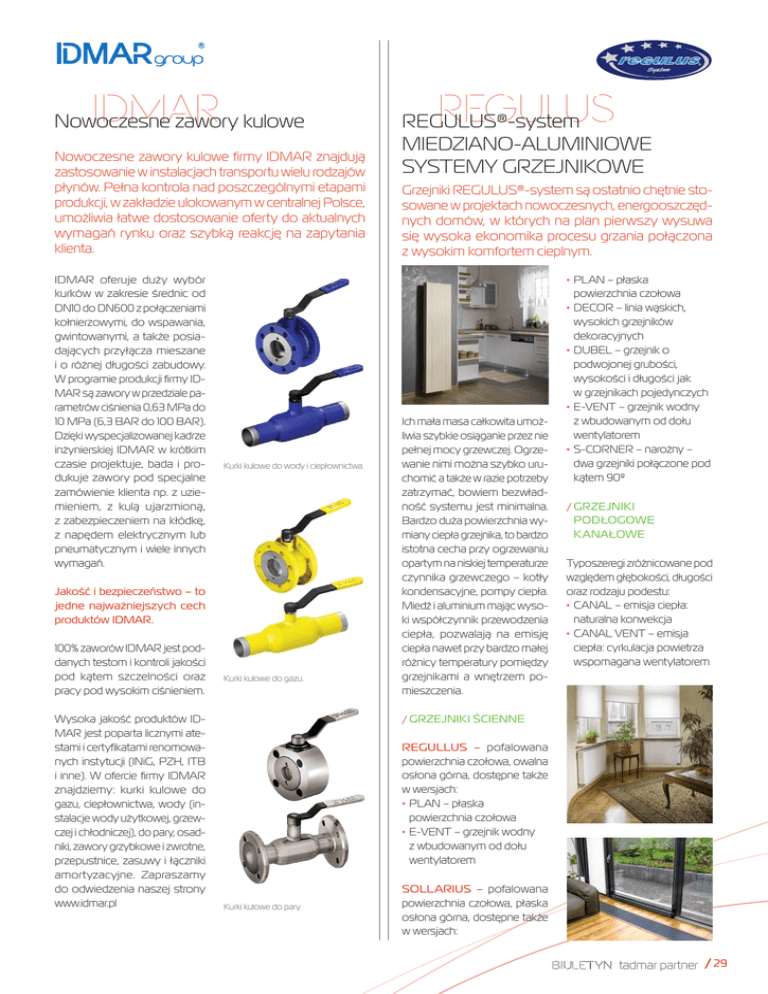 IDMAR Nowoczesne zawory kulowe Nowoczesne zawory kulowe firmy IDMAR znajdują zastosowanie w instalacjach transportu wielu rodzajów płynów. Pełna kontrola nad poszczególnymi etapami produkcji, w zakładzie ulokowanym w centralnej Polsce, umożliwia łatwe dostosowanie oferty do aktualnych wymagań rynku oraz szybką reakcję na zapytania klienta. IDMAR oferuje duży wybór kurków w zakresie średnic od DN10 do DN600 z połączeniami kołnierzowymi, do wspawania, gwintowanymi, a także posiadających przyłącza mieszane i o różnej długości zabudowy. W programie produkcji firmy IDMAR są zawory w przedziale parametrów ciśnienia 0,63 MPa do 10 MPa (6,3 BAR do 100 BAR). Dzięki wyspecjalizowanej kadrze inżynierskiej IDMAR w krótkim czasie projektuje, bada i produkuje zawory pod specjalne zamówienie klienta np. z uziemieniem, z kulą ujarzmioną, z zabezpieczeniem na kłódkę, z napędem elektrycznym lub pneumatycznym i wiele innych wymagań. Kurki kulowe do wody i ciepłownictwa. Jakość i bezpieczeństwo – to jedne najważniejszych cech produktów IDMAR. 100% zaworów IDMAR jest poddanych testom i kontroli jakości pod kątem szczelności oraz pracy pod wysokim ciśnieniem. Wysoka jakość produktów IDMAR jest poparta licznymi atestami i certyfikatami renomowanych instytucji (INiG, PZH, ITB i inne). W ofercie firmy IDMAR znajdziemy: kurki kulowe do gazu, ciepłownictwa, wody (instalacje wody użytkowej, grzewczej i chłodniczej), do pary, osadniki, zawory grzybkowe i zwrotne, przepustnice, zasuwy i łączniki amortyzacyjne. Zapraszamy do odwiedzenia naszej strony www.idmar.pl Kurki kulowe do gazu. REGULUS REGULUS®-system MIEDZIANO-ALUMINIOWE SYSTEMY GRZEJNIKOWE Grzejniki REGULUS®-system są ostatnio chętnie stosowane w projektach nowoczesnych, energooszczędnych domów, w których na plan pierwszy wysuwa się wysoka ekonomika procesu grzania połączona z wysokim komfortem cieplnym. Ich mała masa całkowita umożliwia szybkie osiąganie przez nie pełnej mocy grzewczej. Ogrzewanie nimi można szybko uruchomić a także w razie potrzeby zatrzymać, bowiem bezwładność systemu jest minimalna. Bardzo duża powierzchnia wymiany ciepła grzejnika, to bardzo istotna cecha przy ogrzewaniu opartym na niskiej temperaturze czynnika grzewczego – kotły kondensacyjne, pompy ciepła. Miedź i aluminium mając wysoki współczynnik przewodzenia ciepła, pozwalają na emisję ciepła nawet przy bardzo małej różnicy temperatury pomiędzy grzejnikami a wnętrzem pomieszczenia. ·· PLAN – płaska powierzchnia czołowa ·· DECOR – linia wąskich, wysokich grzejników dekoracyjnych ·· DUBEL – grzejnik o podwojonej grubości, wysokości i długości jak w grzejnikach pojedynczych ·· E-VENT – grzejnik wodny z wbudowanym od dołu wentylatorem ·· S-CORNER – narożny – dwa grzejniki połączone pod kątem 90º //GRZEJNIKI PODŁOGOWE KANAŁOWE Typoszeregi zróżnicowane pod względem głębokości, długości oraz rodzaju podestu: ·· CANAL – emisja ciepła: naturalna konwekcja ·· CANAL VENT – emisja ciepła: cyrkulacja powietrza wspomagana wentylatorem //GRZEJNIKI ŚCIENNE REGULLUS – pofalowana powierzchnia czołowa, owalna osłona górna, dostępne także w wersjach: ·· PLAN – płaska powierzchnia czołowa ·· E-VENT – grzejnik wodny z wbudowanym od dołu wentylatorem Kurki kulowe do pary. SOLLARIUS – pofalowana powierzchnia czołowa, płaska osłona górna, dostępne także w wersjach: tadmar partner / 29