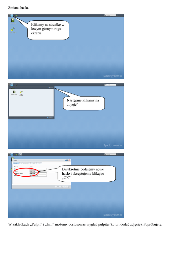 Zmiana hasła. Klikamy na strzałkę w lewym górnym rogu ekranu Następnie klikamy na „opcje” Dwukrotnie podajemy nowe hasło i akceptujemy klikając „OK” W zakładkach „Pulpit” i „Inni” możemy dostosować wygląd pulpitu (kolor, dodać zdjęcie). Popróbujcie.